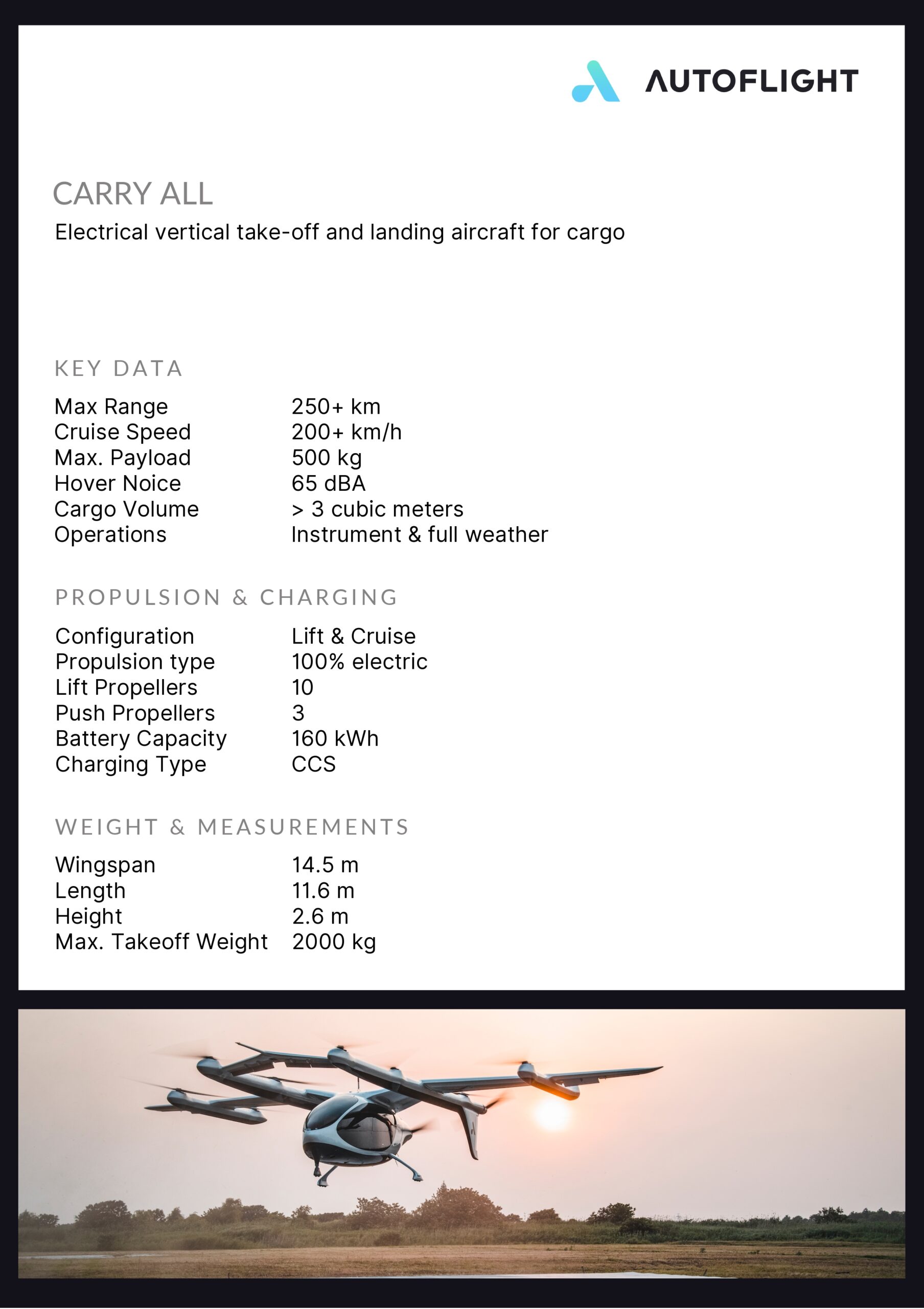 CarryAll aduce o inovație în tehnologia eVTOL pentru ridicare grea, având o greutate maximă la decolare de două tone, o capacitate de încărcare de 400 kg, o viteză de croazieră de ±200 km/h și o autonomie de ±200 km.