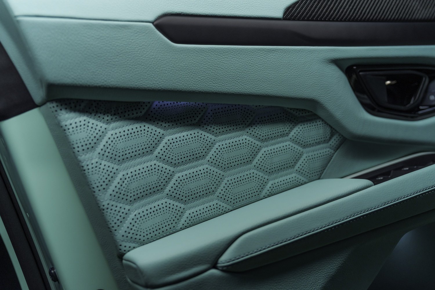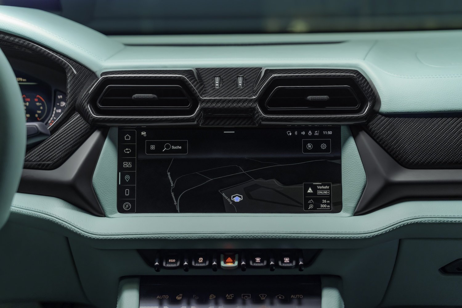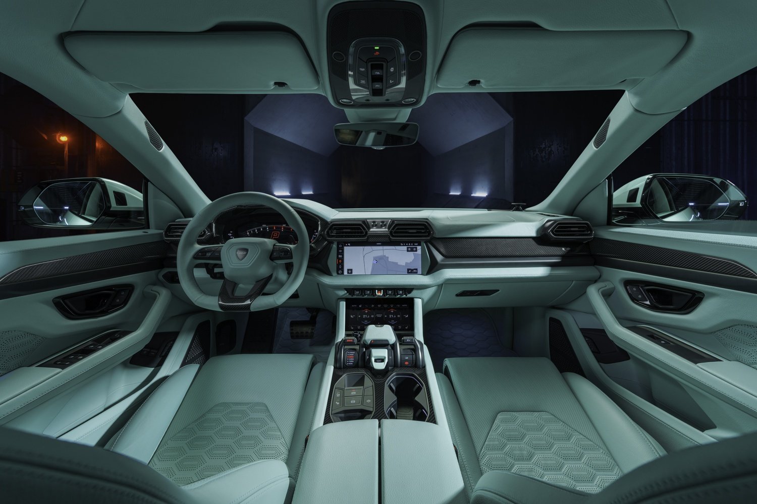 - Elemente din fibră de carbon expusă pe bord, uși și consolă centrală