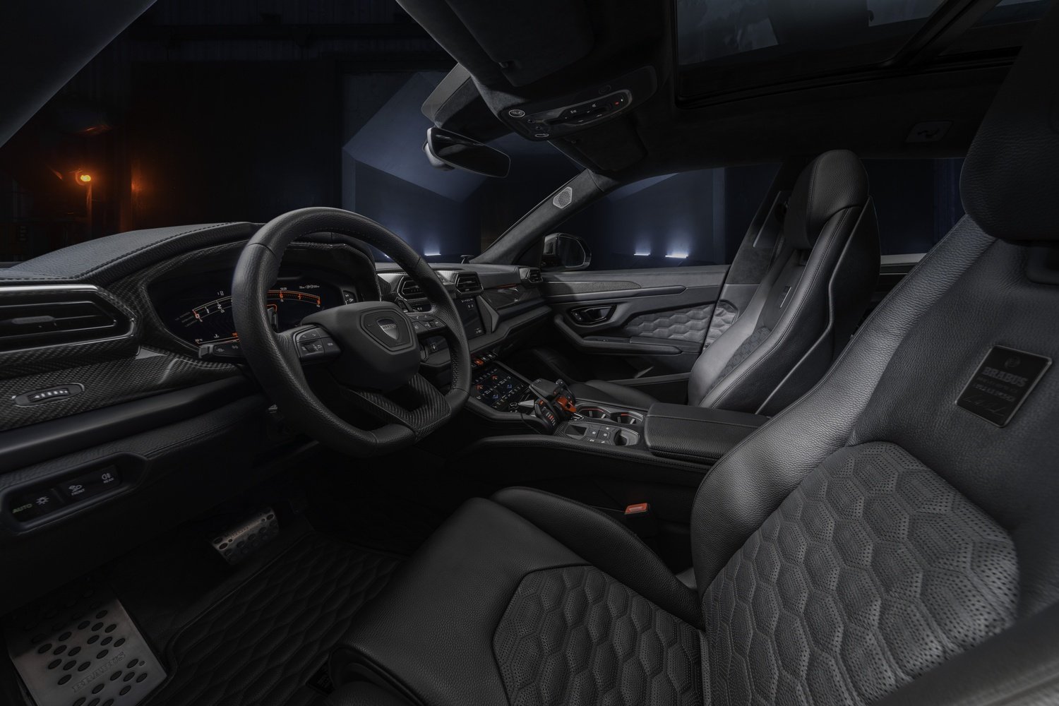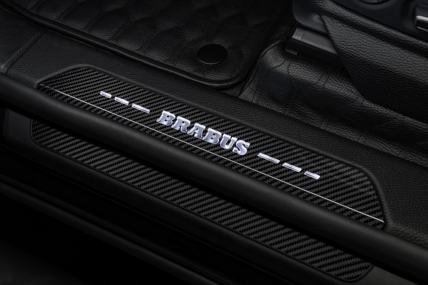 - Pedale și suport de picior din aluminiu, alături de praguri iluminate cu logo BRABUS