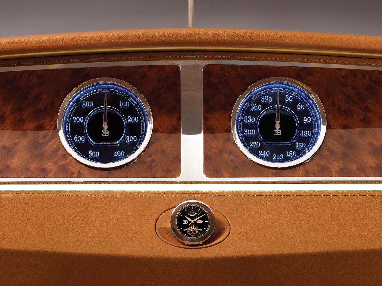 Volanul și padelele sunt inspirate de Veyron, tapițeria din piele naturală este impecabilă, iar consola centrală combină lemn lustruit, aluminiu și piele țesută. Cel mai faimos element: un ceas Parmigiani Fleurier Tourbillon de 100.000 $ integrat în bord – se rotește, se detașează și poate fi purtat la mână.