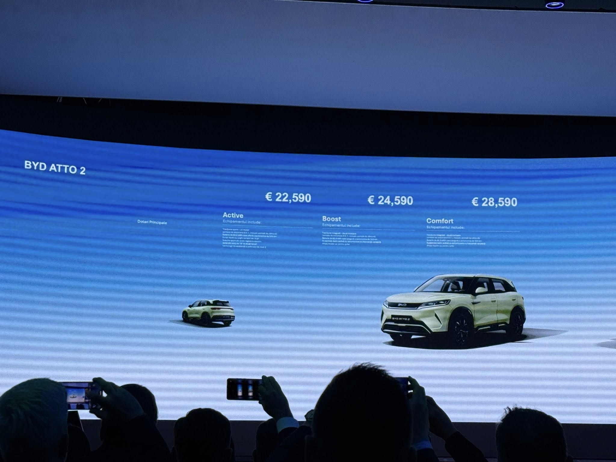 - Noul crossover BYD Atto 2 (177 CP cu tracțiune față, baterie de 45.12 kWh, autonomie în ciclu WLTP de până la 312 km sau 463 km prin oraș cu viteză redusă).