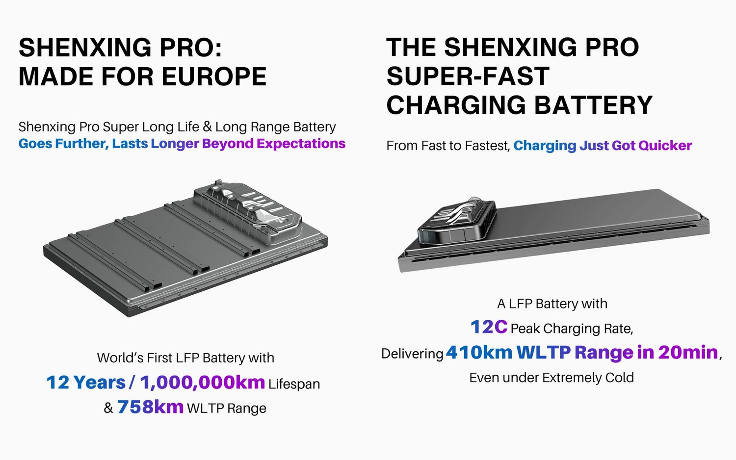 - Shenxing Pro Super Long Life & Long Range Battery este prima baterie cu o chimie LFP care poate oferi o autonomie de până la 758 km (WLTP). Are o capacitate de 112 kWh. Durata de viață îi este, de asemenea, record – 12 ani sau 1.000.000 km, cu o degradare de doar 9% după primii 200.000 km. Conform CATL este ideală pentru piețele de leasing europene.