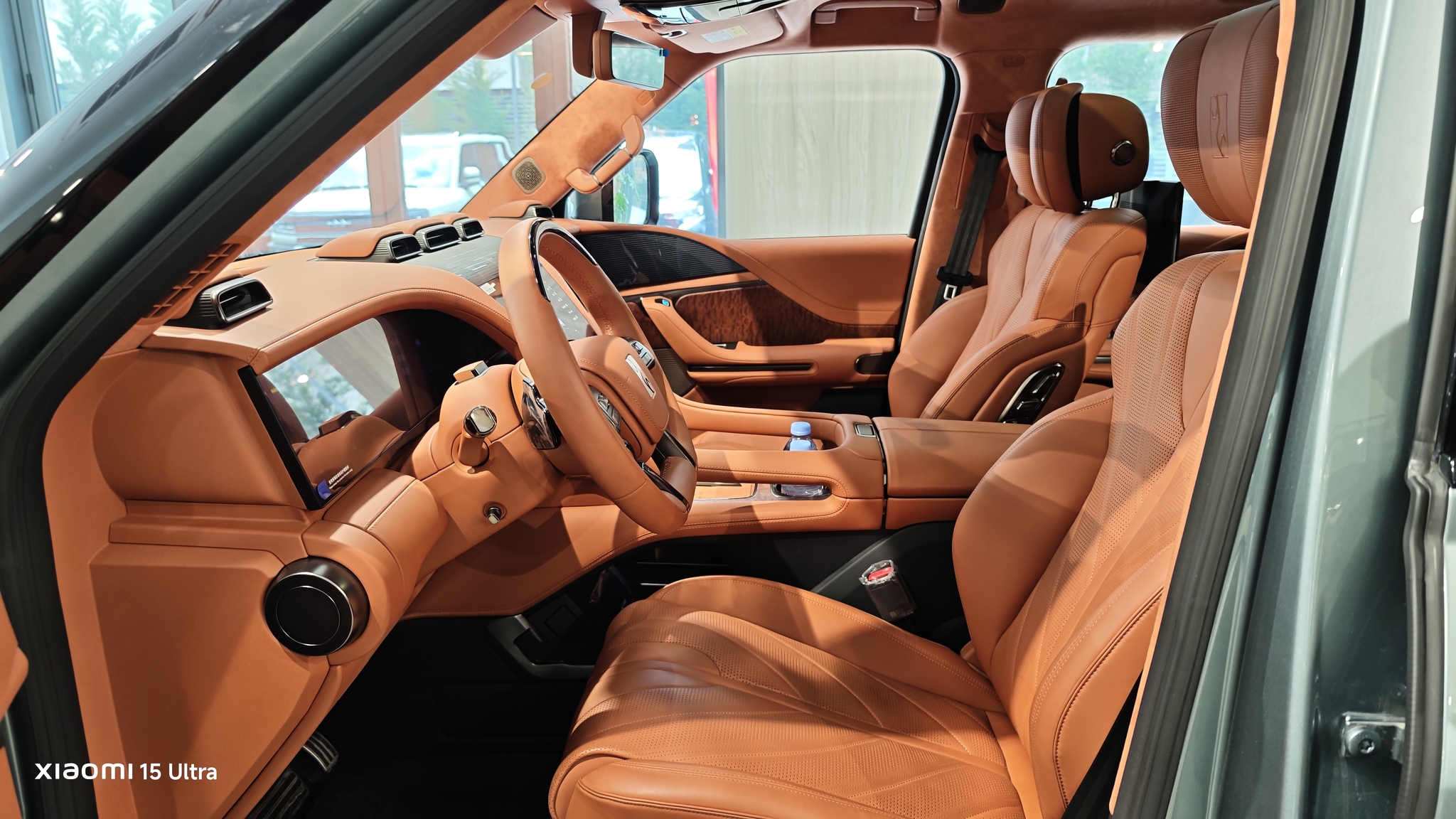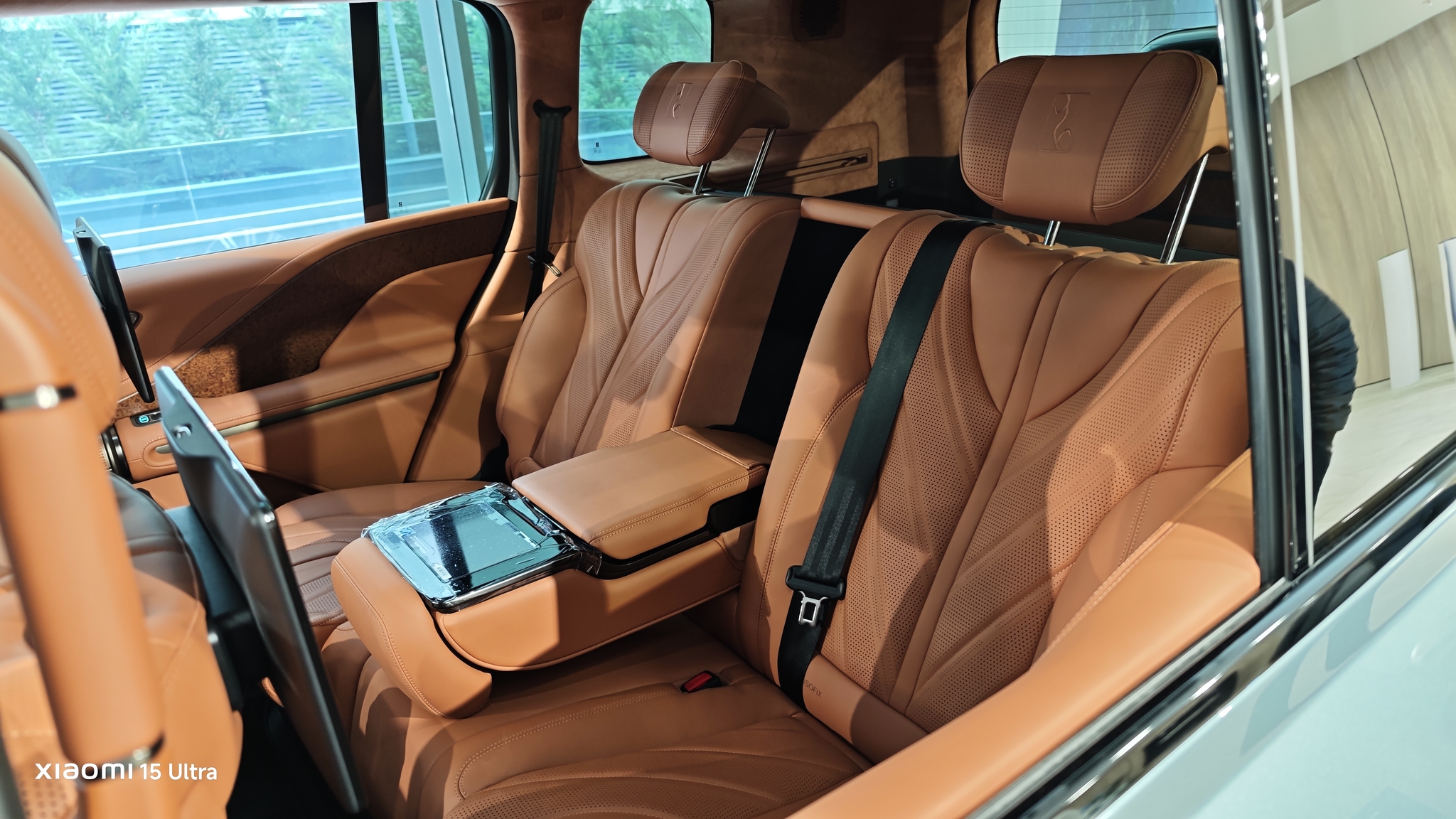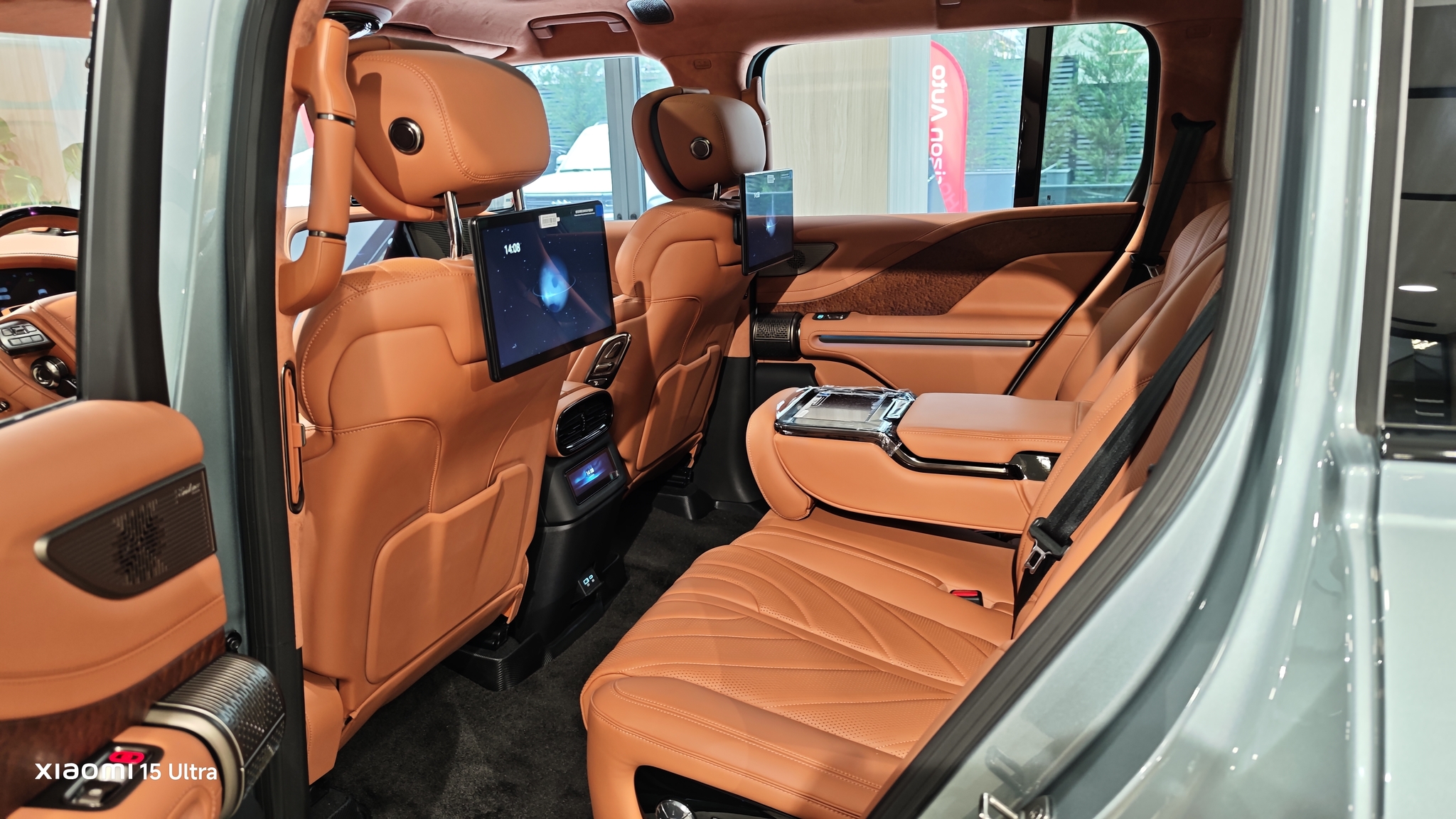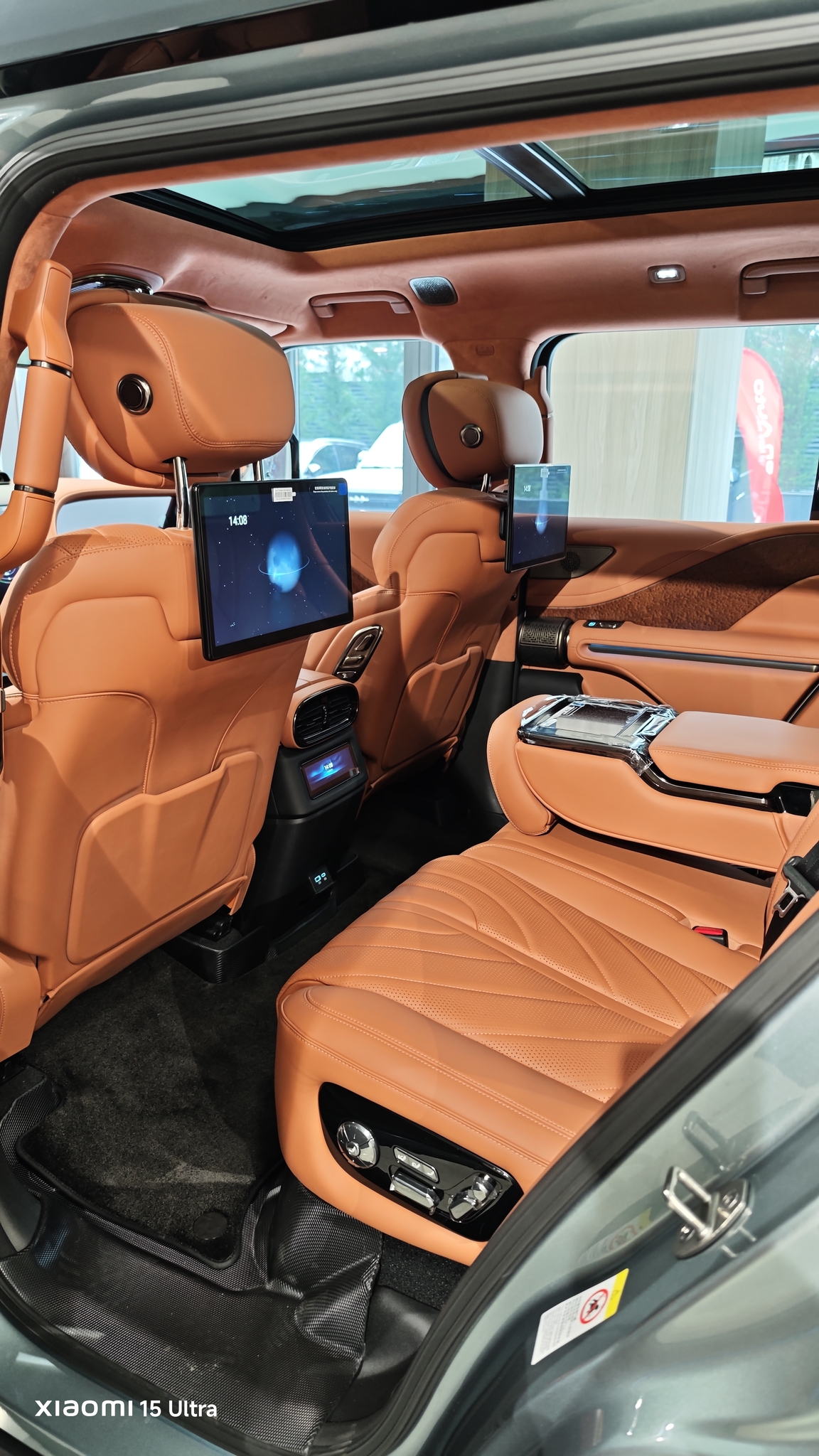 Spatiul este generos, iar dotările includ frigider în cotieră, uși cu închidere soft-close și inserții din lemn natural. Pasagerii din spate au propriile ecrane pentru climatizare și divertisment, cu posibilitatea de a instala aplicații sau de a aplica filtre pe camerele video – un detaliu distractiv!