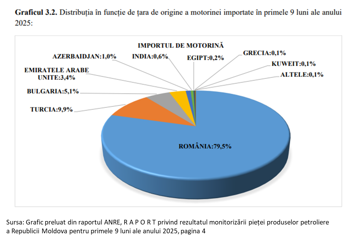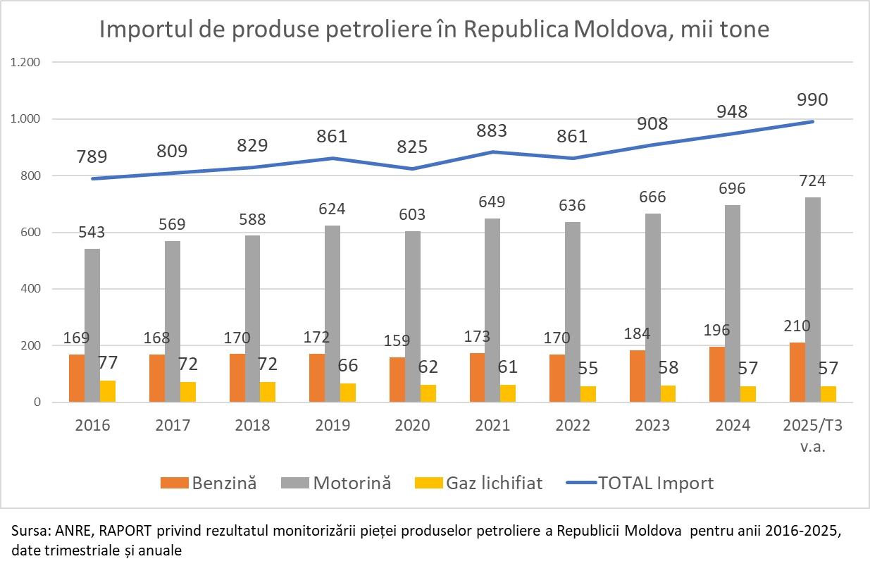 Moldova consumă de peste trei ori mai multă motorină decât benzină, ceea ce înseamnă că orice perturbare a pieței lovește direct acest segment. În ultimii ani, importurile totale de produse petroliere s-au apropiat de un milion de tone, din care motorina reprezintă peste 700.000 de tone, iar benzina peste 200.000 de tone.