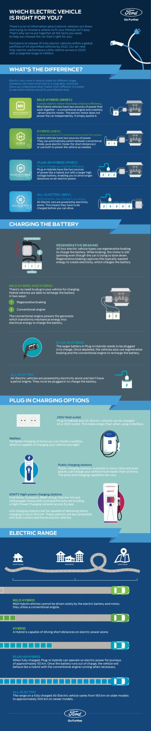 Viitoarele modele complet electrice Ford vor beneficia de următoarea generație a sistemelor de conectivitate, acest lucru oferindu-le acces la actualizări over-the-air. Compania se află, de asemenea, într-o etapă avansată în procesul de punere la punct a unor soluții pentru clienții care vor alege mașini electrice. Ford este membru fondator al consorțiului IONITY, care are ca obiectiv instalarea a 400 de stații de încărcare în zone-cheie ale Europei până în 2020, cu o putere de încărcare de 350 kW. Acest lucru permite o reducere semnificativă a timpului de încărcare în comparație cu sistemele disponibile la ora actuală.