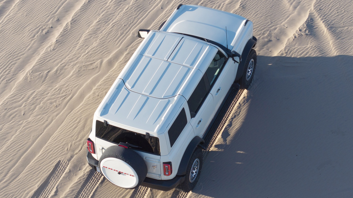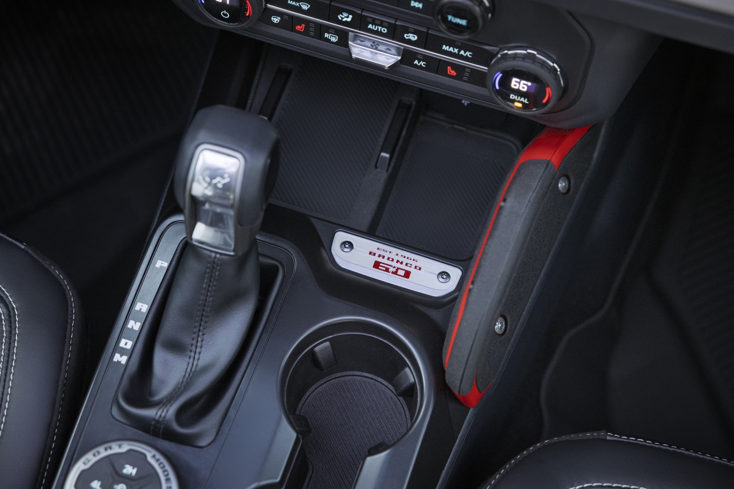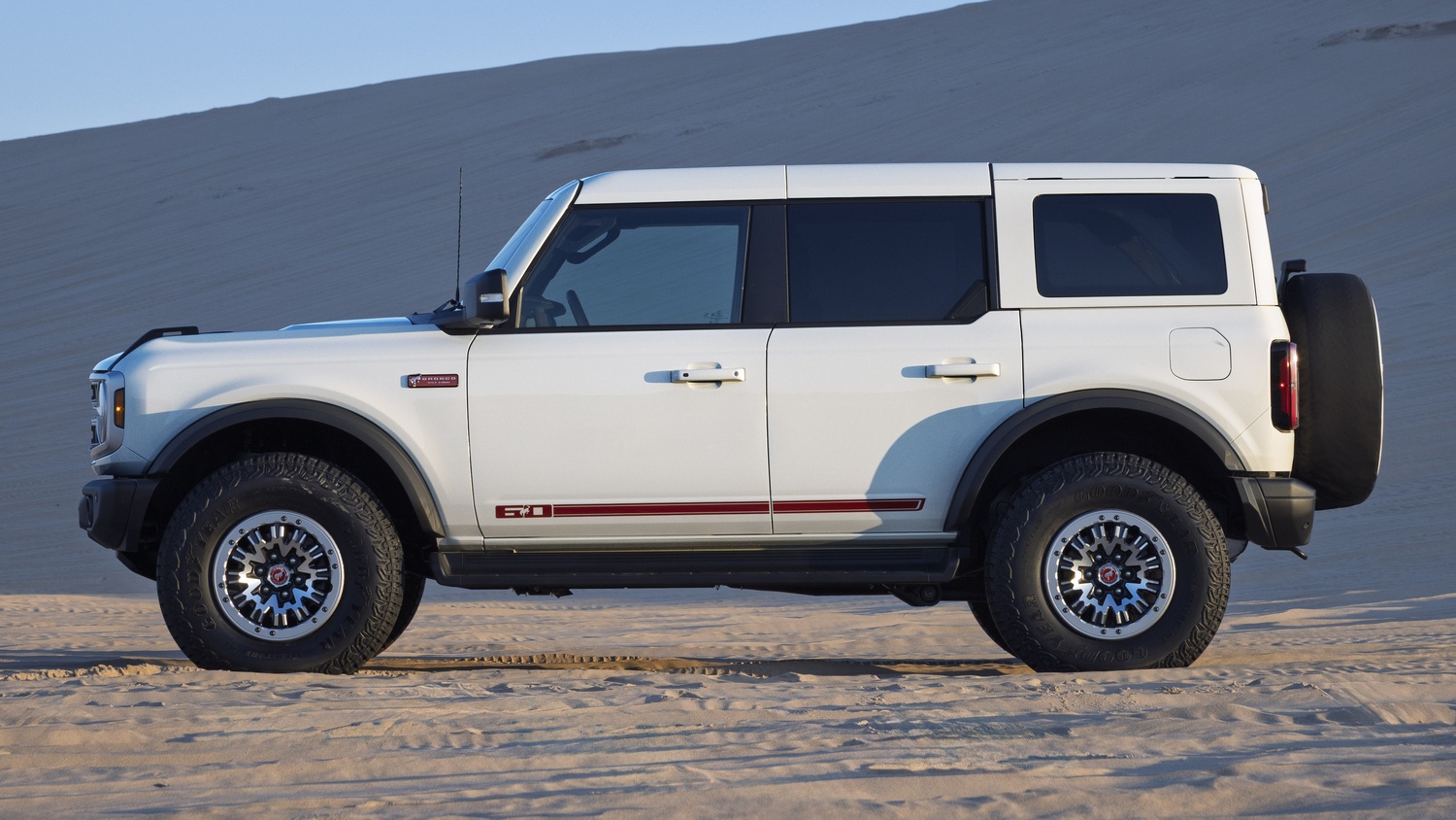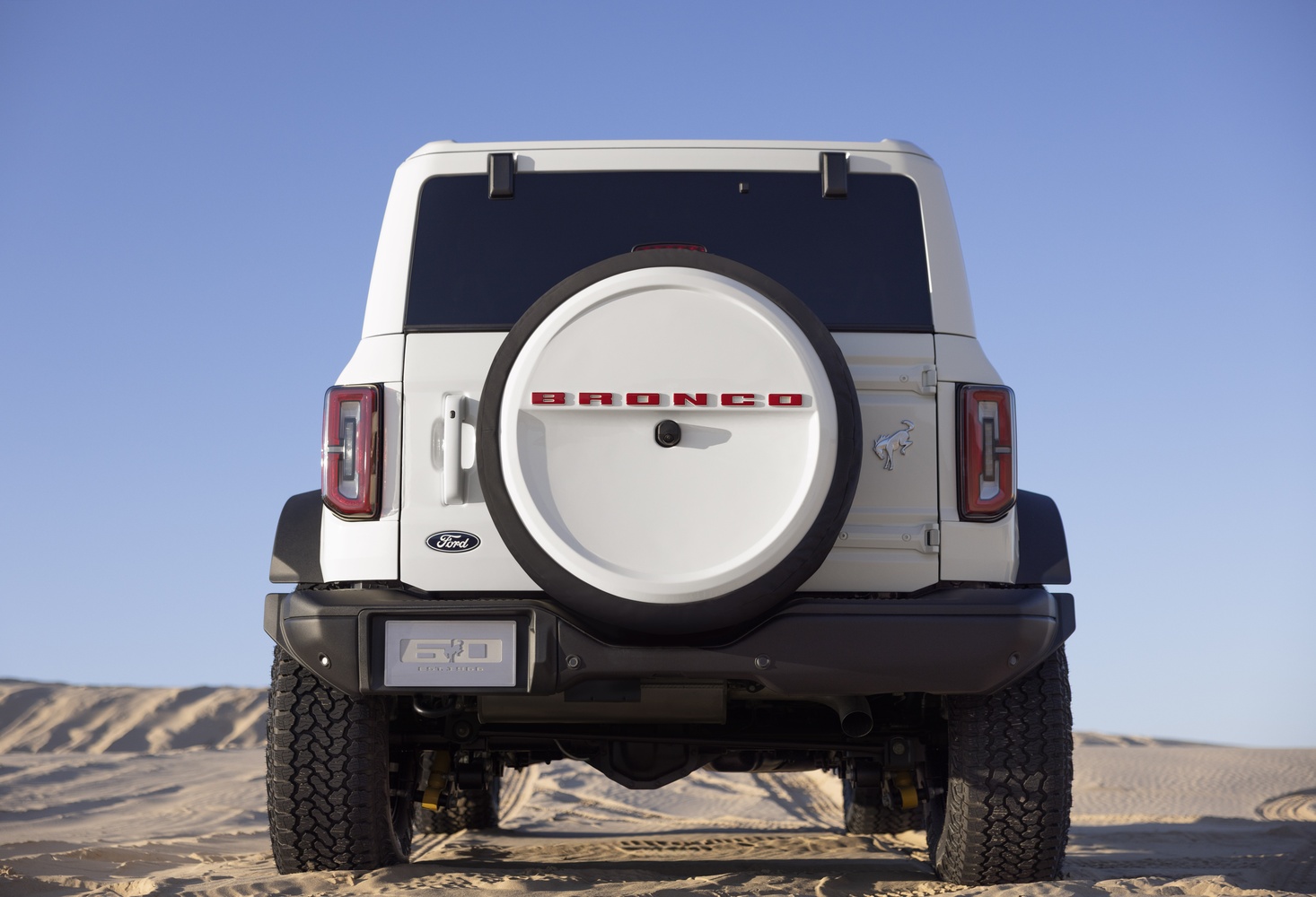 Anvelopele rugged terrain Goodyear de 35 de inchi sunt montate pe jante unice de 17 inchi din aliaj. Au un finisaj Gravity Gray și capace centrale în Vermilion Red care poartă logoul Bucking Bronco și anul „1966”, un omagiu clar adus primului Bronco.