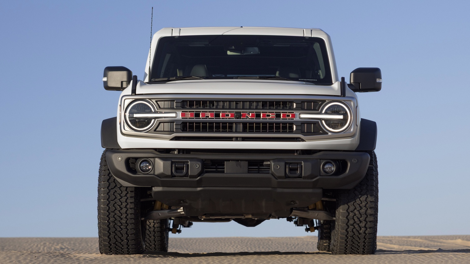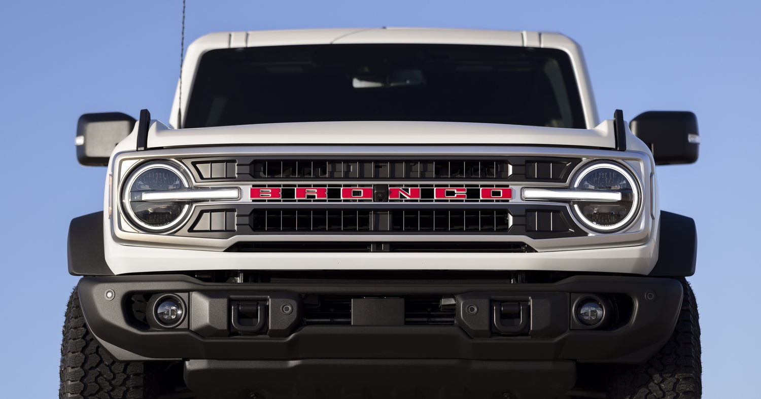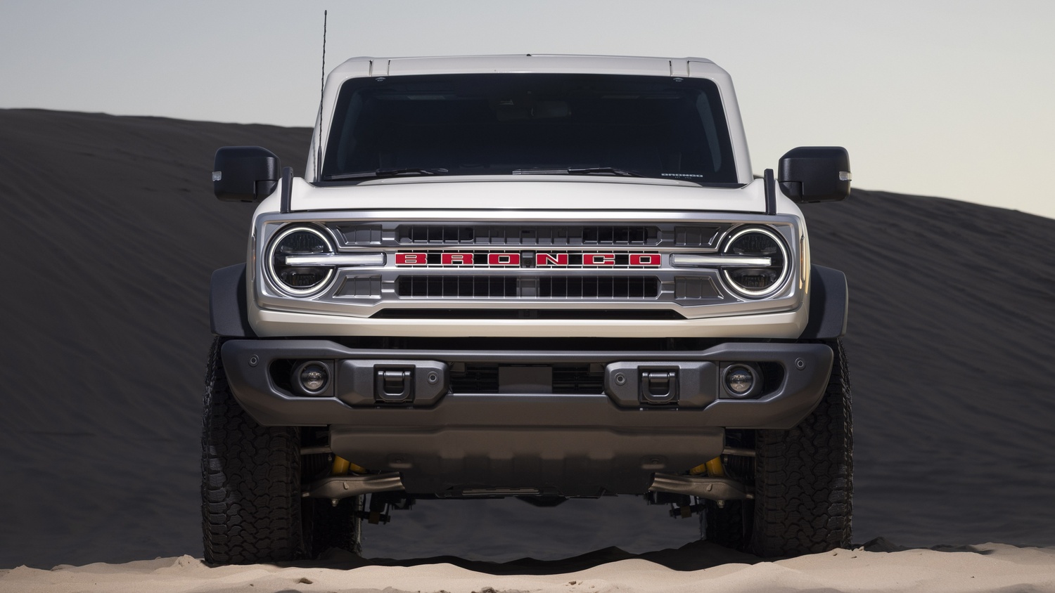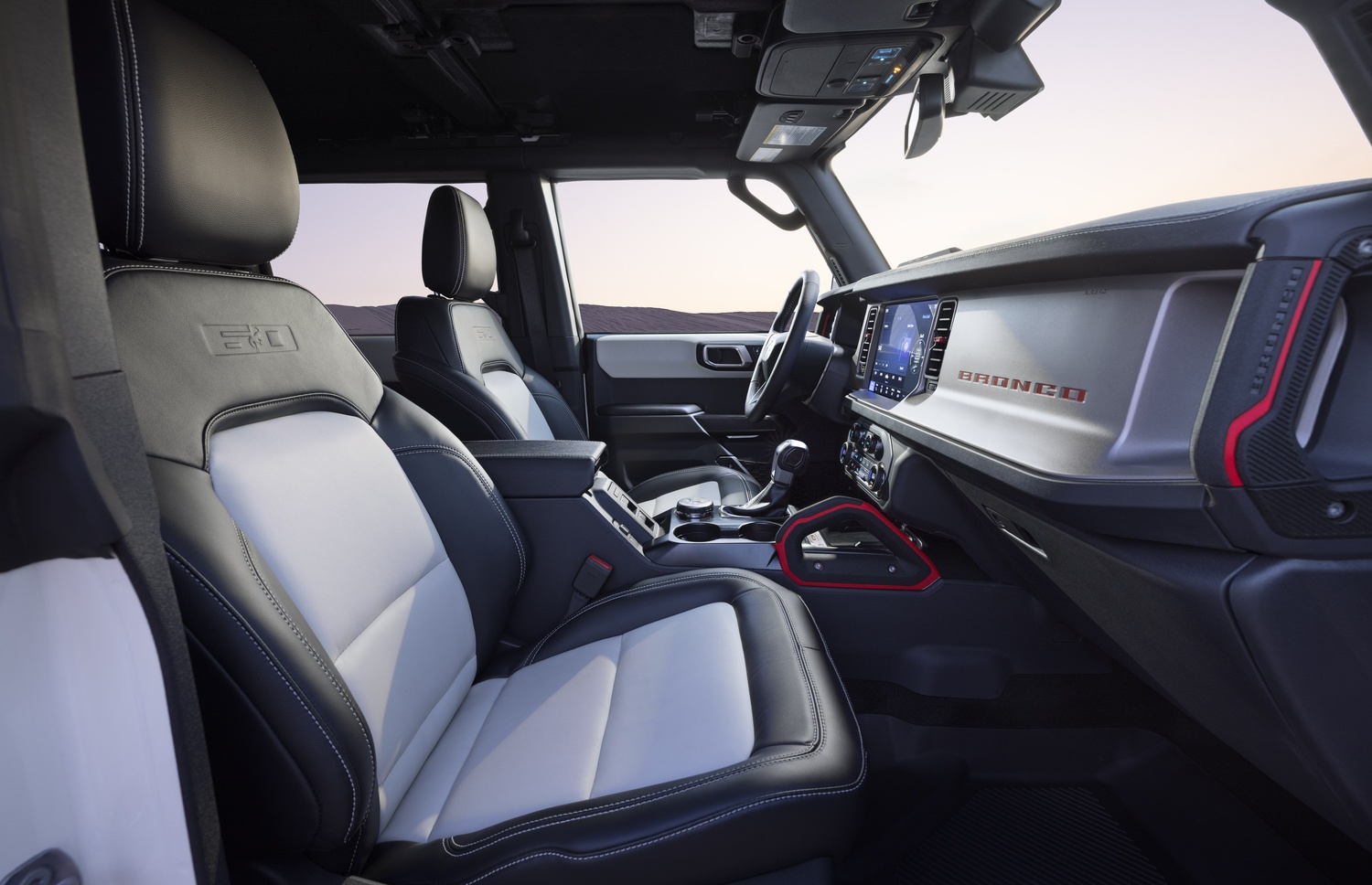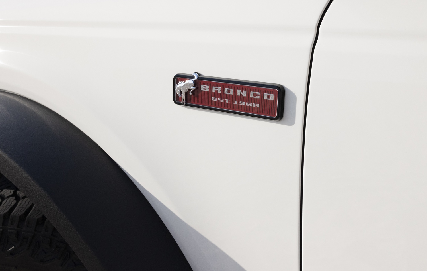 Grila de radiator redesenată preia inspirația din cea a modelului original, fiind vopsită în Warm Alloy și decorată cu litere „BRONCO” în Vermilion Red. Culoarea istorică Wimbledon White, folosită pe primele Bronco, este disponibilă cu un acoperiș asortat, în timp ce clienții pot alege un contrast cu un corp Ruby Red și un acoperiș Wimbledon White.