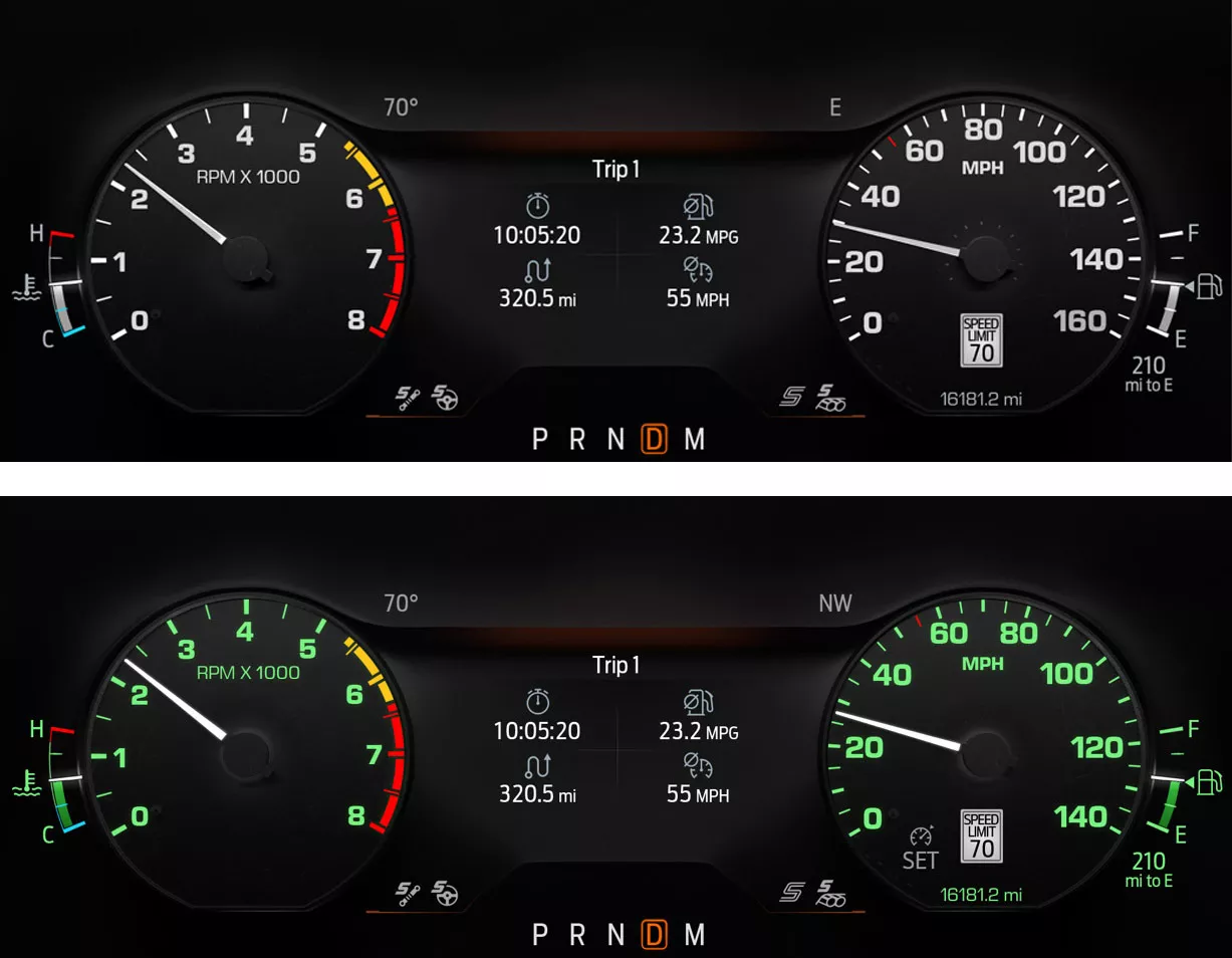Pentru un plus de nostalgie, panoul de bord va propune câteva teme în stil retro. Acestea vor reproduce aspectul instrumentelor de pe modelul Mustang din 1987-1993, cu litere albe care strălucesc verde noaptea.