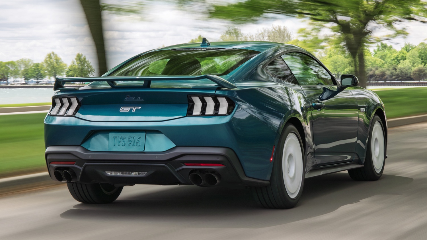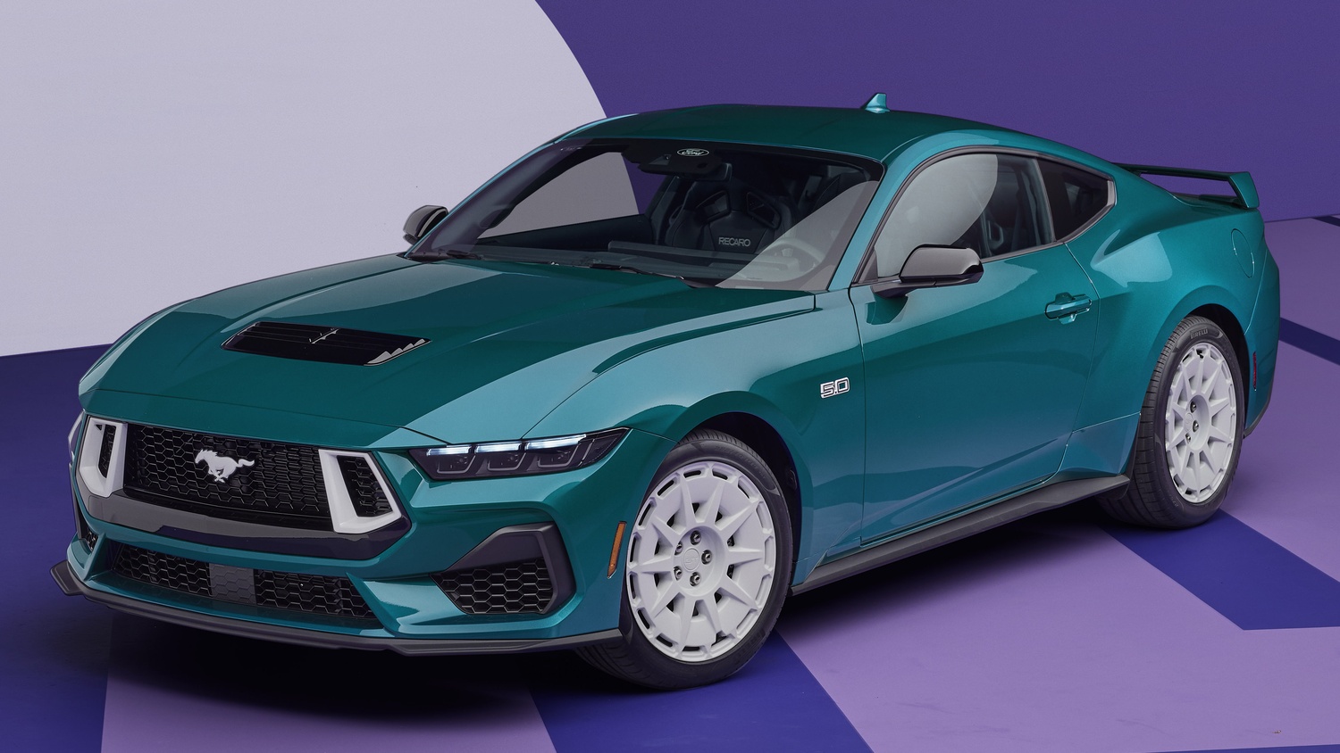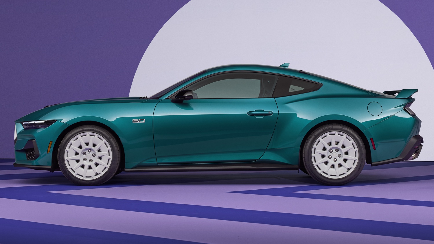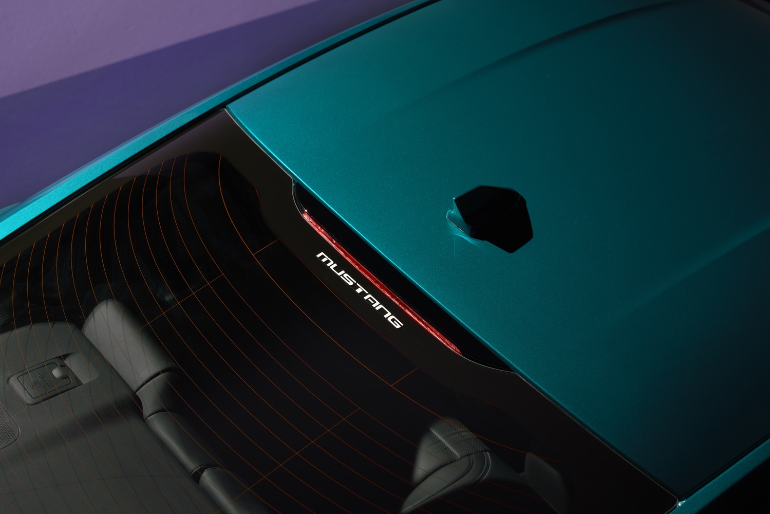 Ambele sunt finisate în mid-gloss Oxford White, cu capace centrale colorate asortate, marcate cu logoul Mustang GT într-un font nou, brevetat de echipa Ford Vehicle Personalization. Același logo apare și pe luneta modelelor coupe, reminiscent al marcajelor de pe Mustangurile din 1987-1993.