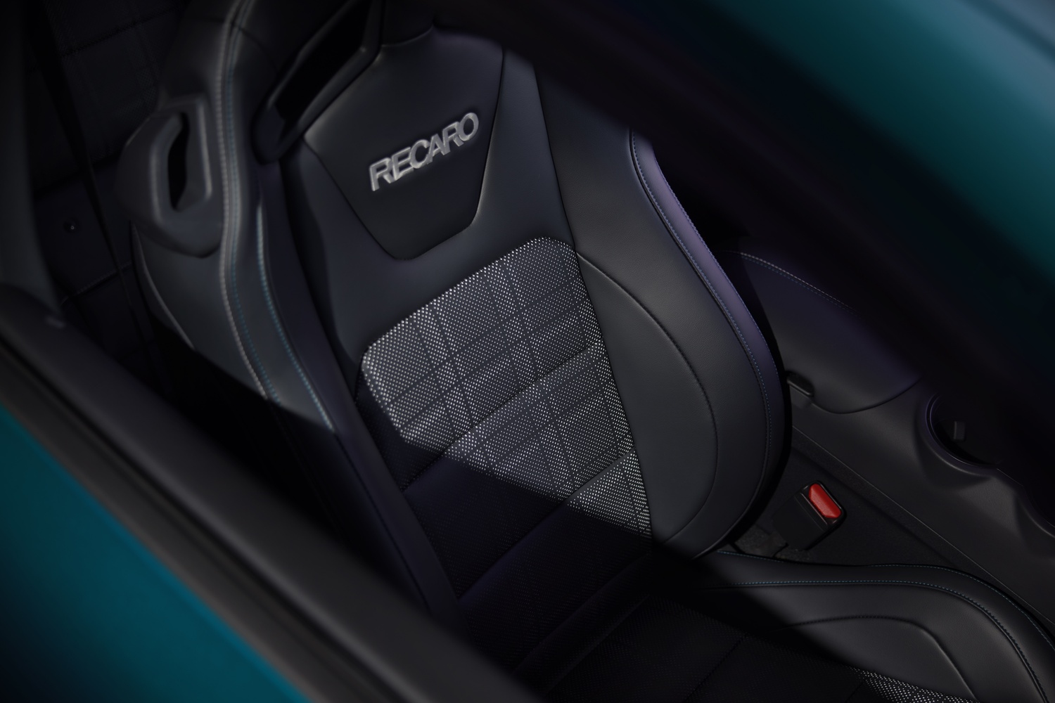 Interiorul reflectă atmosfera anilor 1980 prin tapițeria inspirată de inserțiile în carouri ale scaunelor Fox Body. Pielea perforată cu elemente alb-negru este disponibilă pe scaunele standard și pe cele opționale Recaro sport, exclusive pentru coupe.