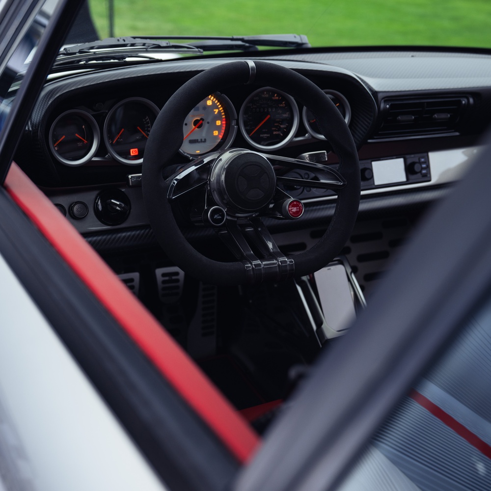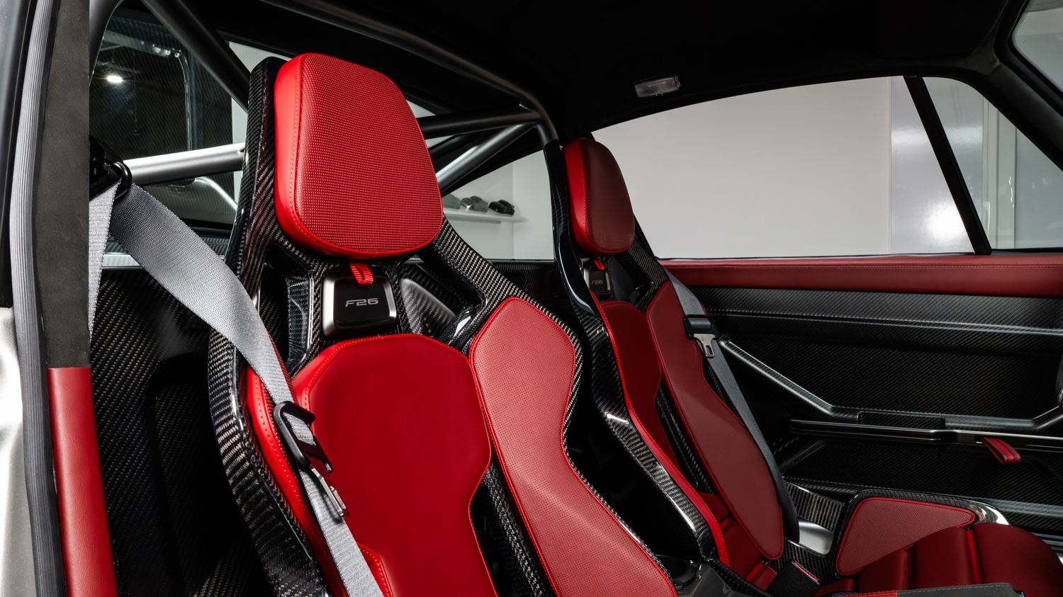 • Ampatamentul prelungit cu 30 mm optimizează centrul de greutate. Interiorul lui F-26 combină funcționalitatea cu meșteșugul, cu fibră de carbon vopsită în culoarea caroseriei pe tunelul Travel Package, podeaua în cinci piese și mid-dash, tapițerie din piele și plafon cu Alcantara. Volanul, inspirat de unghiul aripii unui avion de luptă, are o ramă din fibră de carbon cu componente din aluminiu, fiind fabricat integral in-house. Levierul cutiei de viteze din lemn, un omagiu adus moștenirii Porsche, și ceasurile cu inele în satin stealth completează estetica. Sistemul audio Porsche Classic cu Apple CarPlay adaugă confort modern, iar cușca de protecție în Carmine Red subliniază siguranța.