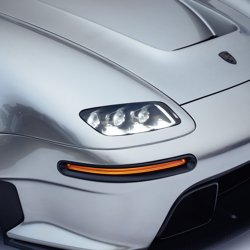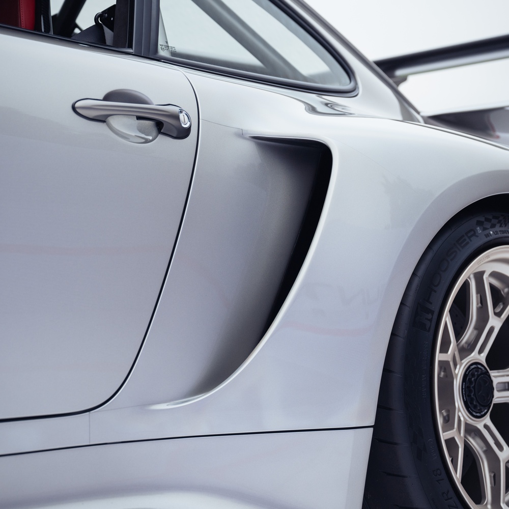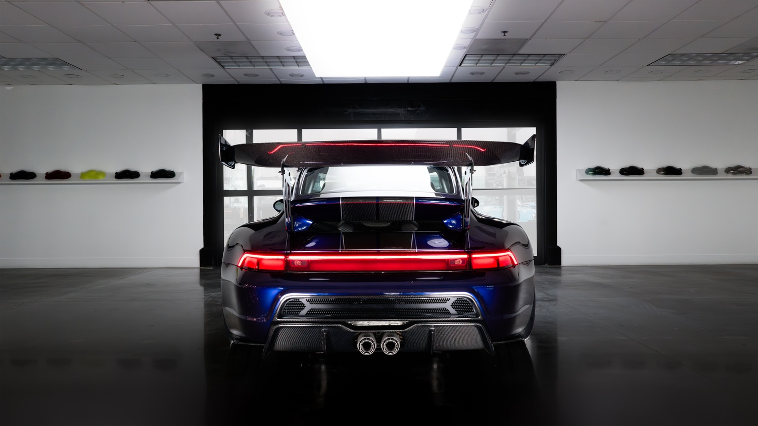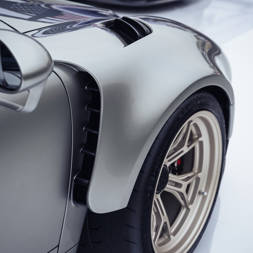 • Caroseria, vopsită într-o nuanță metalizată custom, include: o aripă spate care generează o forță de apăsare ridicată (inspirată de „double wing” al modelului 935), panouri spate cu admisie laterală agresivă, aripă posterioară pătrată și un front Slantnose dramatic.
