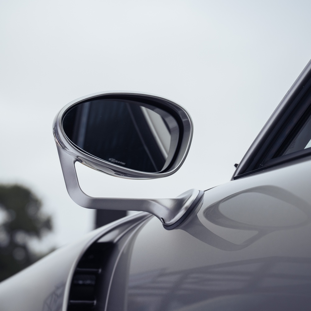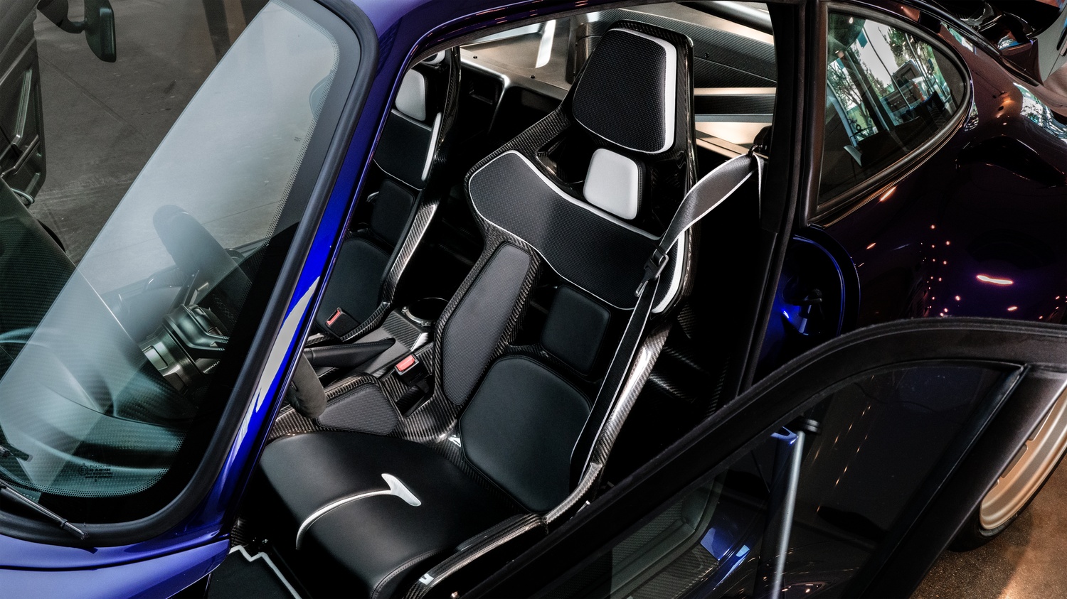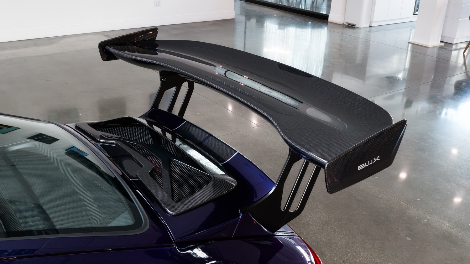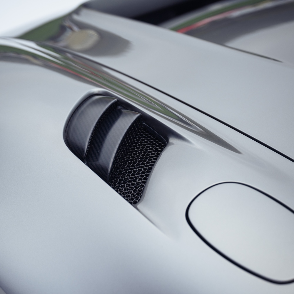 • Caroseria, vopsită într-o nuanță metalizată custom, include: o aripă spate care generează o forță de apăsare ridicată (inspirată de „double wing” al modelului 935), panouri spate cu admisie laterală agresivă, aripă posterioară pătrată și un front Slantnose dramatic.