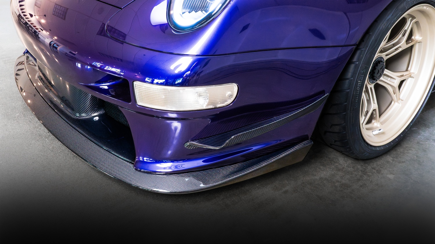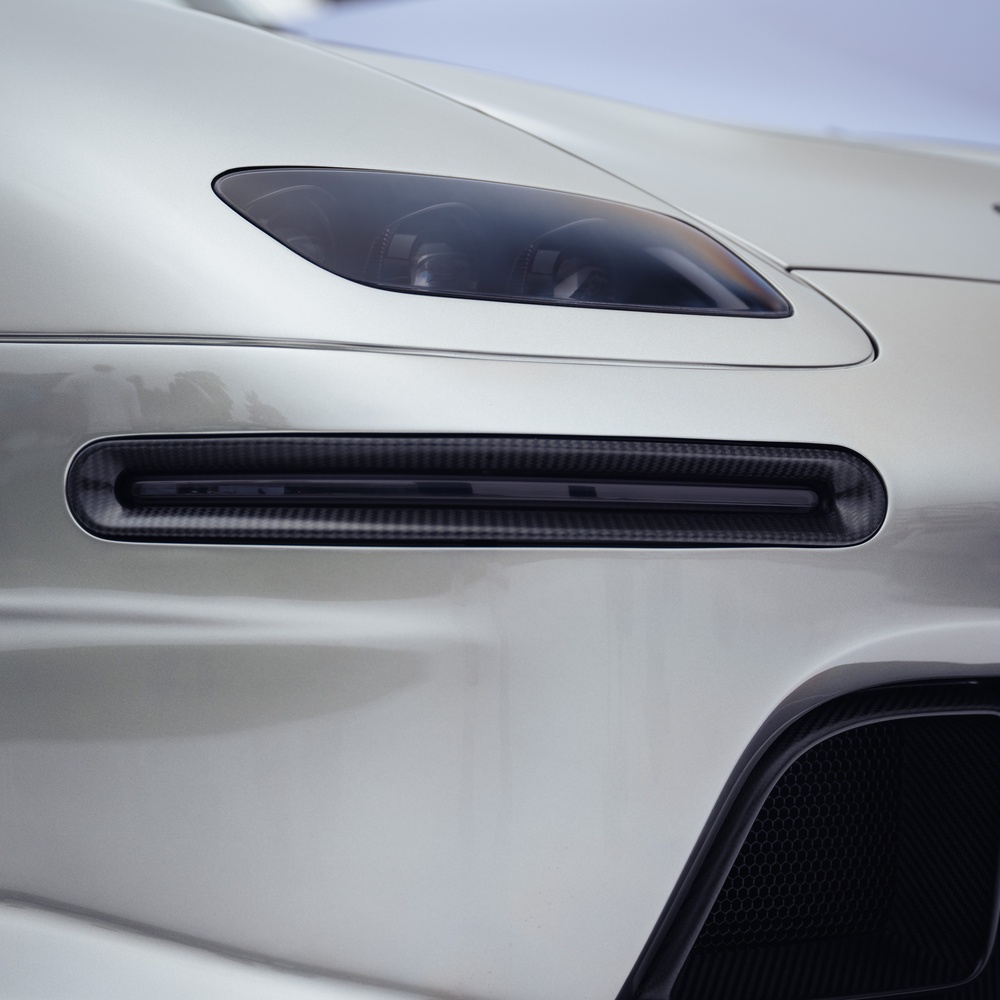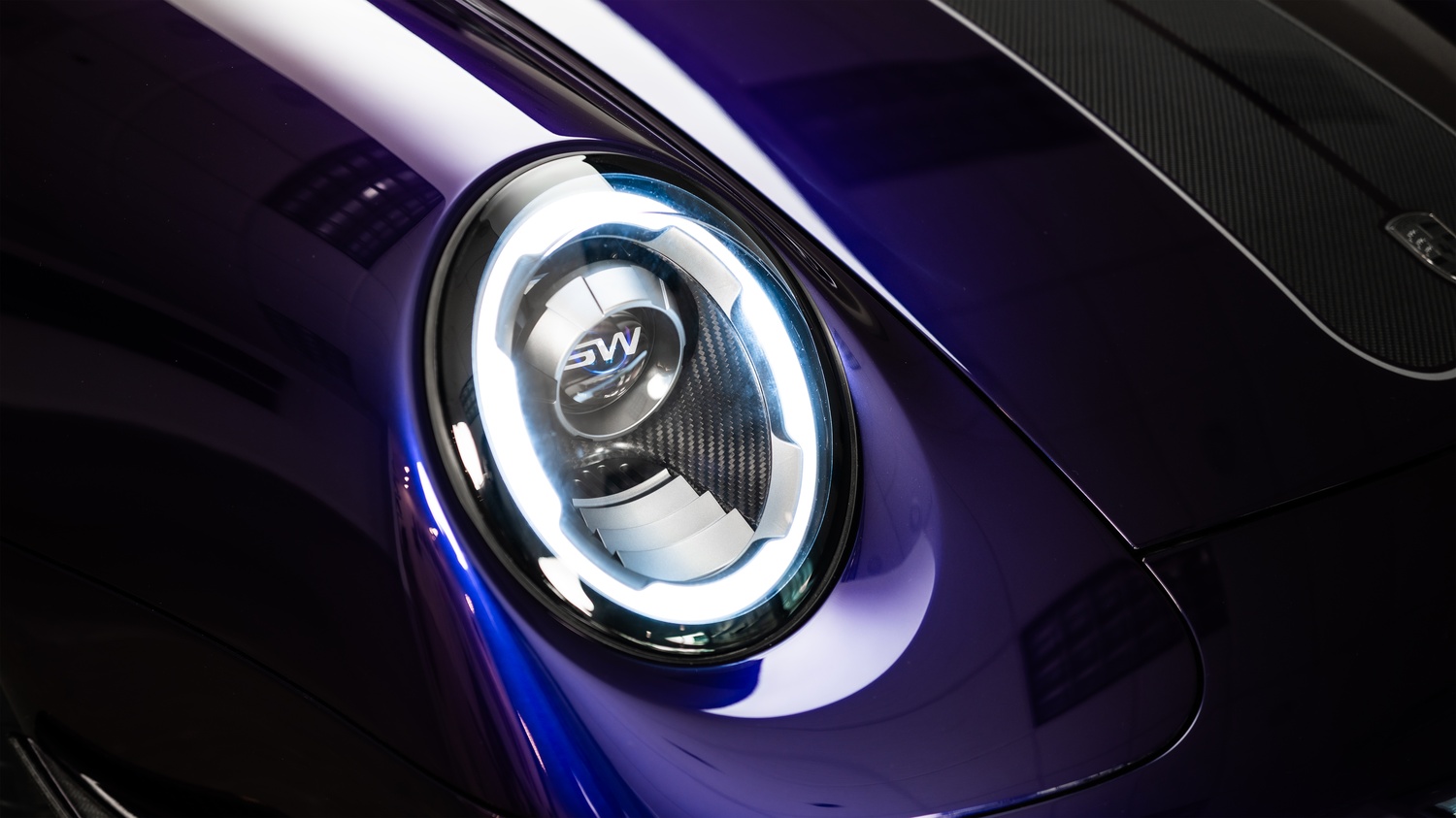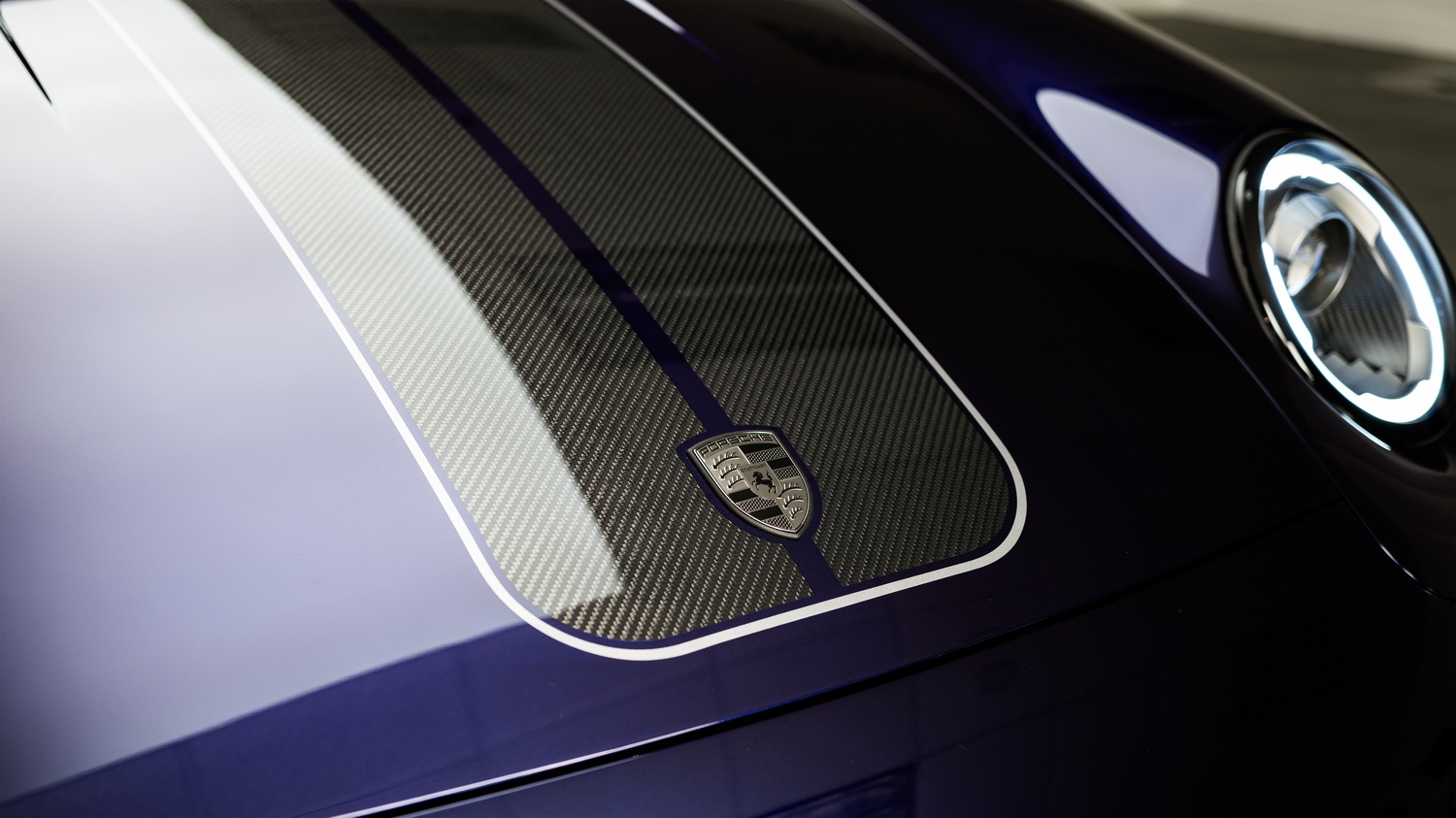 • Caroseria, vopsită într-o nuanță metalizată custom, include: o aripă spate care generează o forță de apăsare ridicată (inspirată de „double wing” al modelului 935), panouri spate cu admisie laterală agresivă, aripă posterioară pătrată și un front Slantnose dramatic.