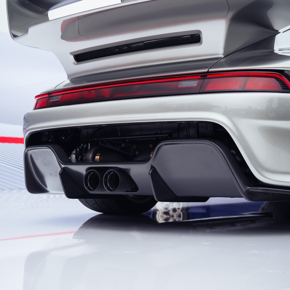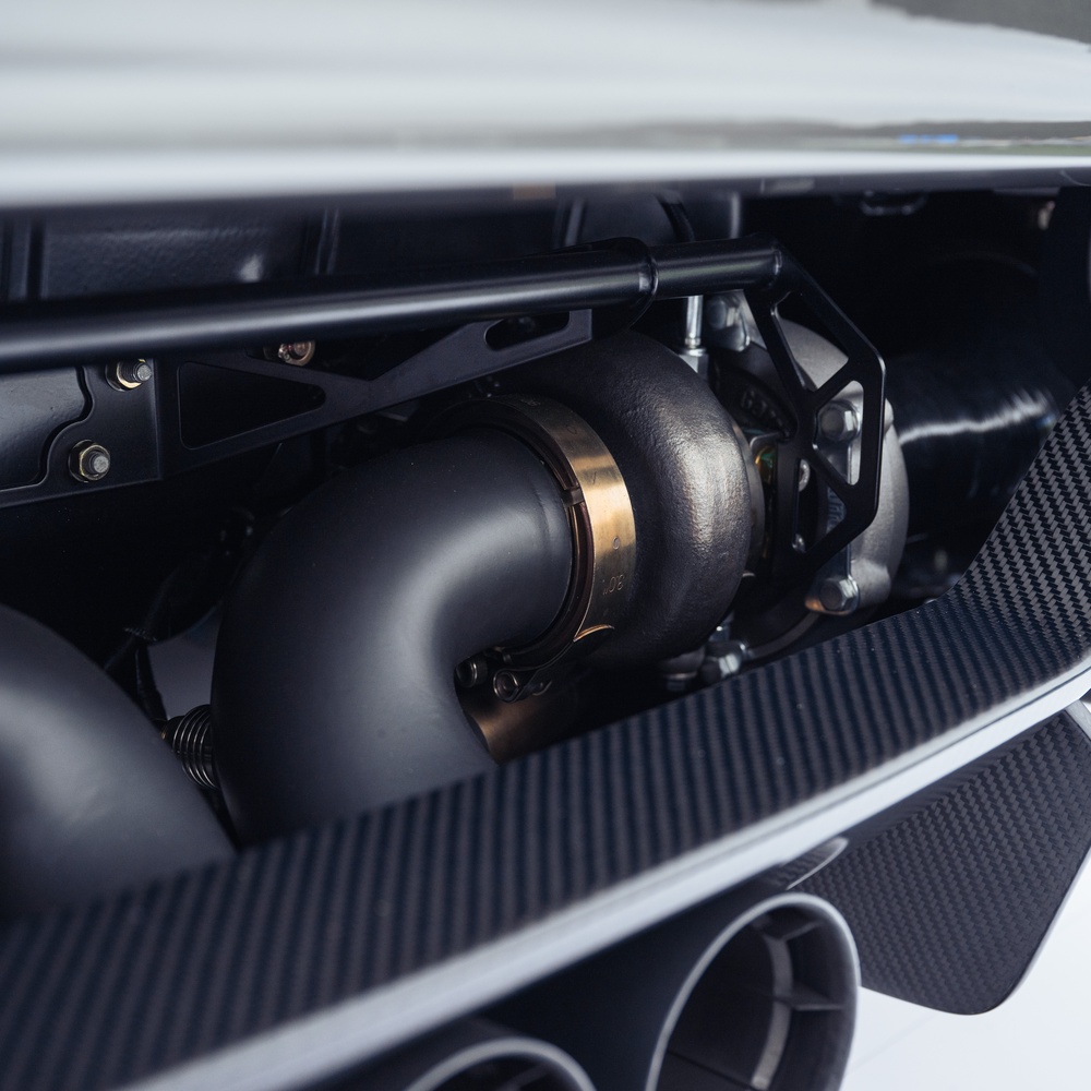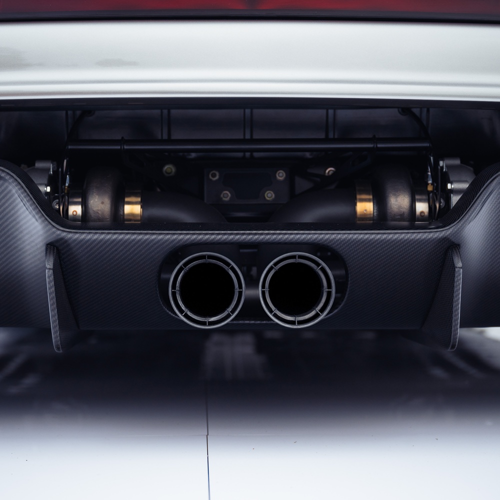 • Un intercooler water-to-air, un airbox din fibră de carbon, un plenum reproiectat și valve blowoff integrate optimizează performanța, iar alimentarea cu etanol cu cifră octanică înaltă, cu mapare adaptivă pentru benzină, maximizează eficiența. Eșapamentul custom în stil 935, cu wastegate-uri externe, oferă un sunet distinctiv, în timp ce conductele de supraalimentare din fibră de carbon asigură un răspuns rapid al turbinelor. Sistemul de lubrifiere cu carter uscat menține motorul în condiții optime.