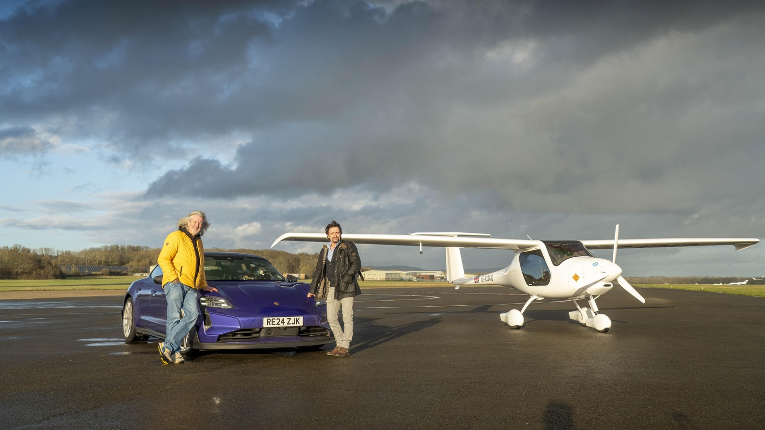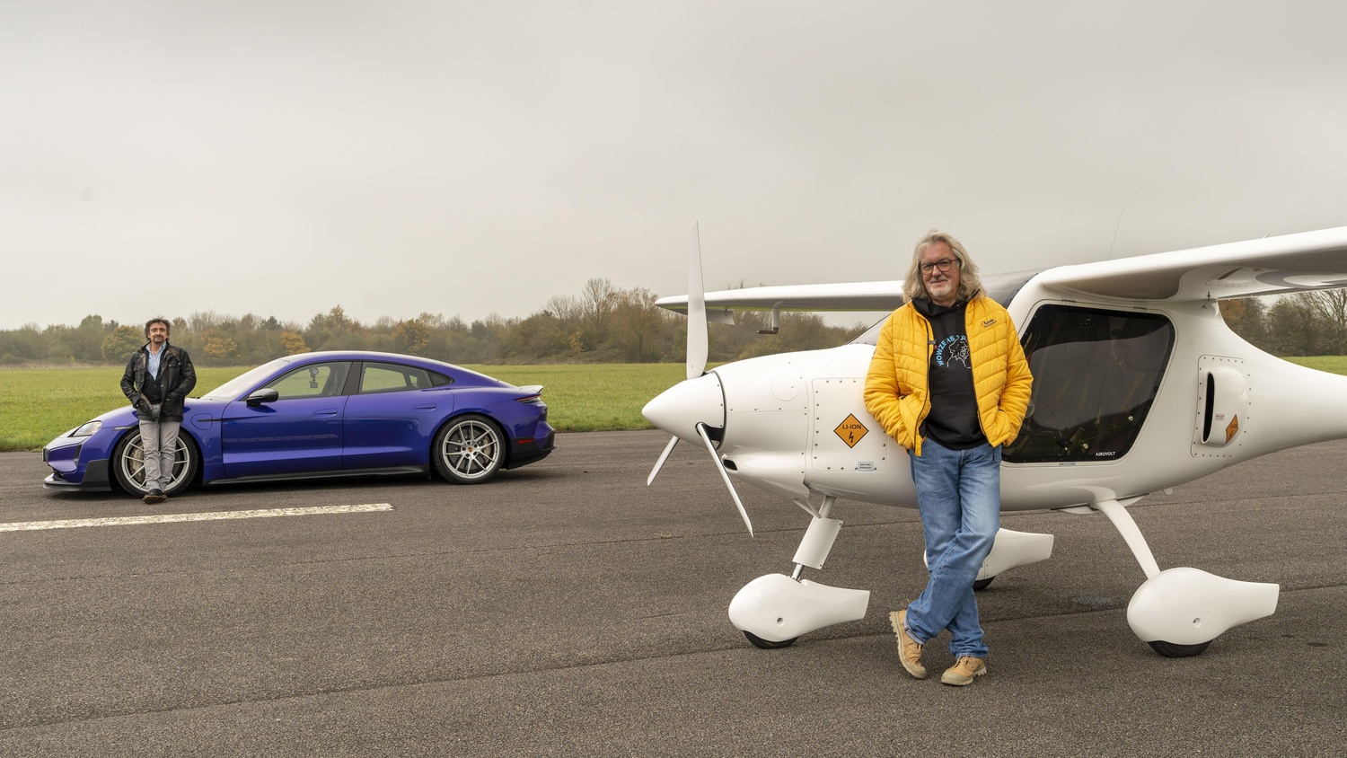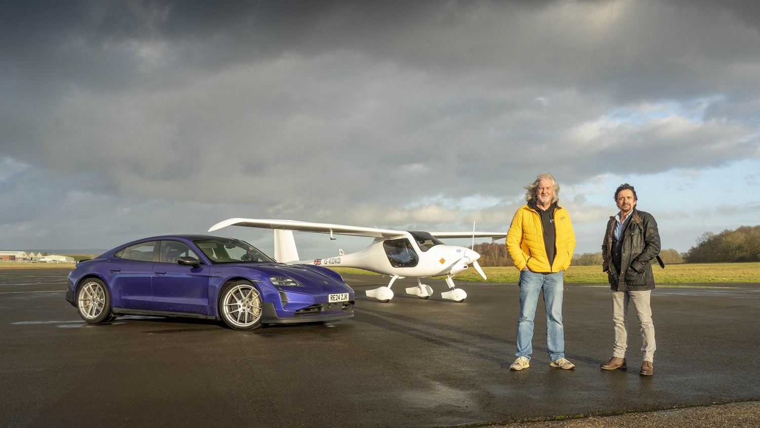 May a pilotat avionul electric Pipistrel Velis Electro, în timp ce Hammond a dezlănțuit puterea lui Porsche Taycan Turbo GT pe drumurile din sudul Angliei.