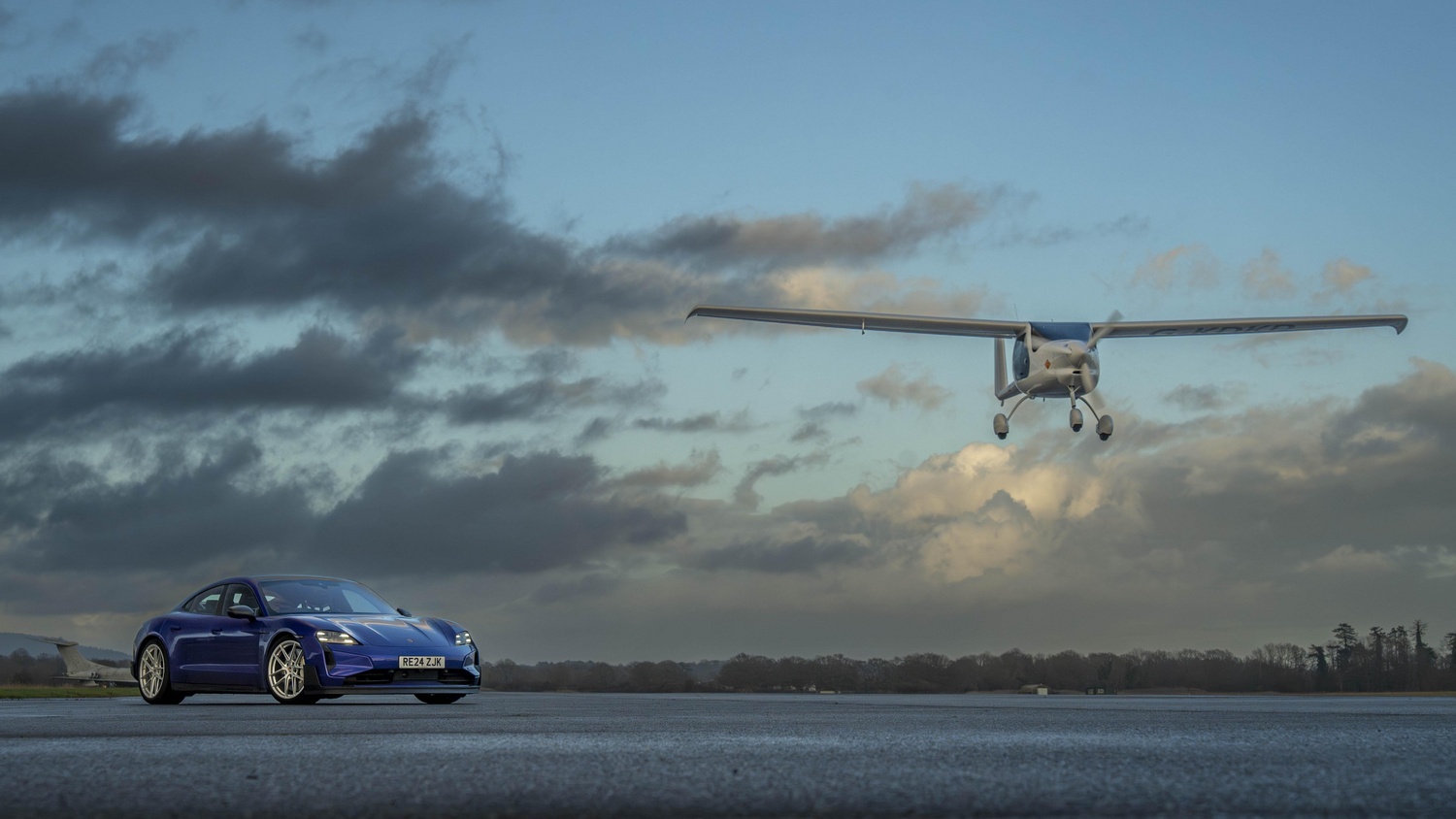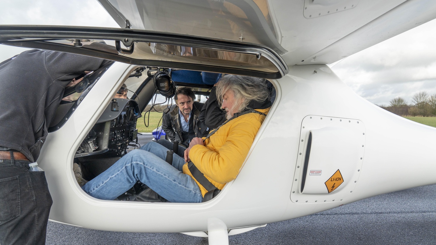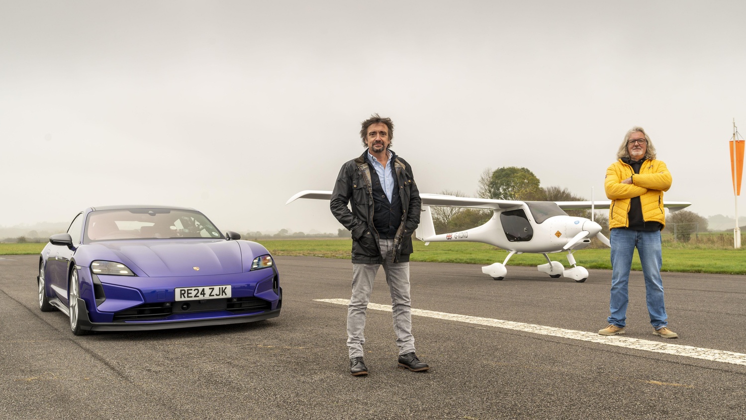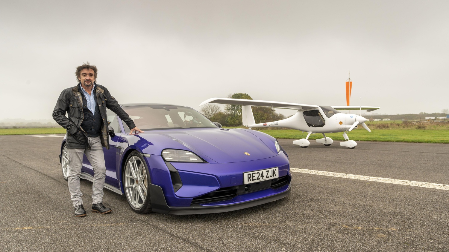 May a pilotat avionul electric Pipistrel Velis Electro, în timp ce Hammond a dezlănțuit puterea lui Porsche Taycan Turbo GT pe drumurile din sudul Angliei.
