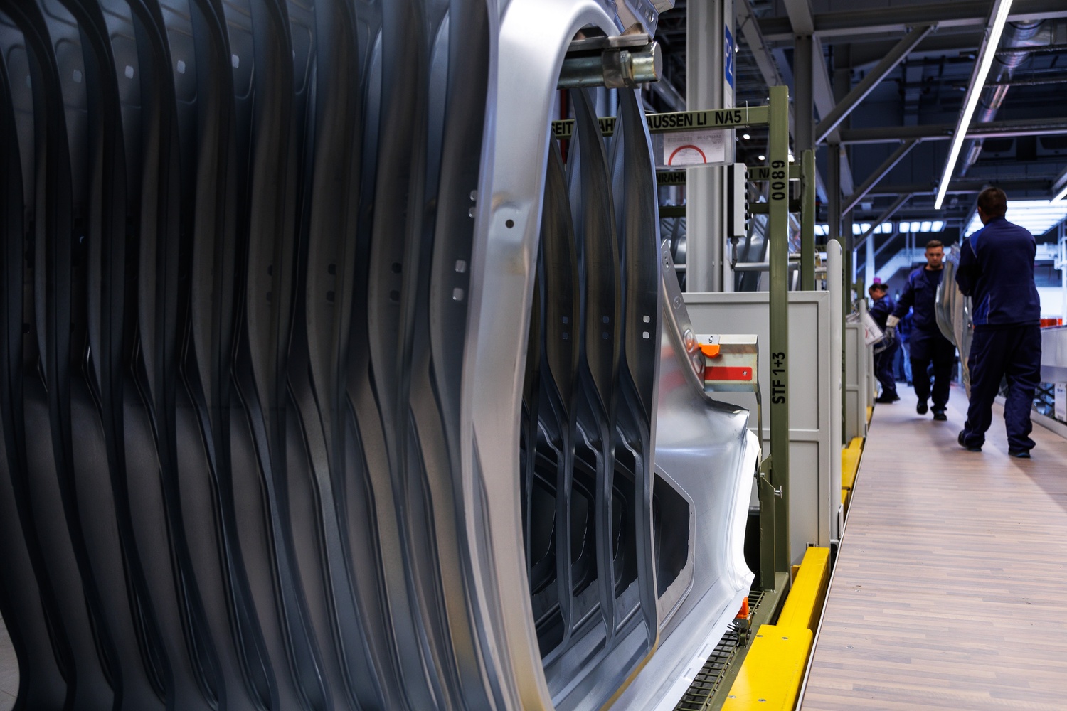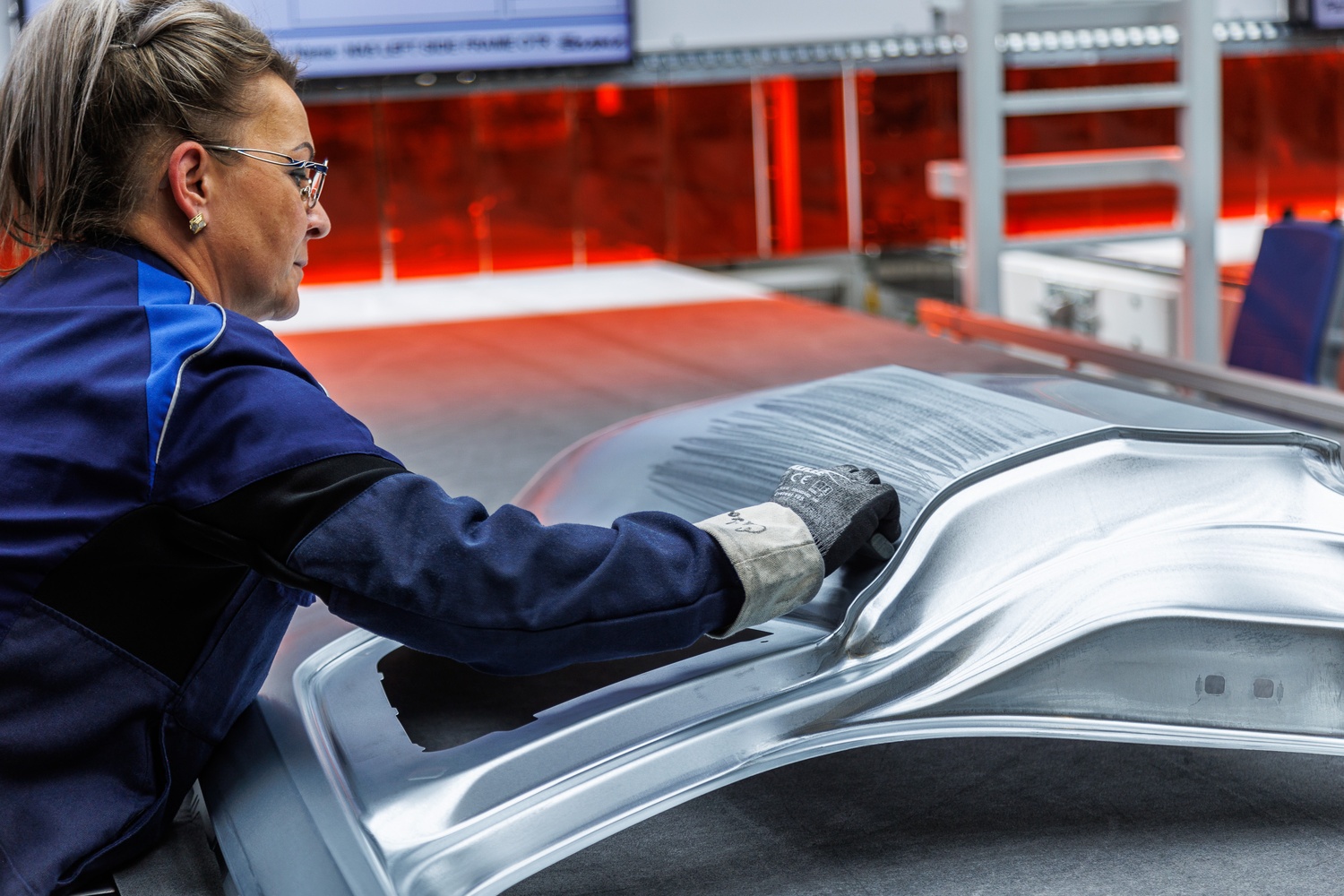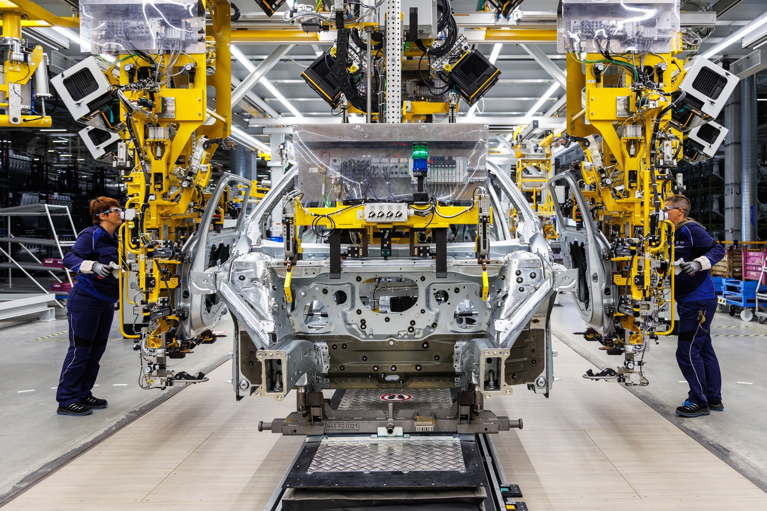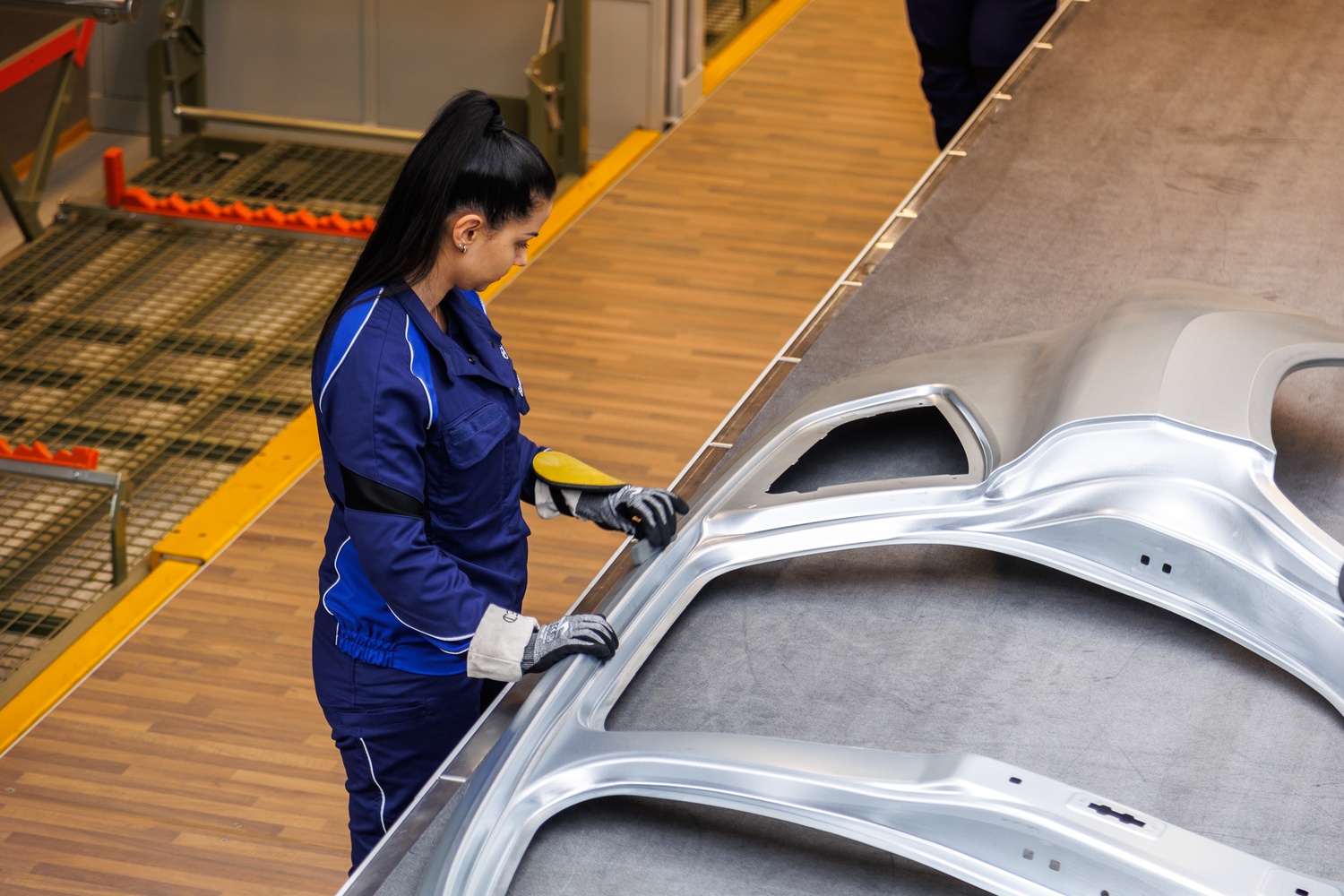 Ciclul de viață al unui vehicul începe în atelierul de presare, unde se produc primele componente din oțel și aluminiu. O macara de 55 de tone alimentează bobinele de oțel și aluminiu într-o linie de tăiere care produce până la 80 de tăieturi pe minut.