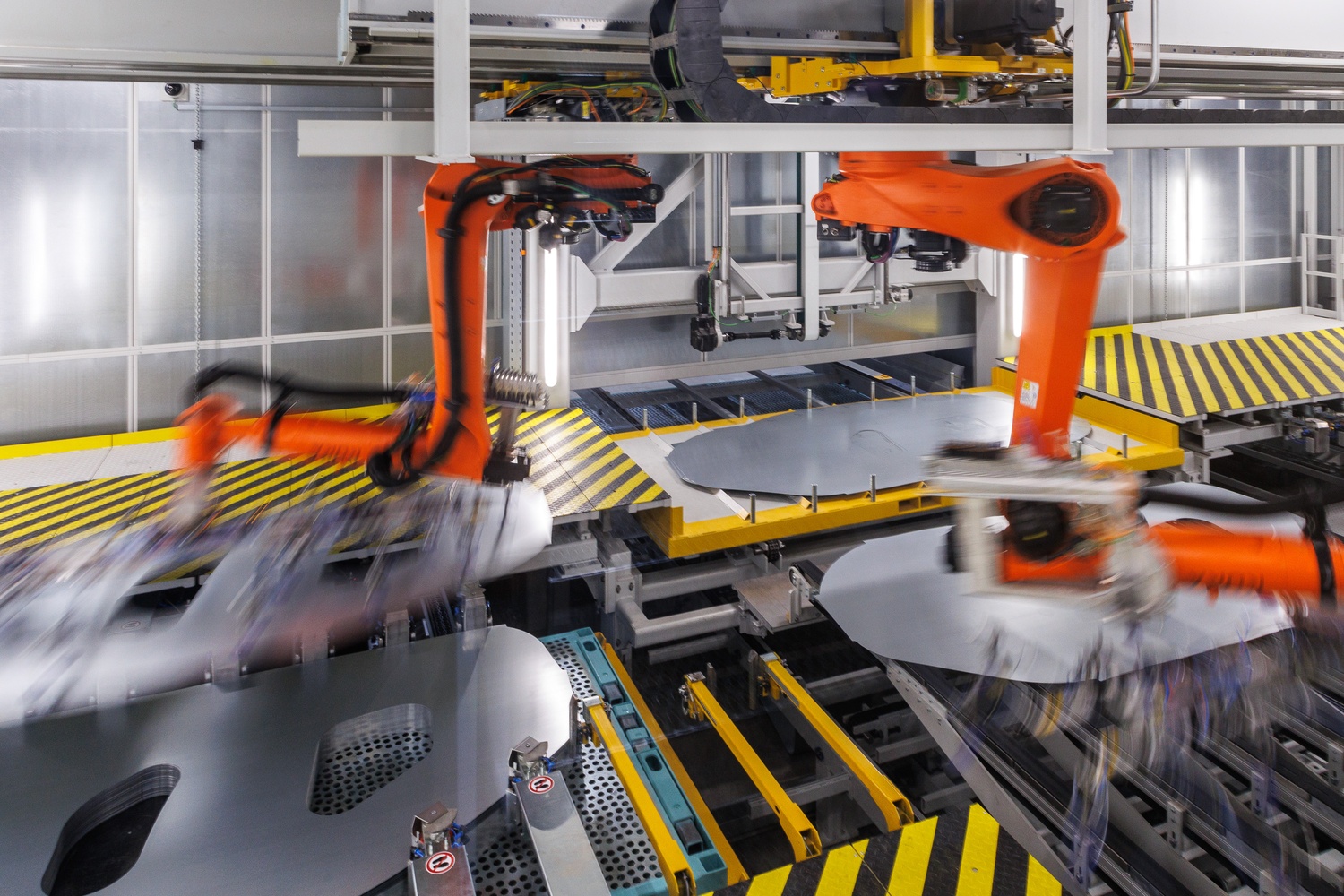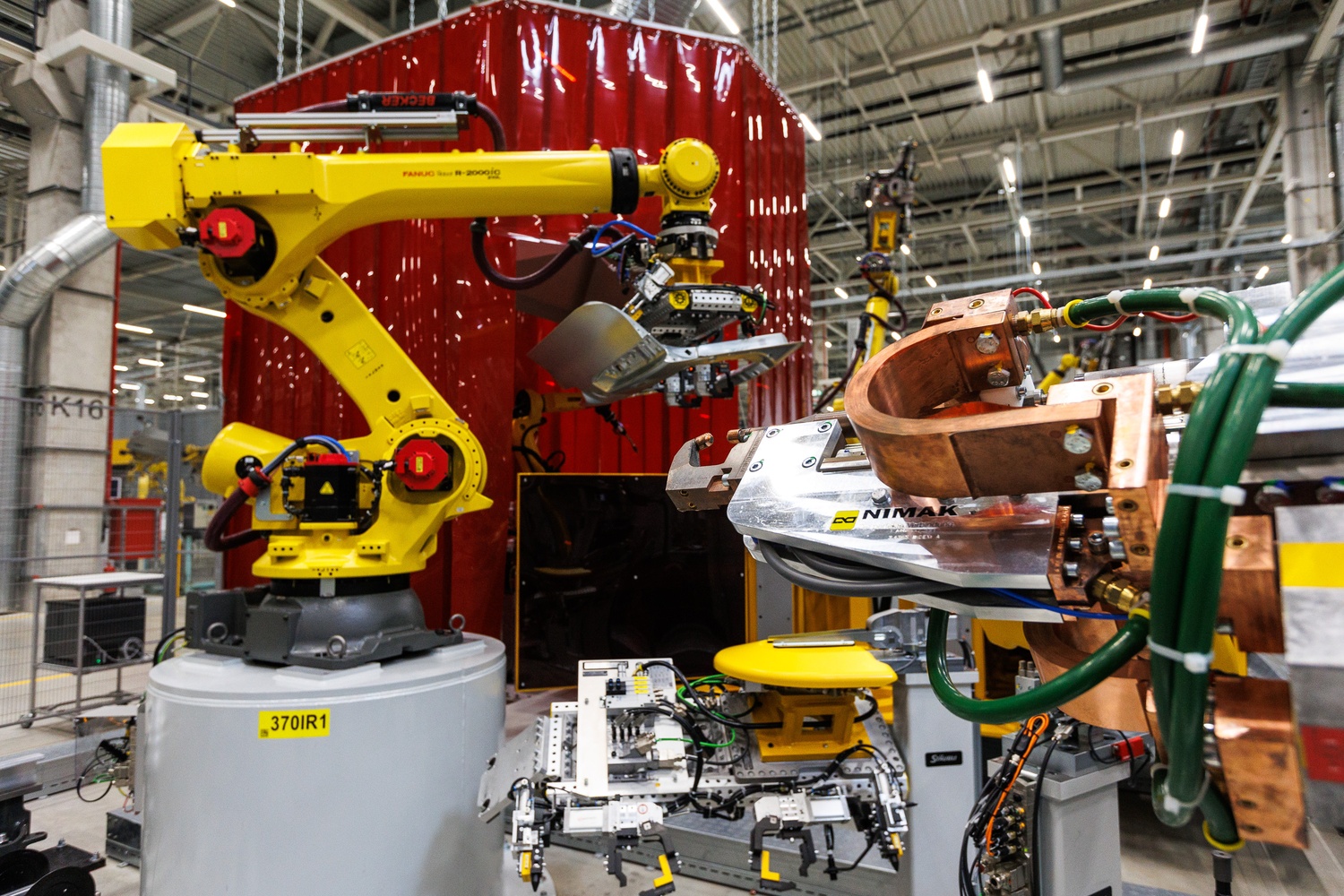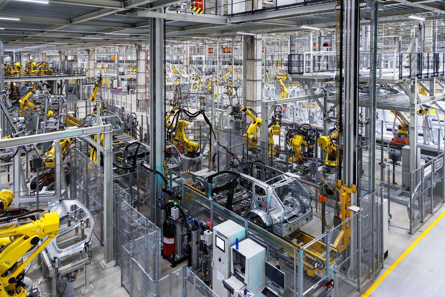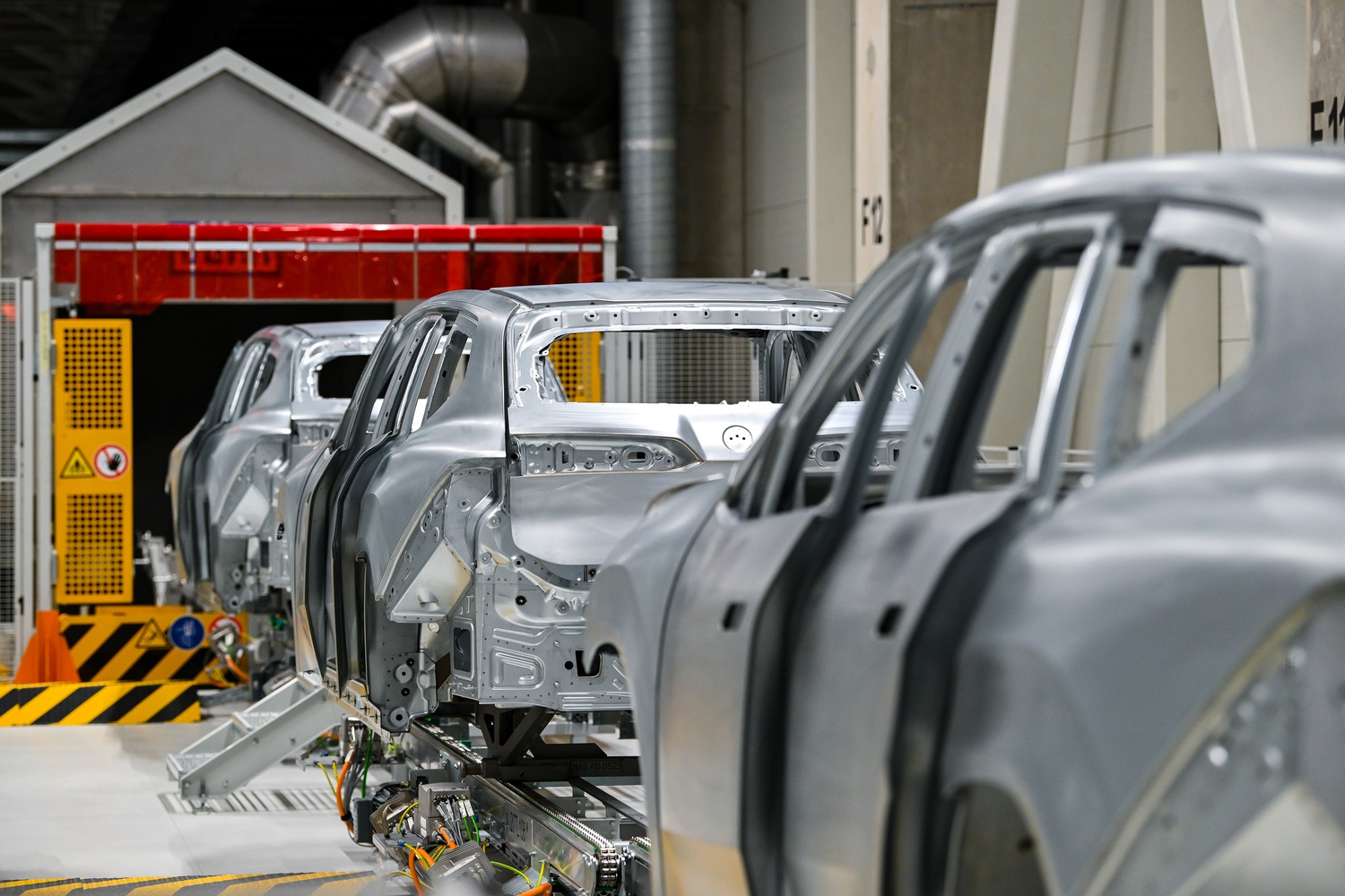 Ciclul de viață al unui vehicul începe în atelierul de presare, unde se produc primele componente din oțel și aluminiu. O macara de 55 de tone alimentează bobinele de oțel și aluminiu într-o linie de tăiere care produce până la 80 de tăieturi pe minut.