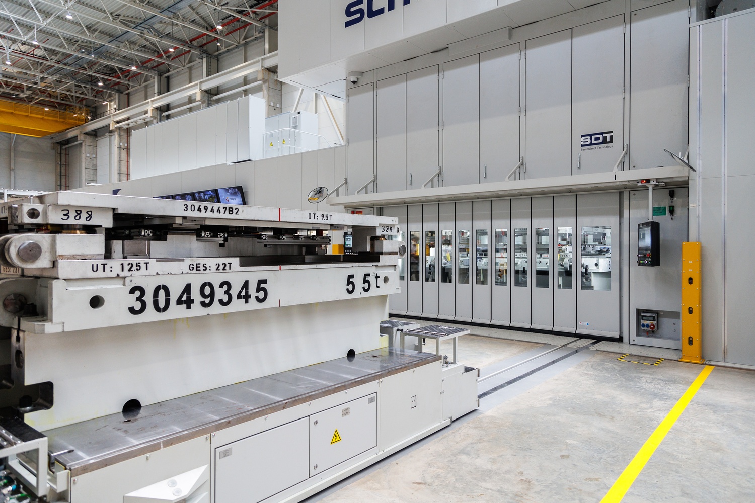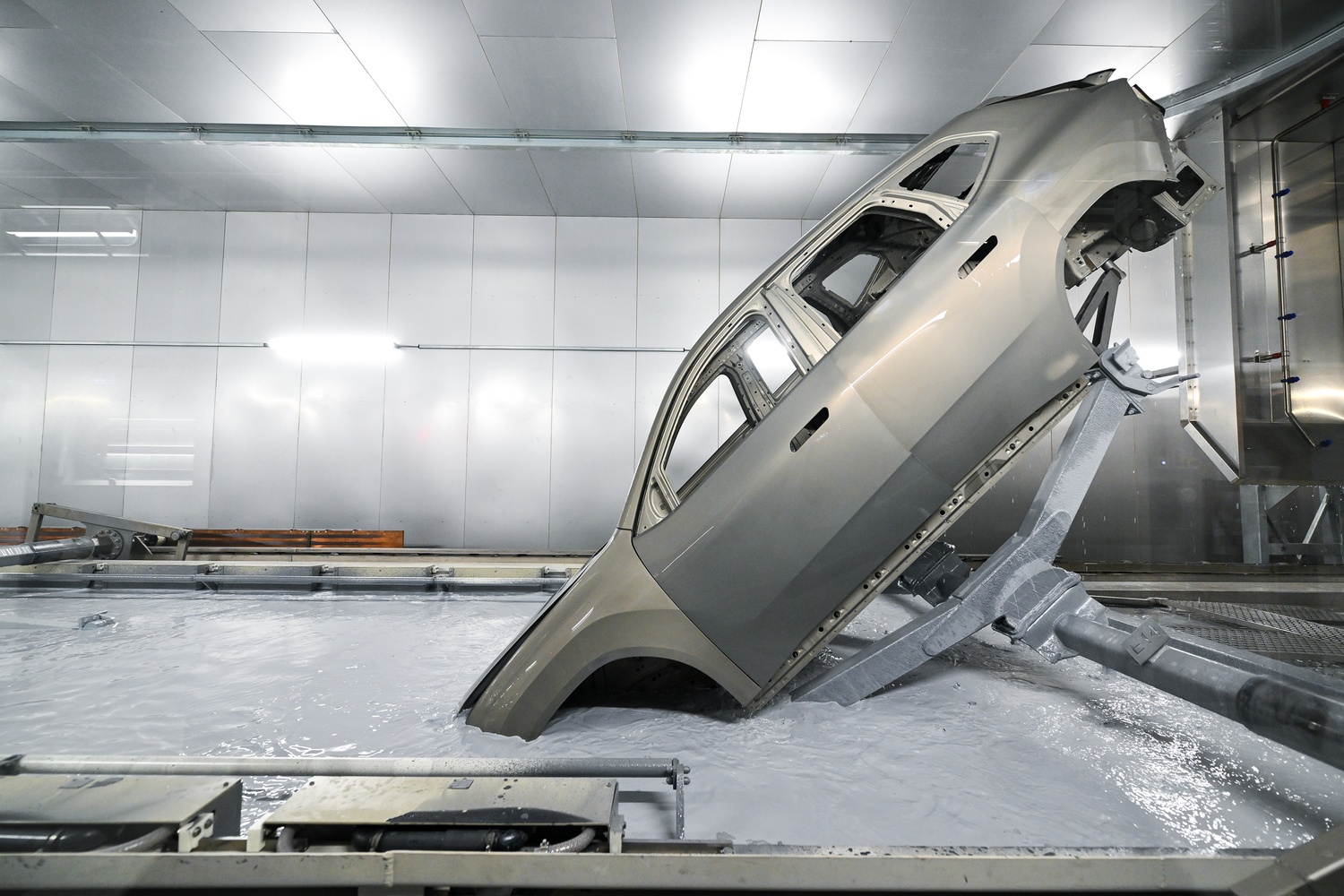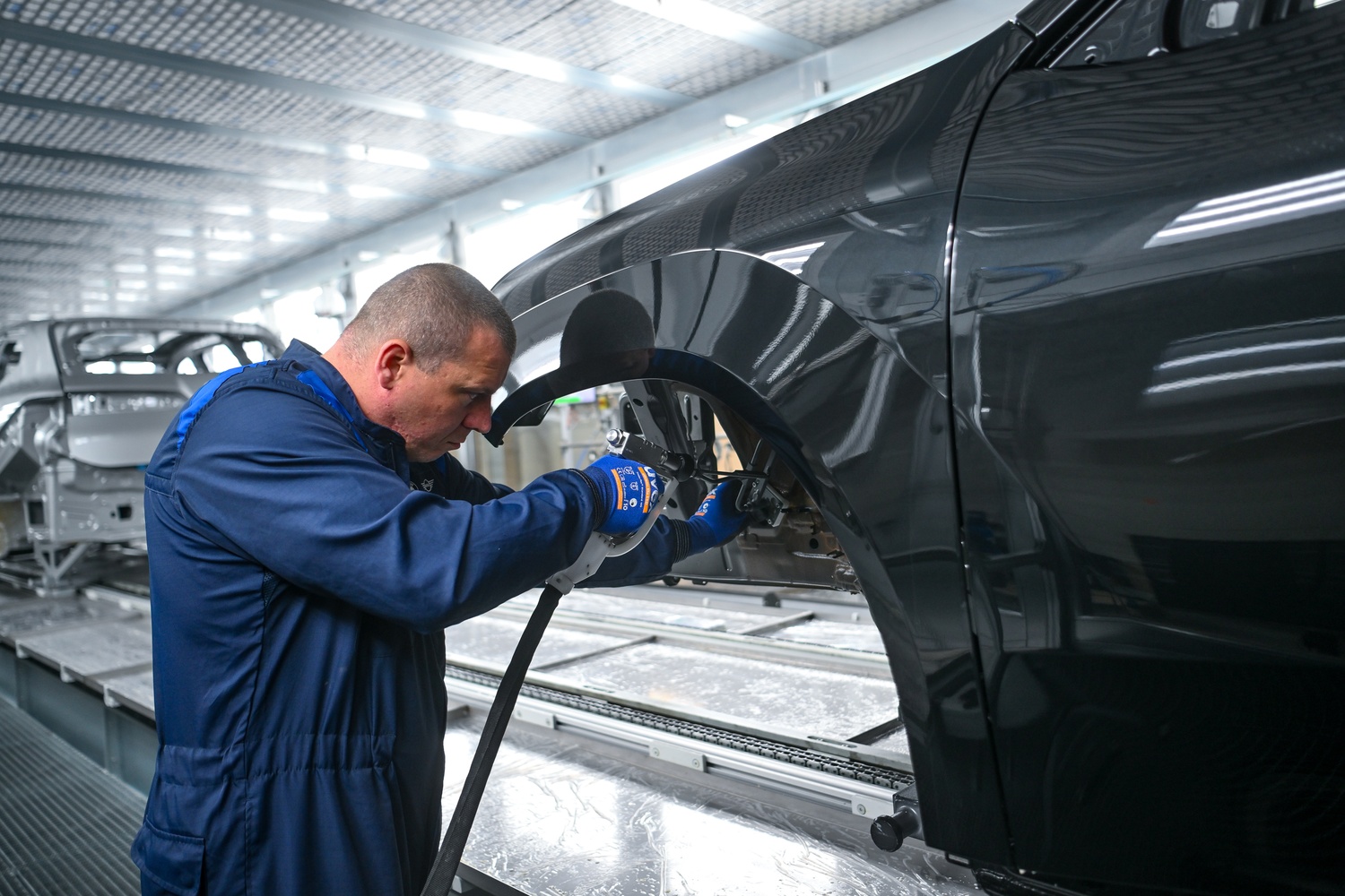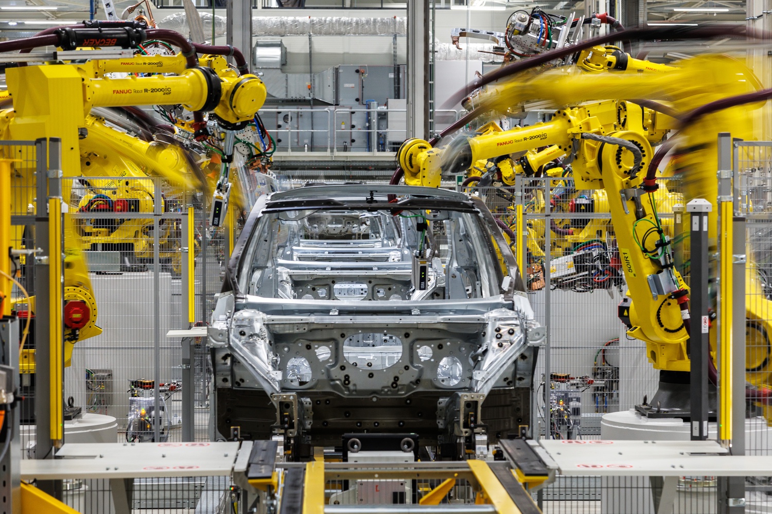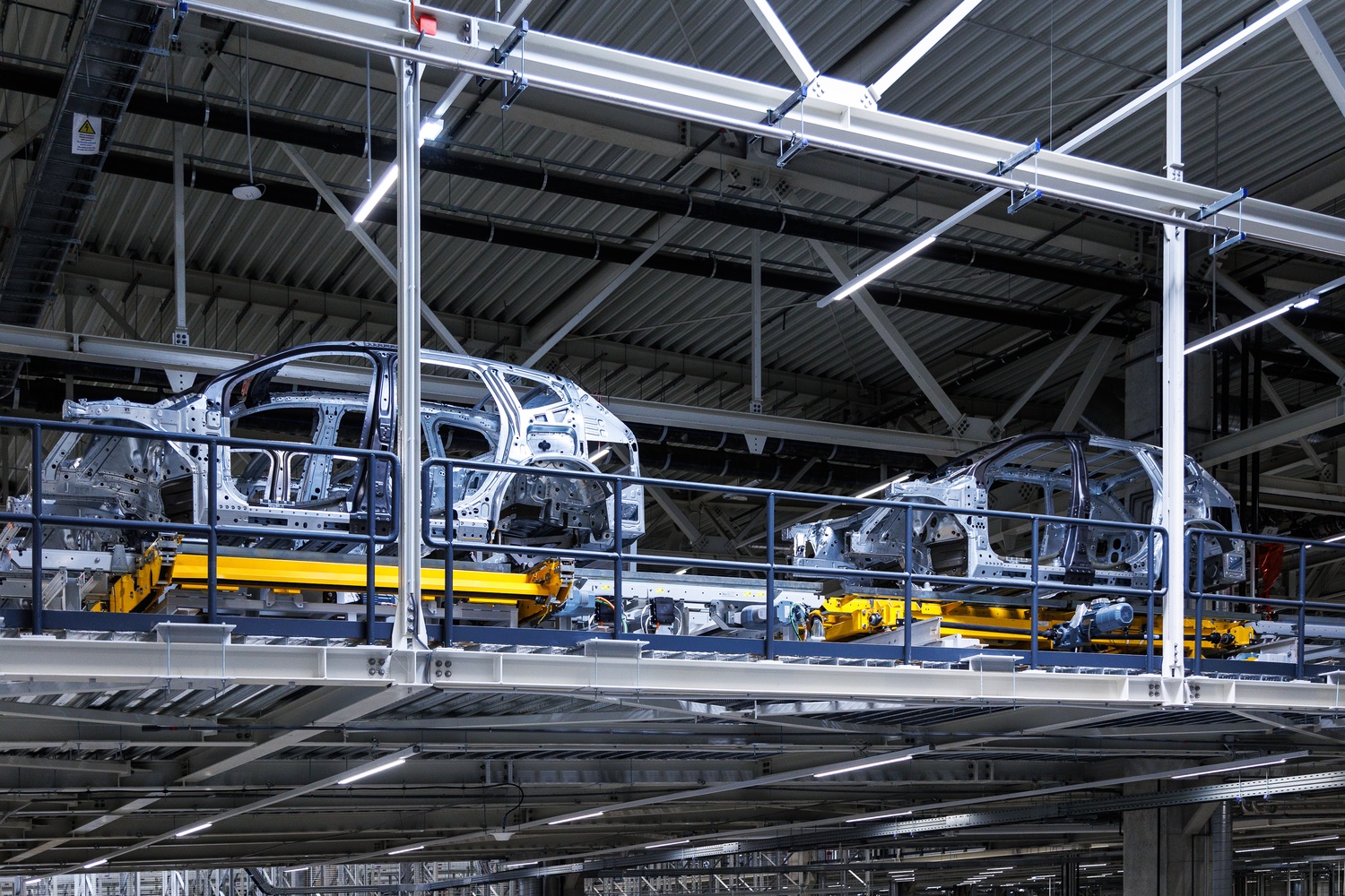 Ciclul de viață al unui vehicul începe în atelierul de presare, unde se produc primele componente din oțel și aluminiu. O macara de 55 de tone alimentează bobinele de oțel și aluminiu într-o linie de tăiere care produce până la 80 de tăieturi pe minut.