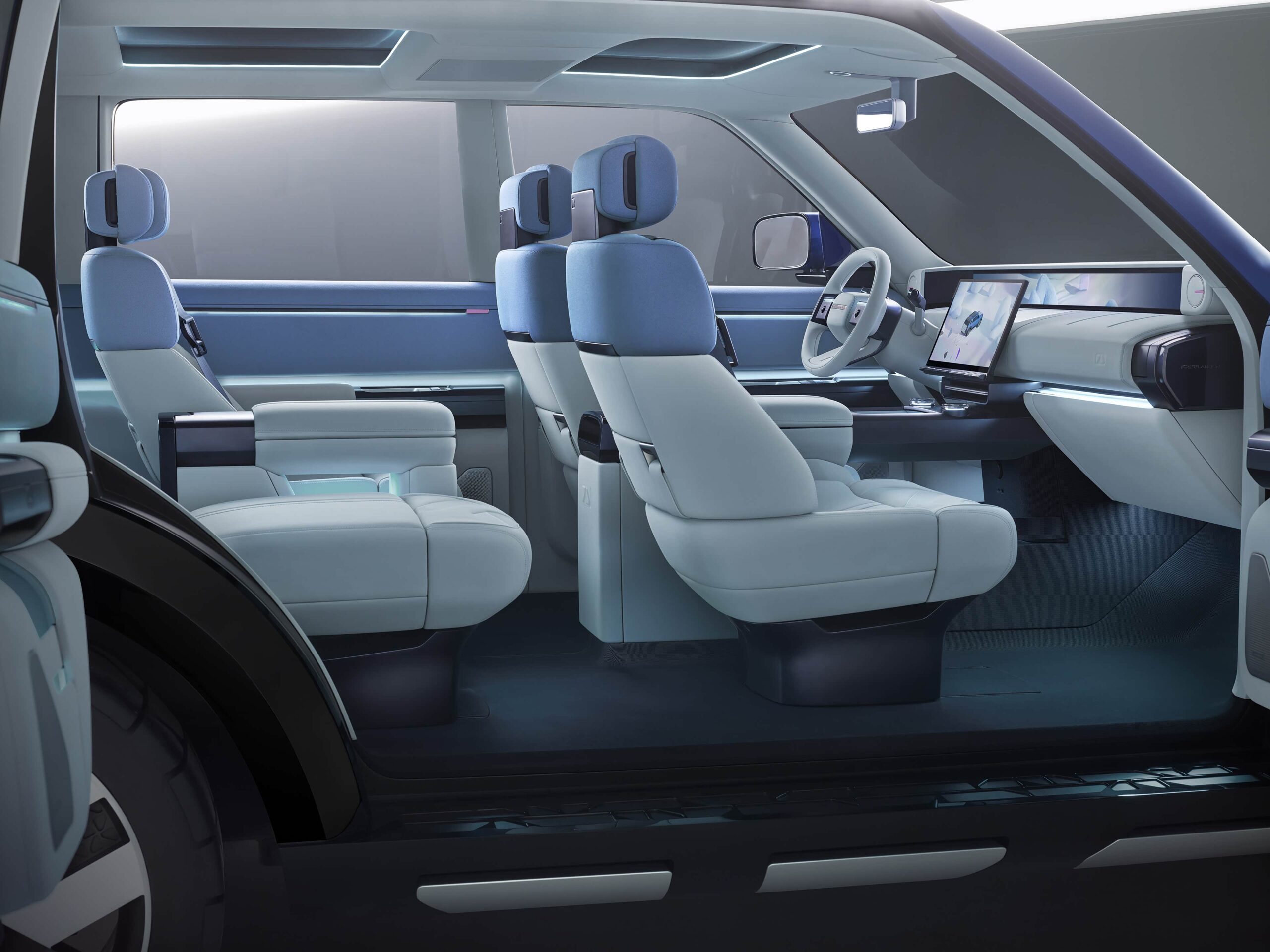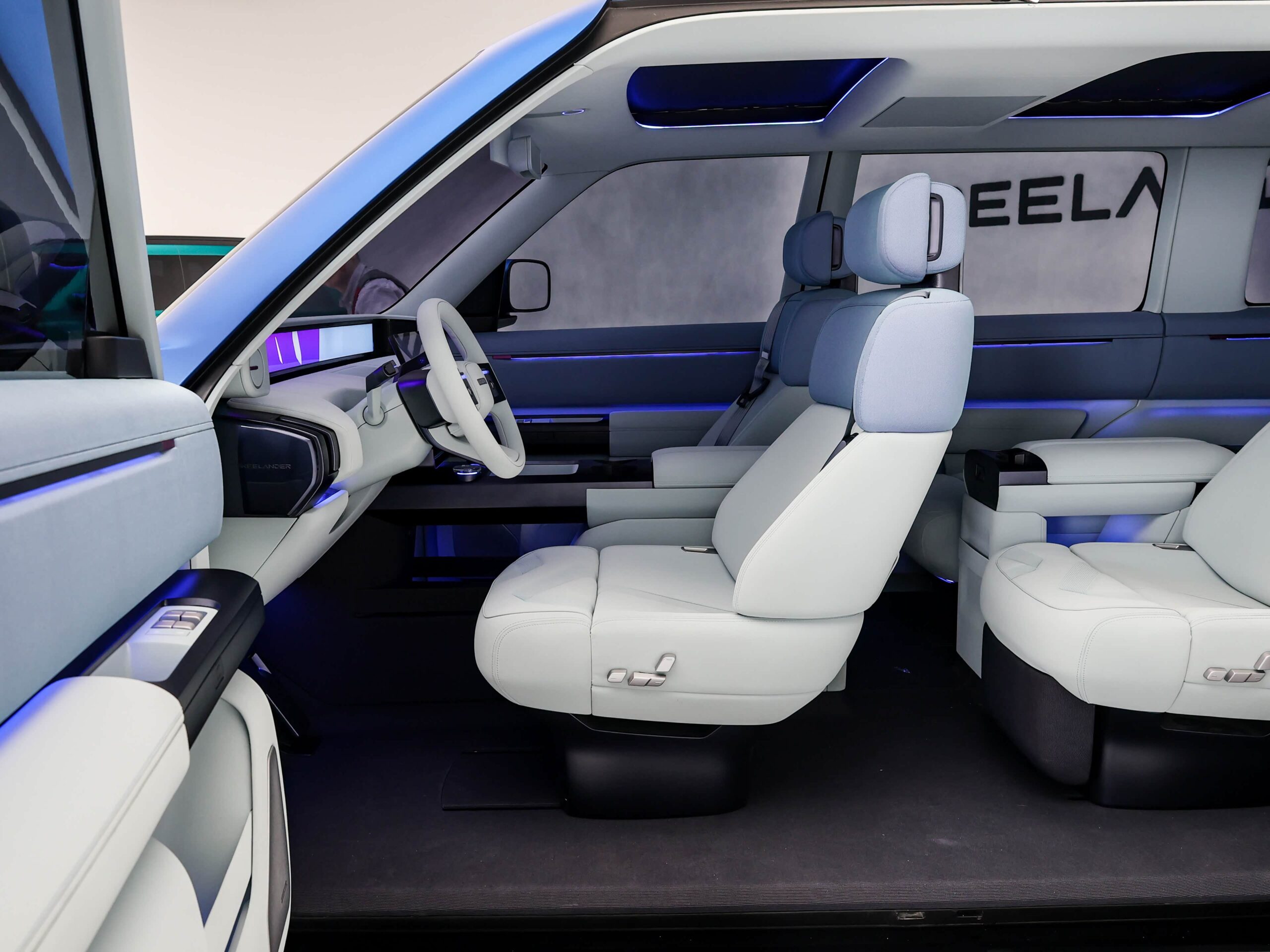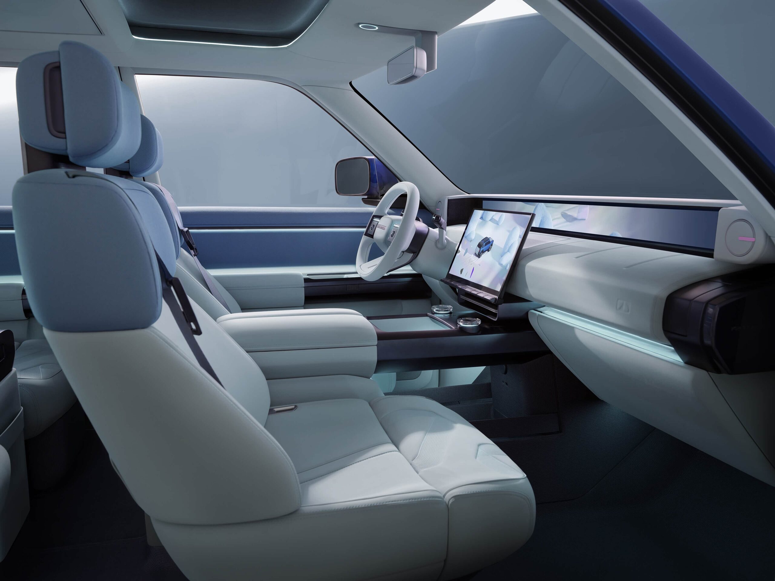 - Interior minimalist, cu ecran multimedia flotant și un display panoramic care se întinde pe toată lățimea bordului sub parbriz