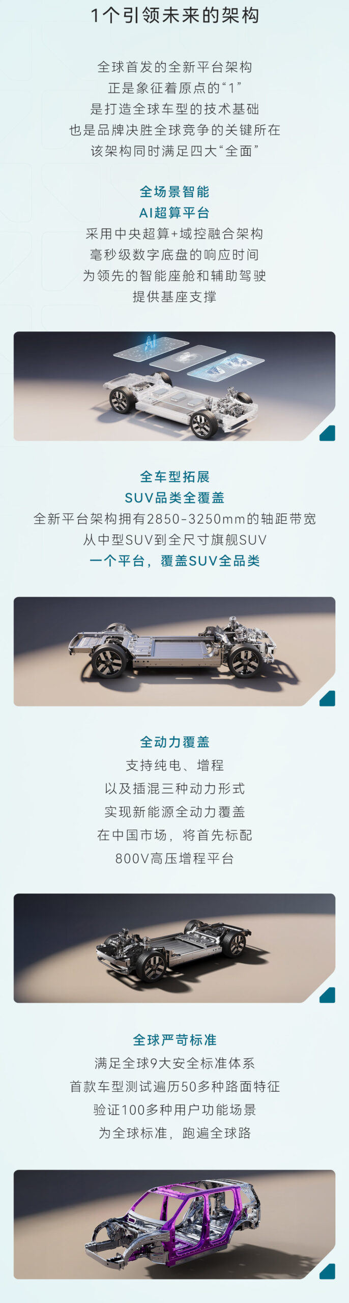 - 1 – platforma iMAX, o arhitectură de ultimă generație care suportă toate tipurile de propulsie (electric pur, range extender, plug-in hybrid), cu un sistem electric de 800 V standard pentru piața chineză. Platforma acoperă vehicule cu ampatament între 2850-3250 mm și respectă nouă standarde globale de siguranță.