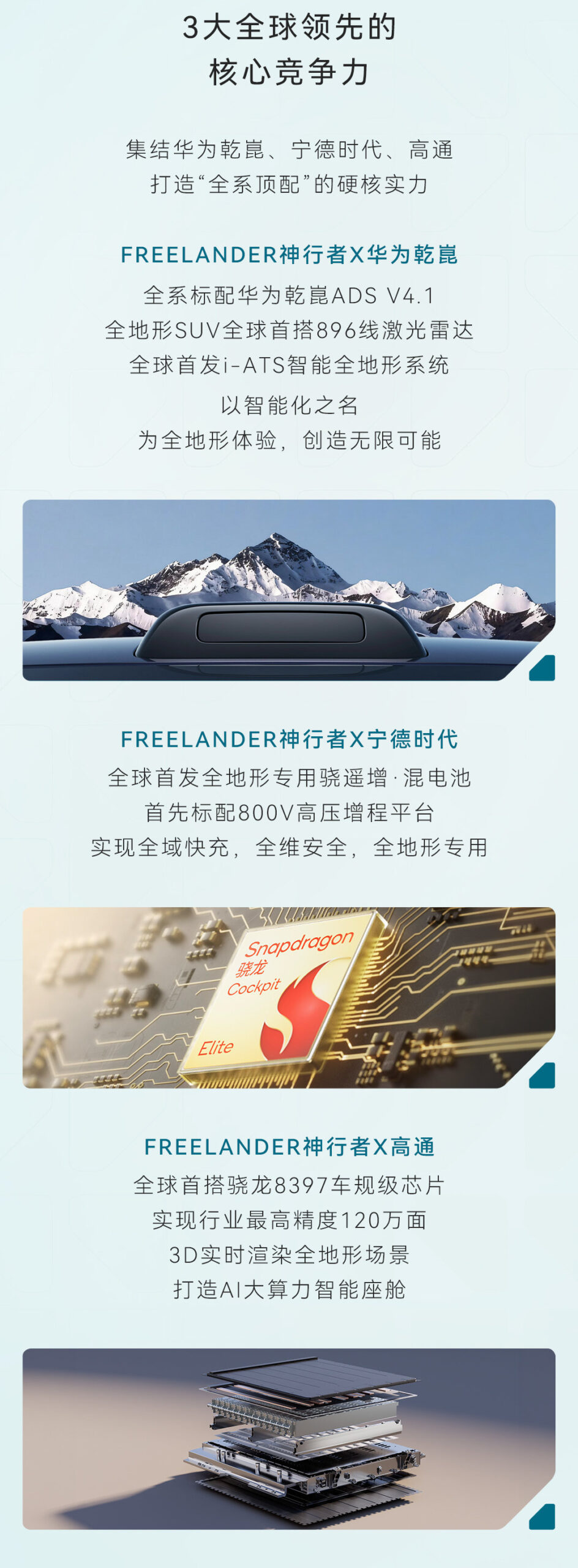 - Cu Huawei – FREELANDER va deveni primul brand de lux din lume care va echipa toate modelele sale cu sistemul avansat de asistență la conducere Huawei Qiankun ADS V4.1. Primul model va fi primul SUV de teren din lume echipat cu noul LiDAR cu 896 de linii, ceea ce îi va oferi o capacitate de percepție a mediului fără precedent.