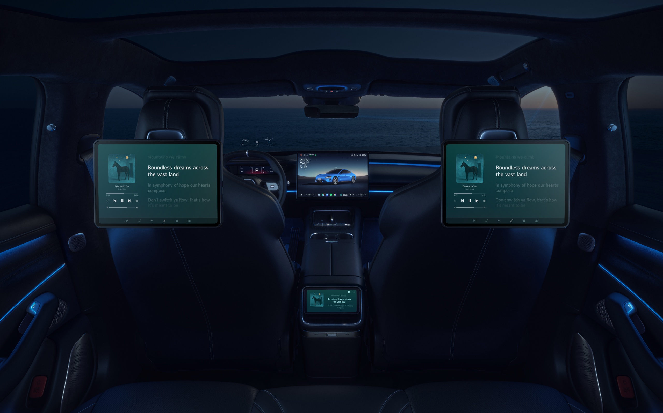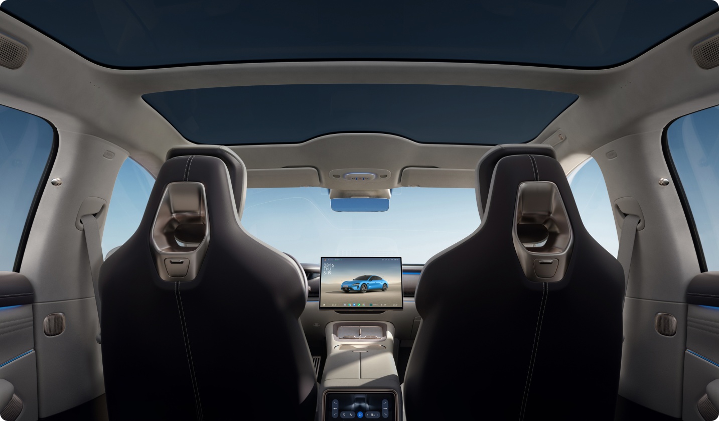 - Platformă de calcul: Un absolut nou Four-in-One Domain Control Module, cu două cipuri flagship de 4 nm: Snapdragon® 8 Gen 3 (nou, pentru multimedia) și NVIDIA DRIVE AGX™ Thor (pentru asistență la condus). Suport UWB și Wi-Fi 7 – standard.
