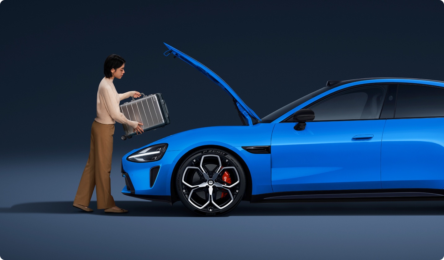 - Portbagaj frontal cu capotă electrică (frunk): Capacitate de 105 litri, suficient pentru o valiză de 20 inchi. Suportă ditamai opt metode de deschidere: prin buton fizic exterior, ecranul central, aplicația Xiaomi EV, widget, cheie, UWB, comandă vocală XiaoAi în mașină și comandă vocală XiaoAi din afara mașinii.