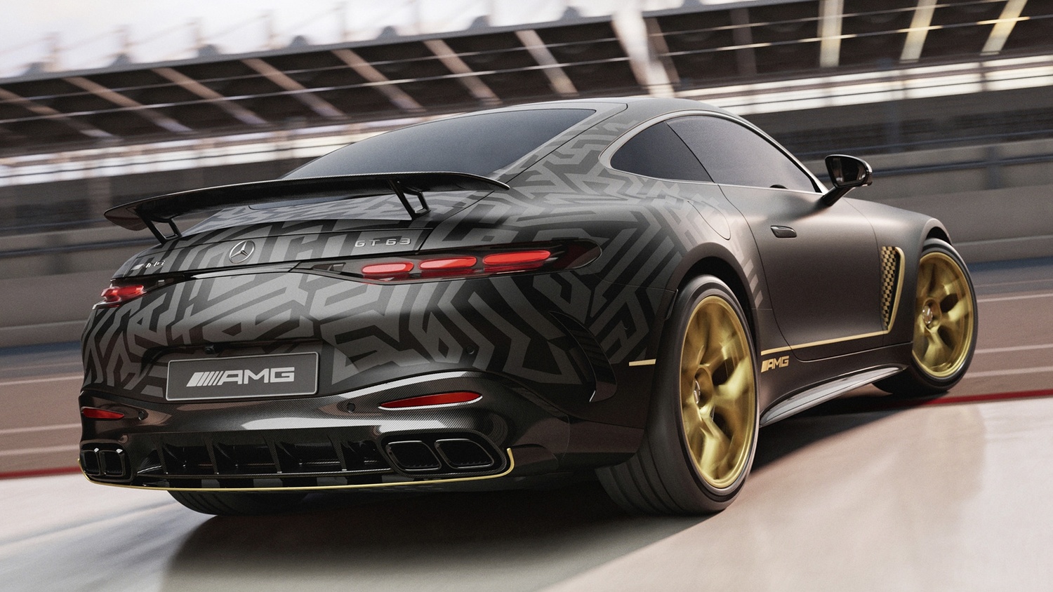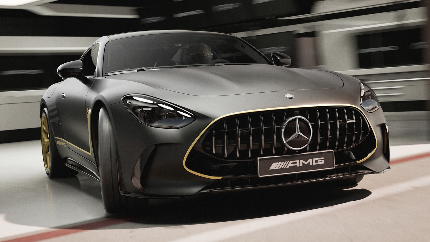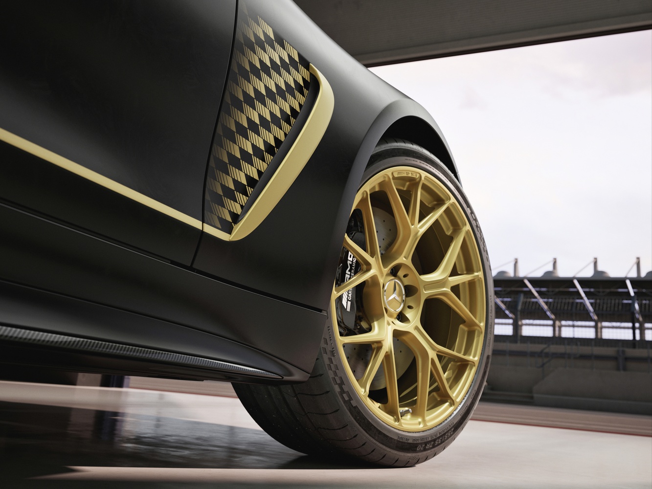 Jantele forjate AMG de 21 de inchi sunt, de asemenea, vopsite în race gold mat, contrastând cu etrierii negri de frână ai sistemului AMG carbon-ceramic. Pachetul AMG Exterior Carbon Fibre, cu splitter frontal, praguri laterale, difuzor și aripă fixă din fibră de carbon, subliniază legătura cu motorsportul. Pachetul AMG Night II adaugă detalii negre cromate, inclusiv grila și steaua Mercedes din spate, accentuând statutul exclusivist al modelului.