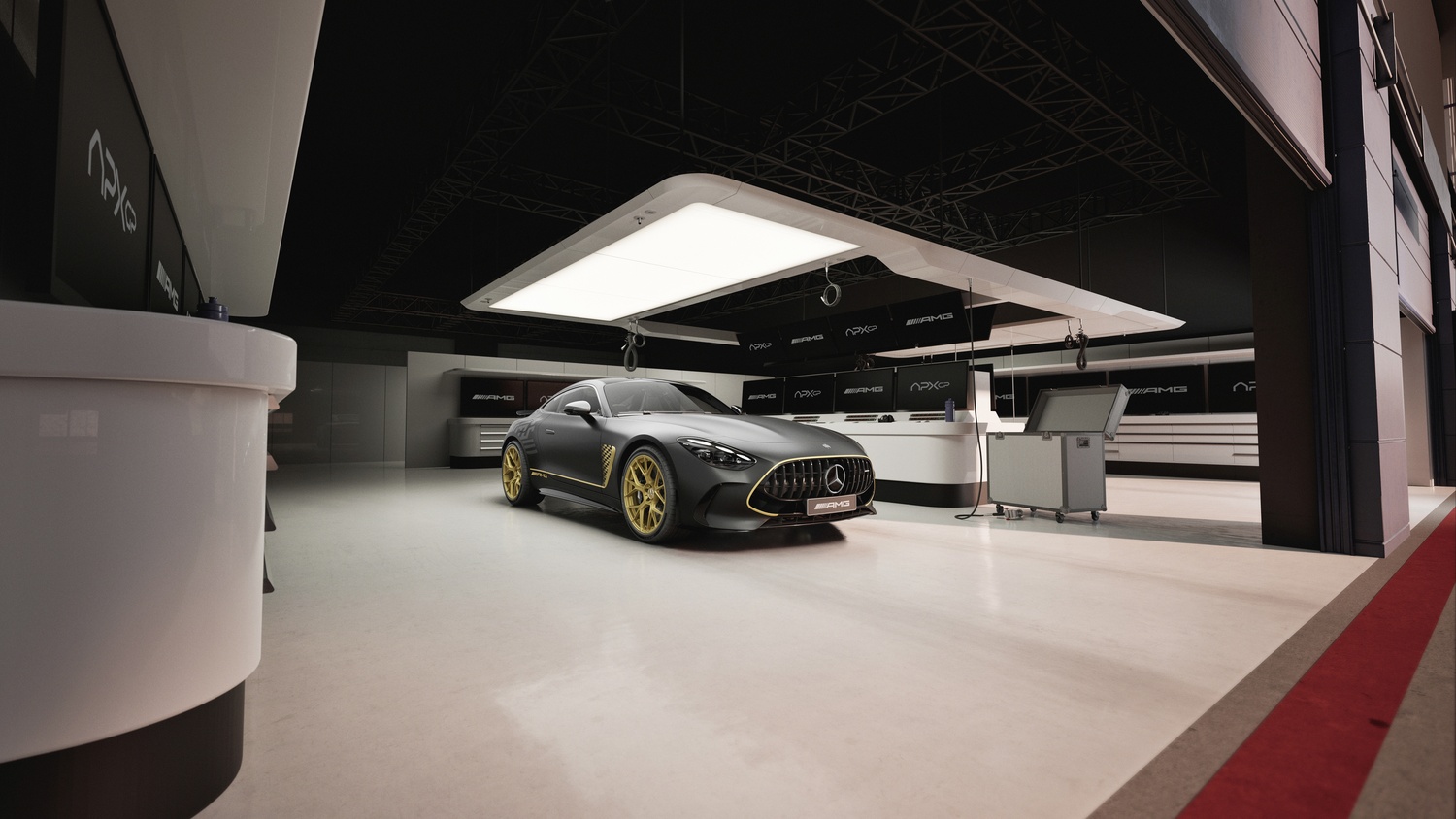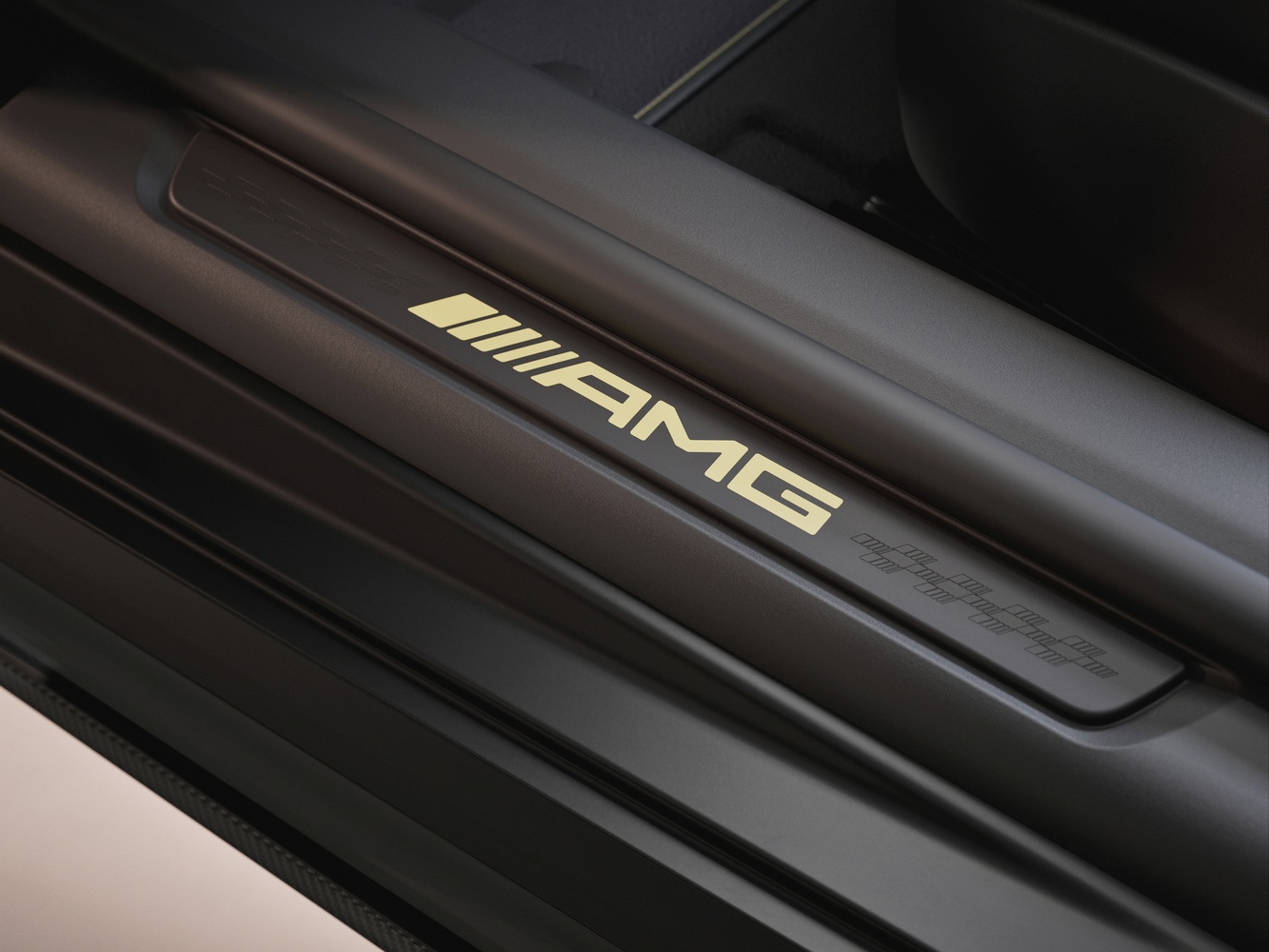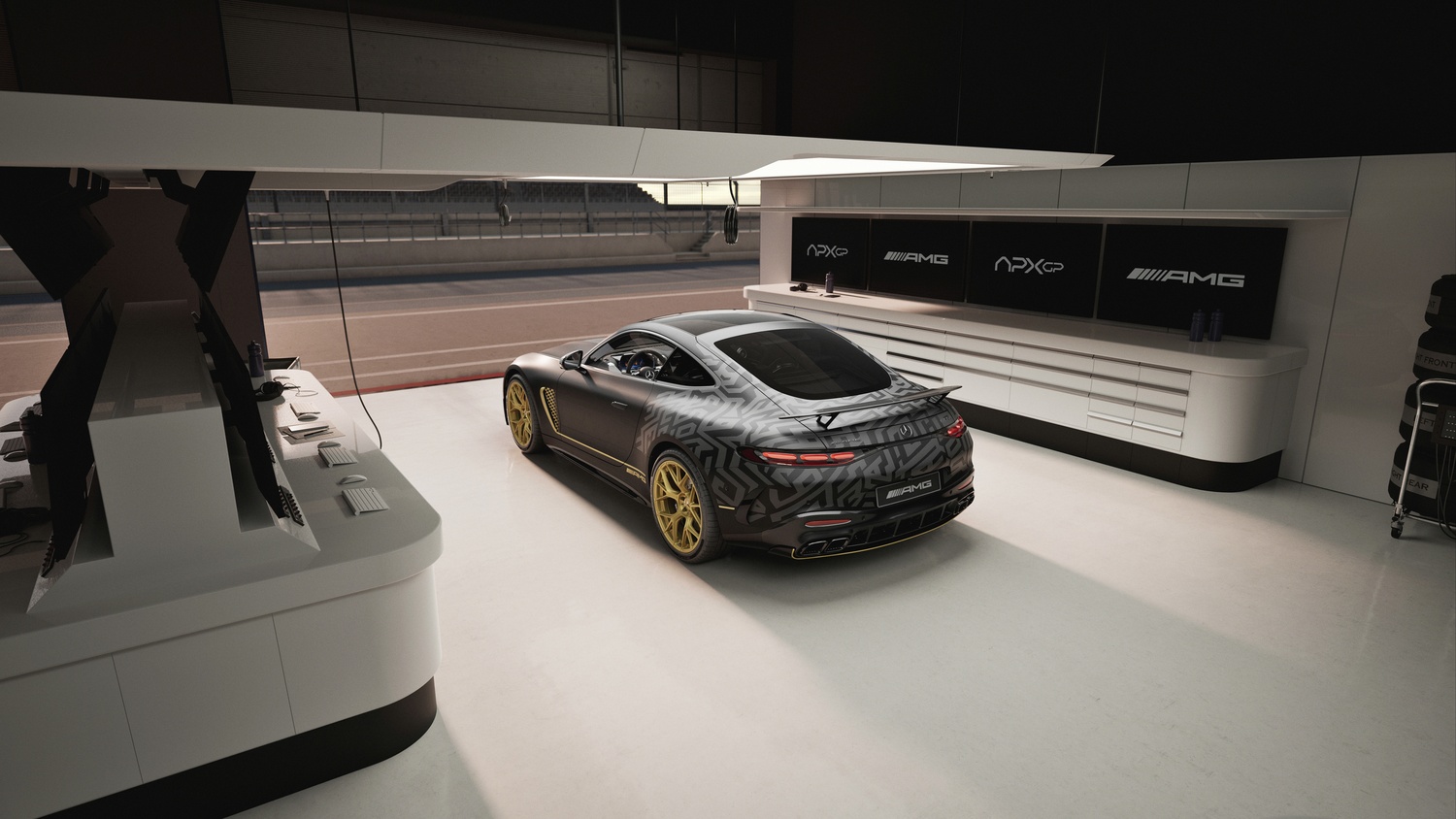 Interiorul impresionează prin scaunele AMG Performance tapițate în piele Nappa neagră și microfibră MICROCUT, personalizate cu cusături aurii. Elementele decorative din fibră de carbon cu fire aurii se armonizează cu volanul încălzit, cusut tot în race gold, iar pragurile ușilor iluminate în auriu evidențiază sigla „APXGP” brodată pe covorașe.