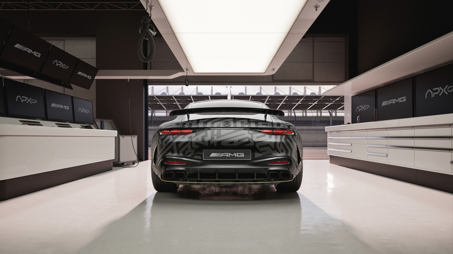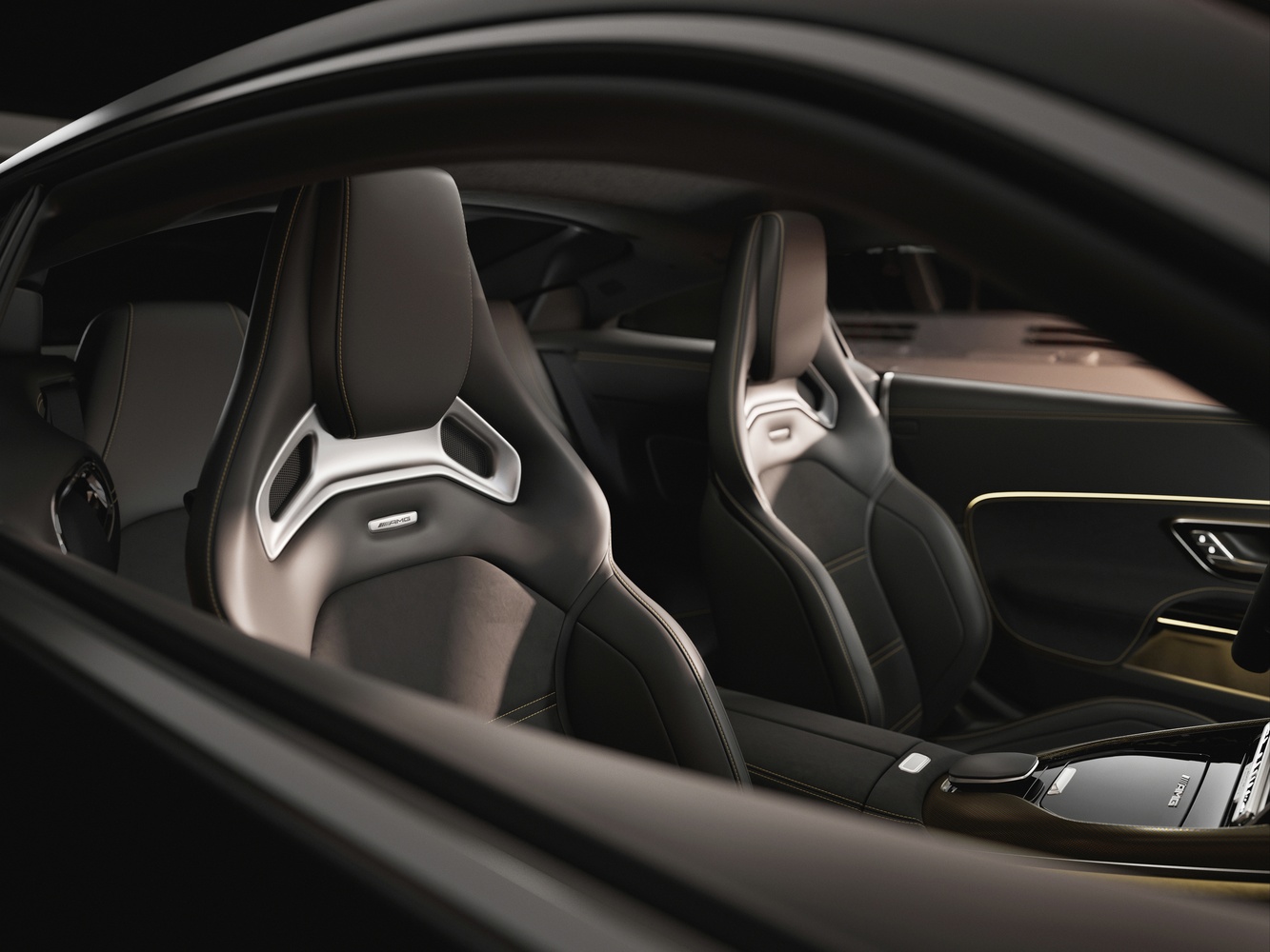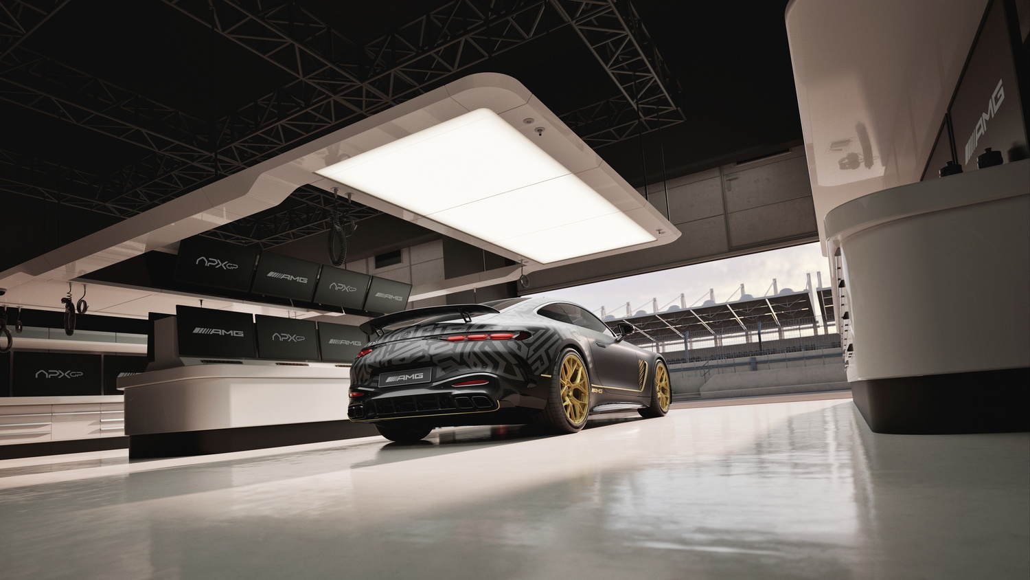 Interiorul impresionează prin scaunele AMG Performance tapițate în piele Nappa neagră și microfibră MICROCUT, personalizate cu cusături aurii. Elementele decorative din fibră de carbon cu fire aurii se armonizează cu volanul încălzit, cusut tot în race gold, iar pragurile ușilor iluminate în auriu evidențiază sigla „APXGP” brodată pe covorașe.