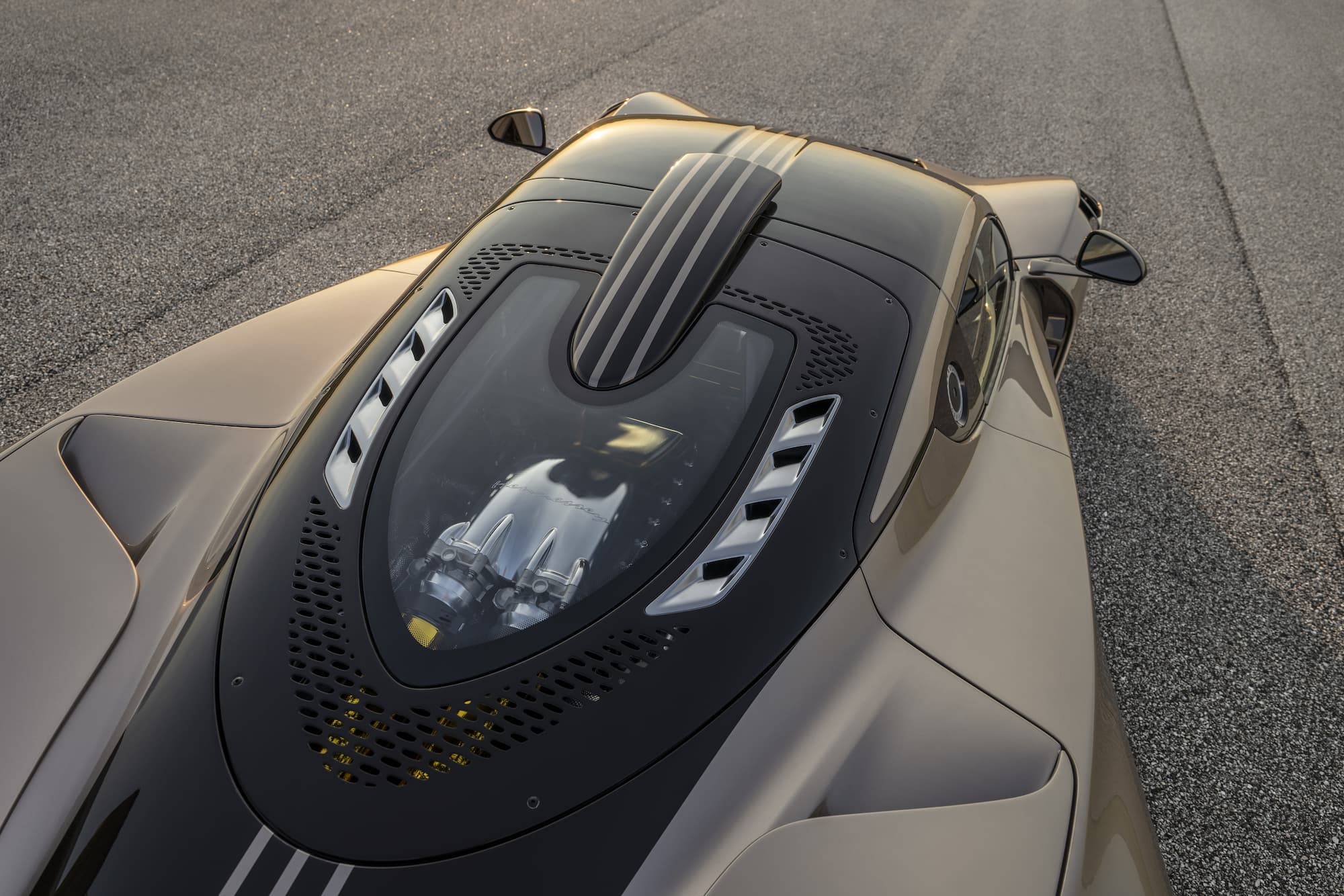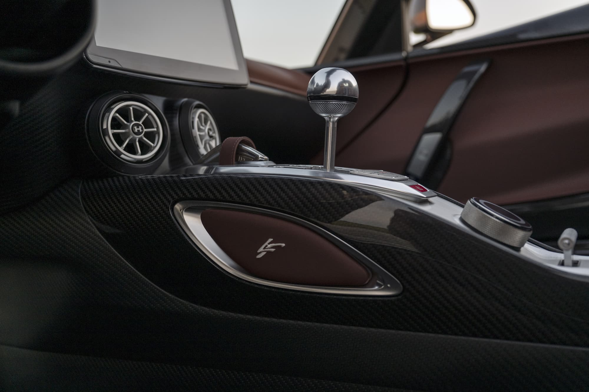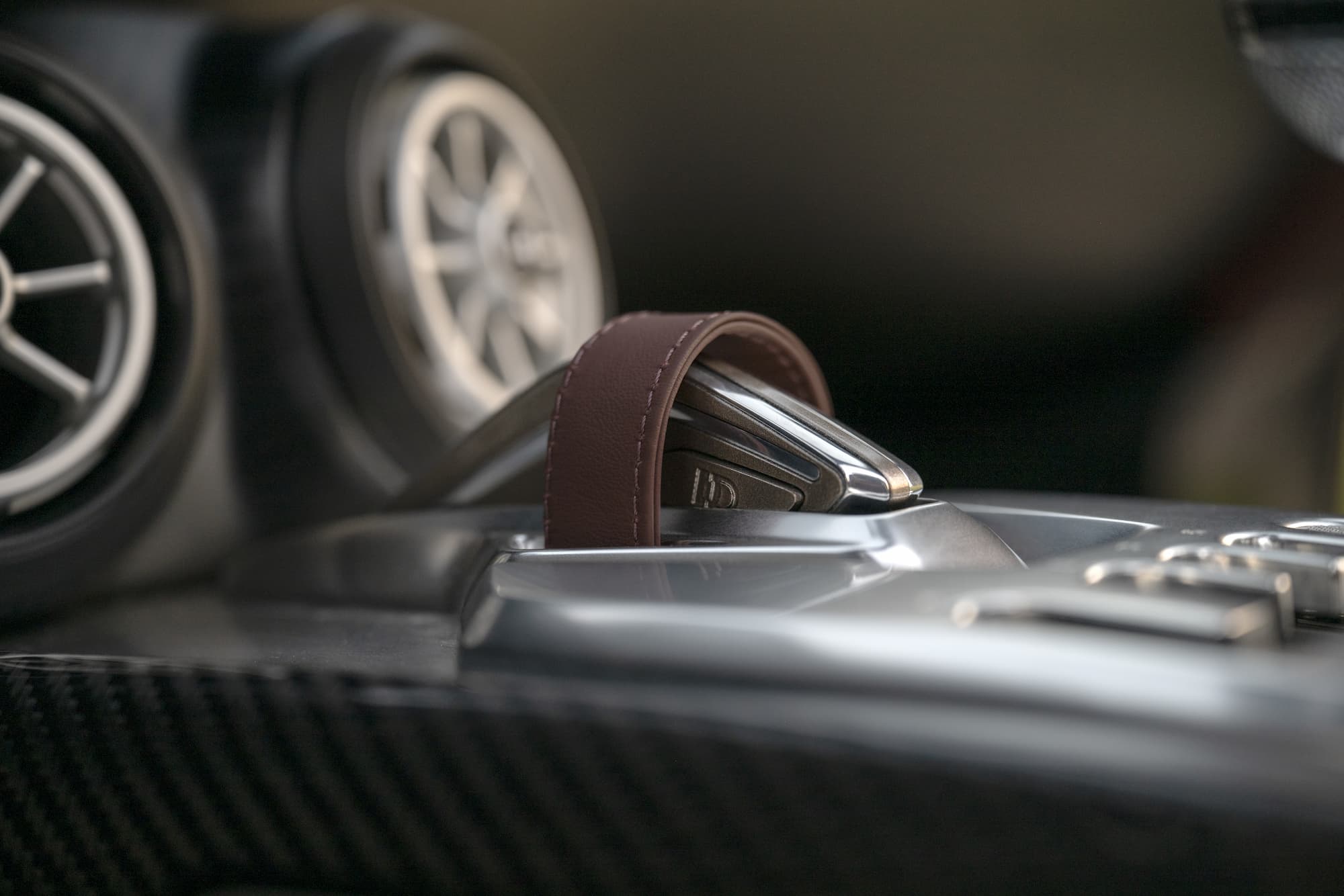 Consola centrală prezintă un schimbător H-pattern din aluminiu masiv, deflectoare de ventilație alăturate și un suport pentru cheia-breloc, parte a procesului de aprindere a motorului. Comutatoarele și rotilele, inspirate de orologerie, includ detalii luminoase care strălucesc noaptea, iar frâna de mână cu mecanism bolt-action subliniază măiestria obsedantă a cabinei.