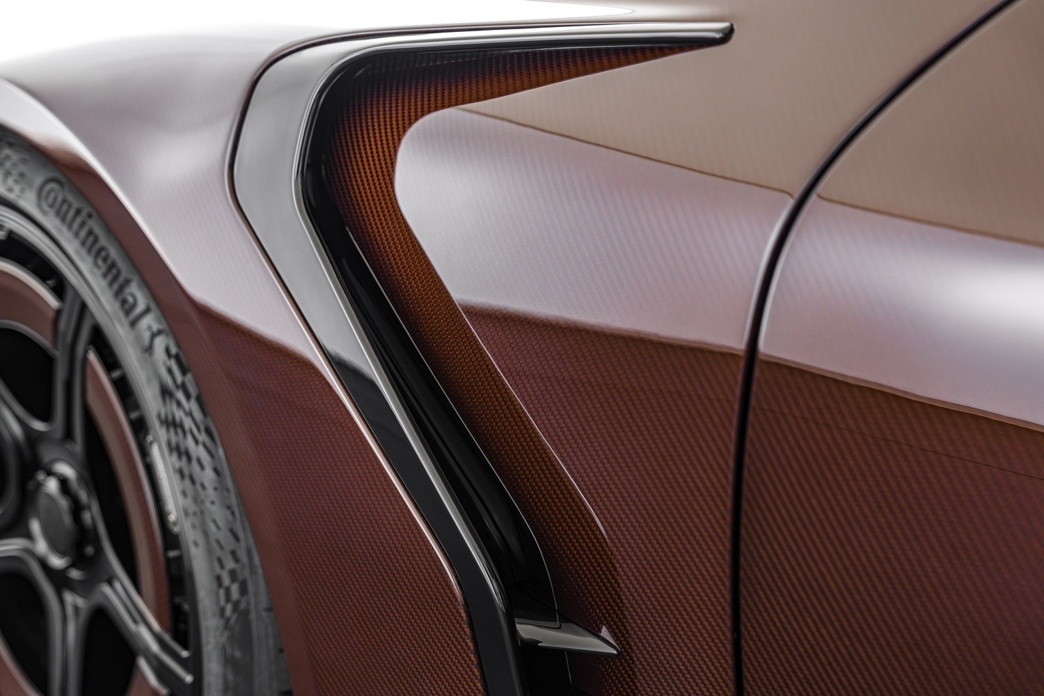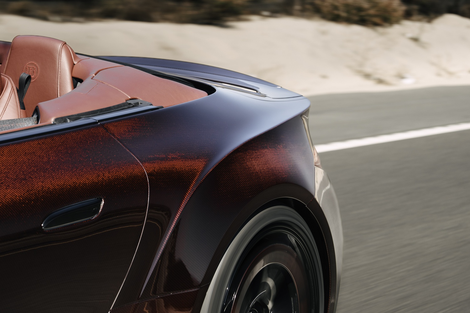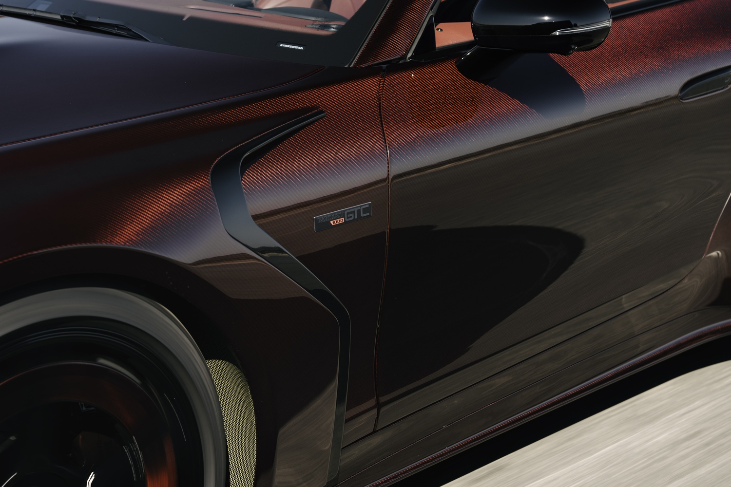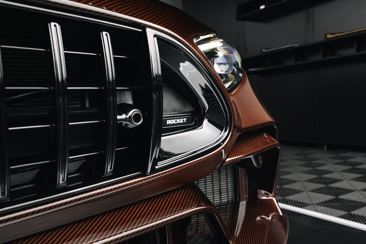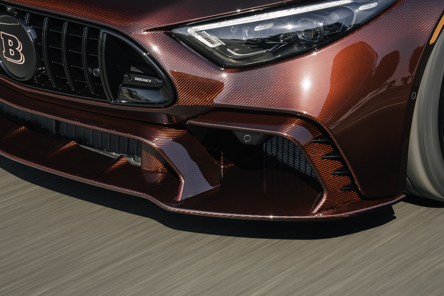 - BRABUS ROCKET GTC DEEP RED impresionează prin caroseria sa custom, realizată integral din carbon cu structură expusă de culoare roșie, finisată cu un strat transparent roșu prin procesul depreimpregnare în autoclavă (cuptor special). Această structură, optimizată apoi în tunelul aerodinamic, generează forță de apăsare suplimentară pe ambele punți, fiind completată de prize de aer mari pentru radiatoare și frâne.