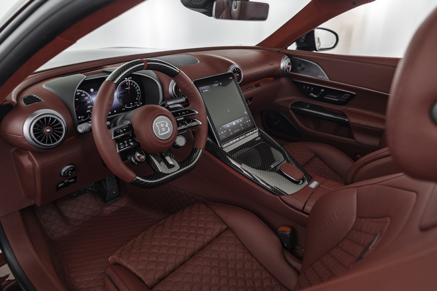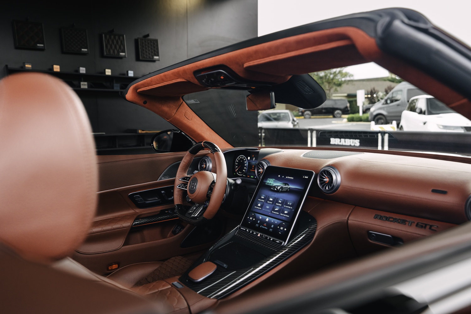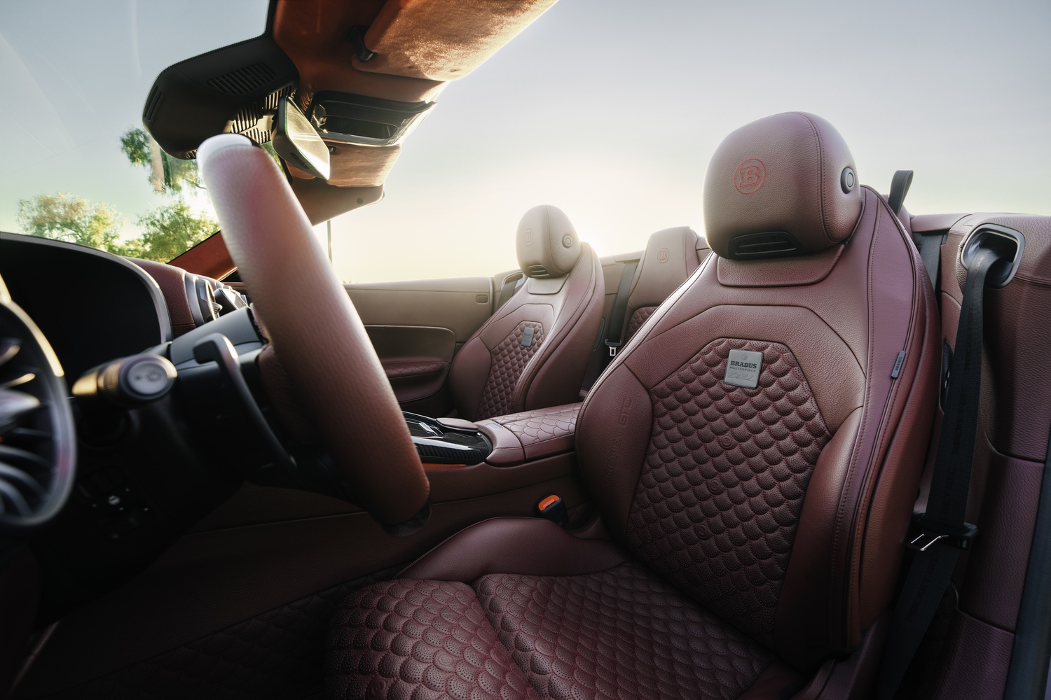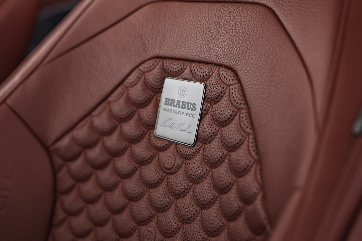 - Interiorul Masterpiece, realizat manual în atelierul propriu BRABUS, este tapițat în piele roșie, coordonată cu caroseria, cu matlasare „Scoică” pe scaune, panouri și covorașe, plus embleme „Double-B” embosate. Elementele din carbon Signature, pedalele, volanul și plăcile de praguri cu logo BRABUS iluminat contrastează sportiv cu finisajele mate „Shadow Gray” ale bordului, ventilației și difuzoarelor audio. Logourile ROCKET GTC pe bord și centurile scaunelor adaugă accente distinctive.