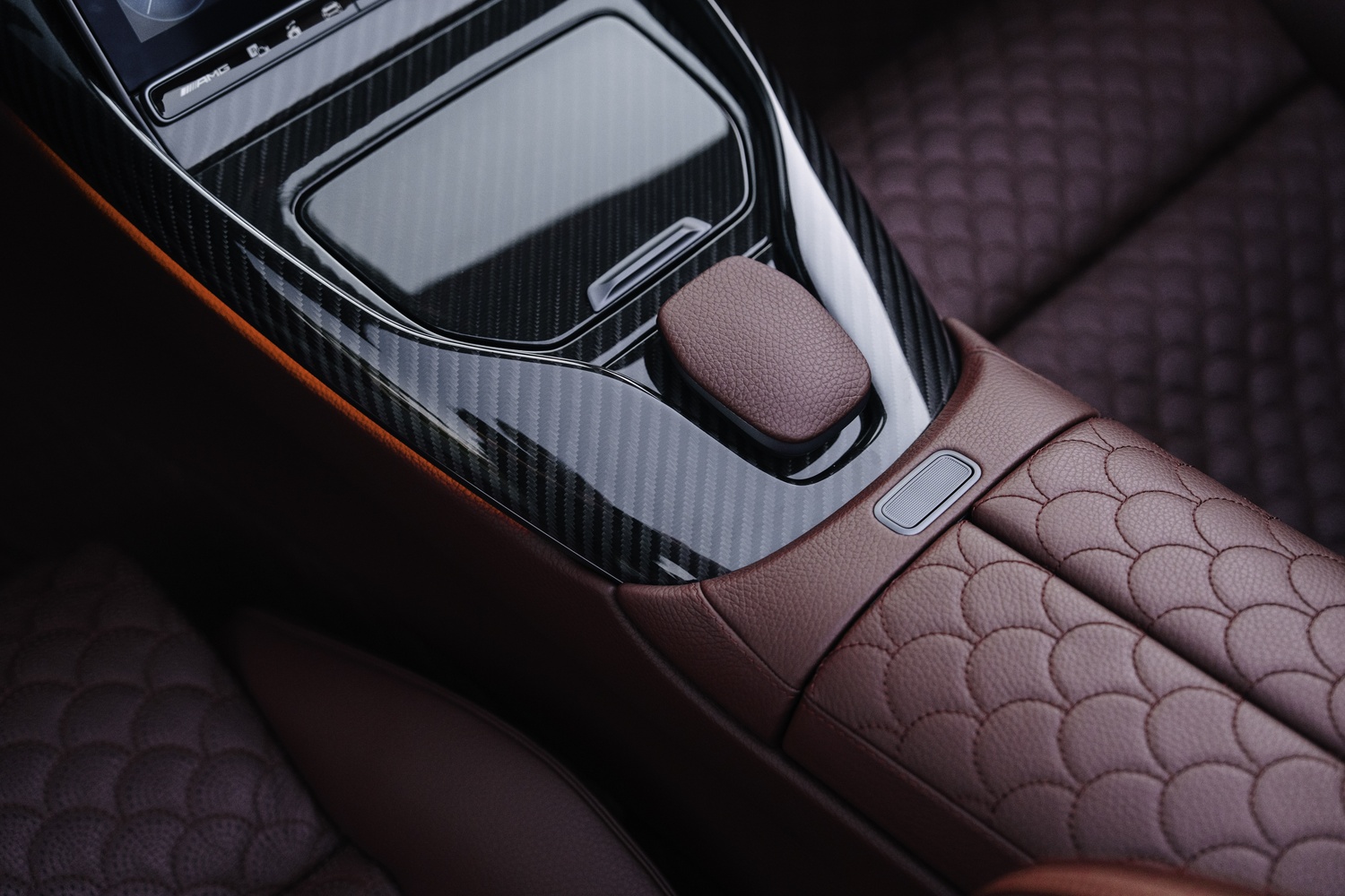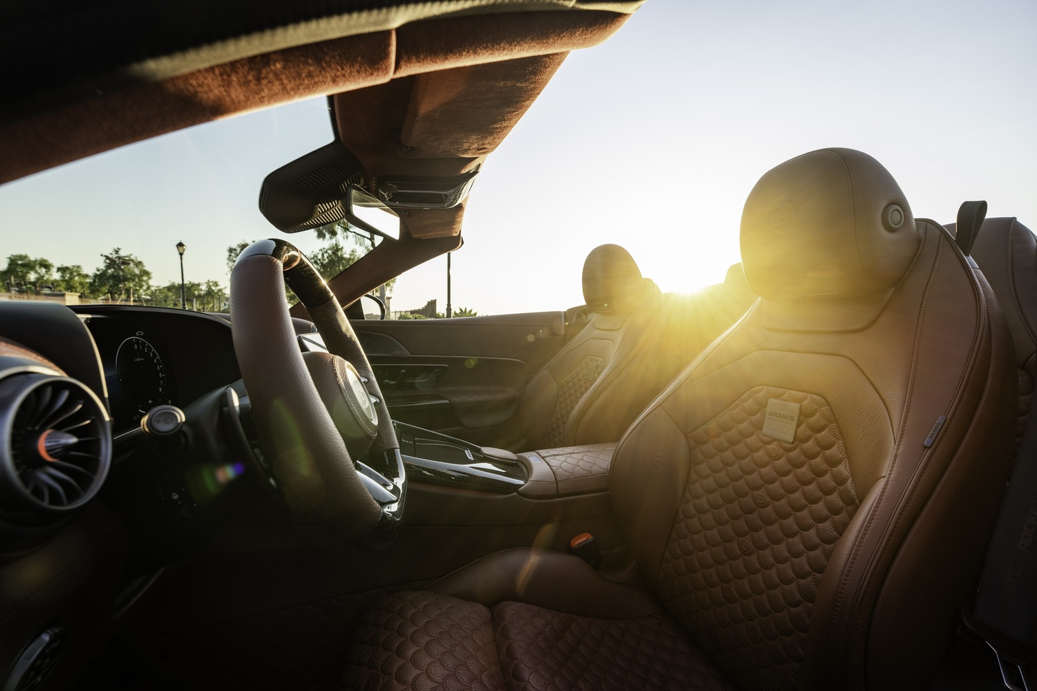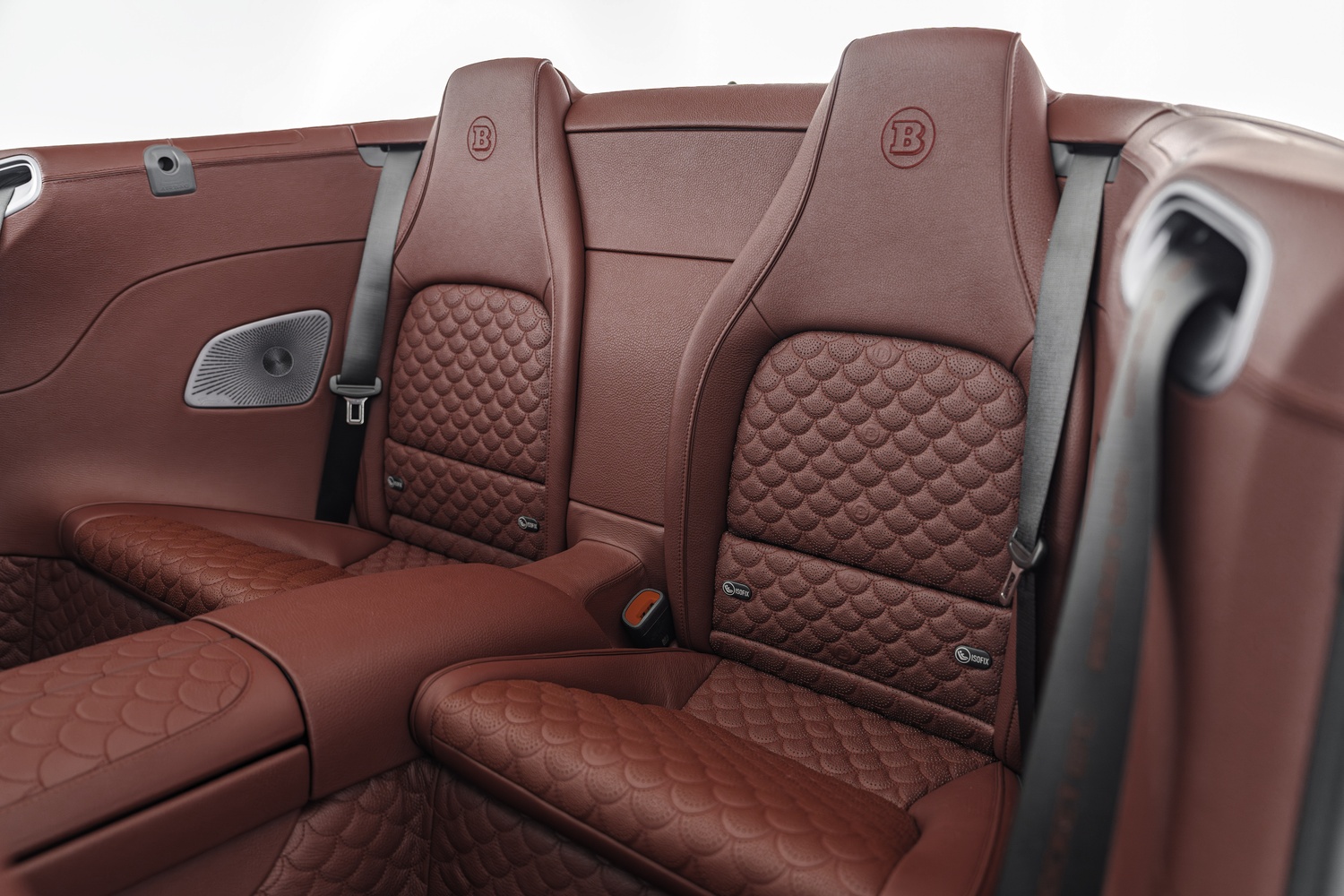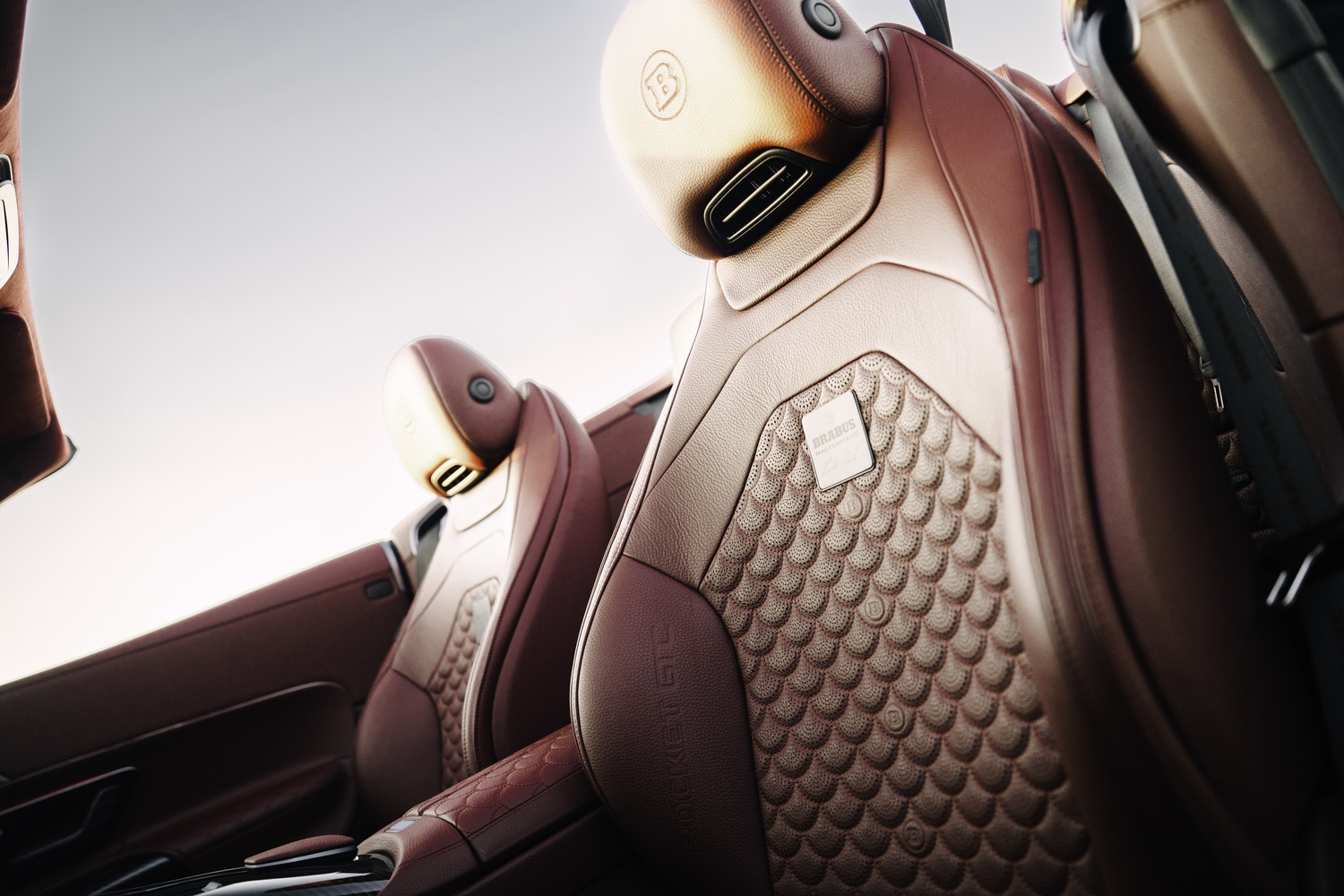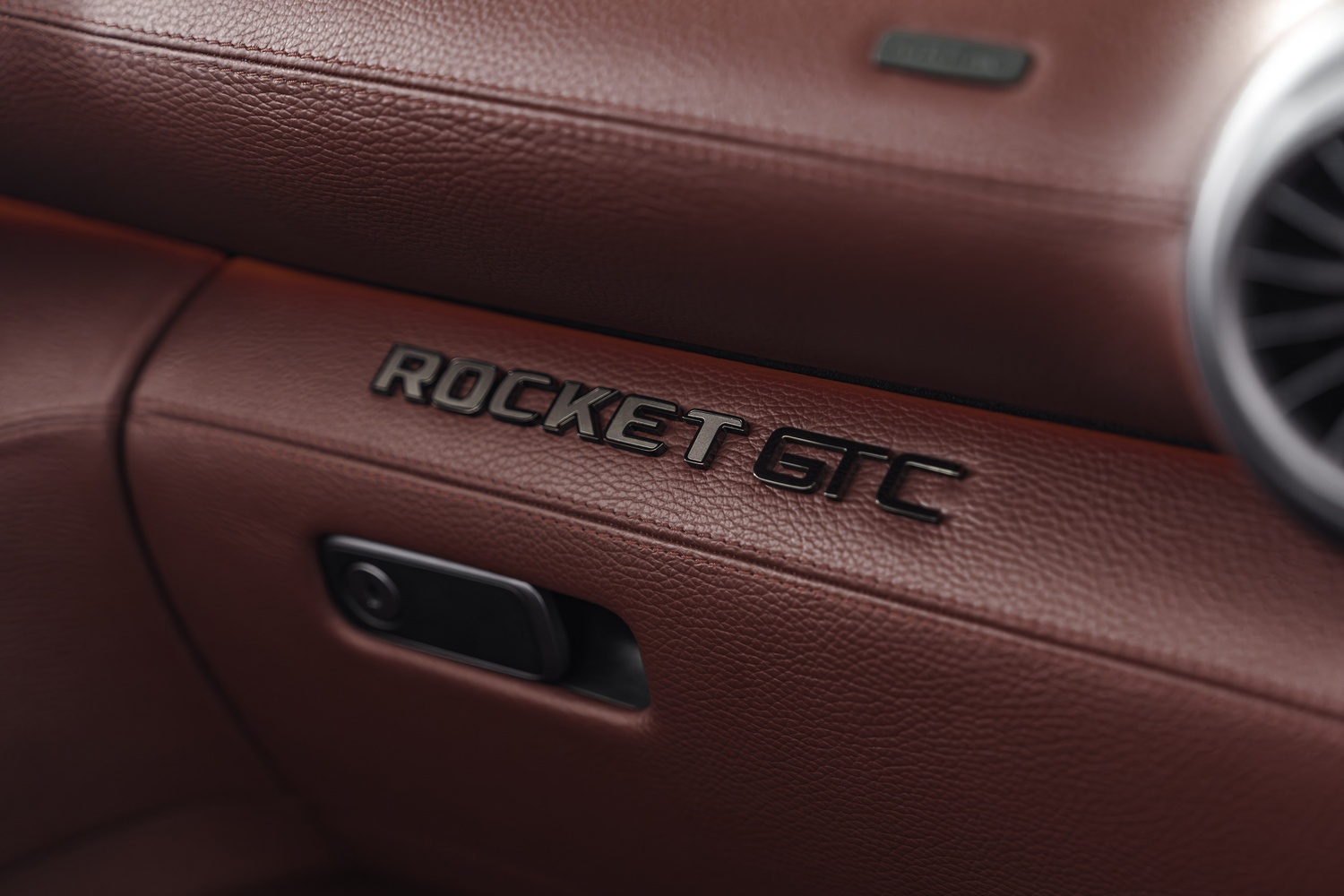 - Interiorul Masterpiece, realizat manual în atelierul propriu BRABUS, este tapițat în piele roșie, coordonată cu caroseria, cu matlasare „Scoică” pe scaune, panouri și covorașe, plus embleme „Double-B” embosate. Elementele din carbon Signature, pedalele, volanul și plăcile de praguri cu logo BRABUS iluminat contrastează sportiv cu finisajele mate „Shadow Gray” ale bordului, ventilației și difuzoarelor audio. Logourile ROCKET GTC pe bord și centurile scaunelor adaugă accente distinctive.