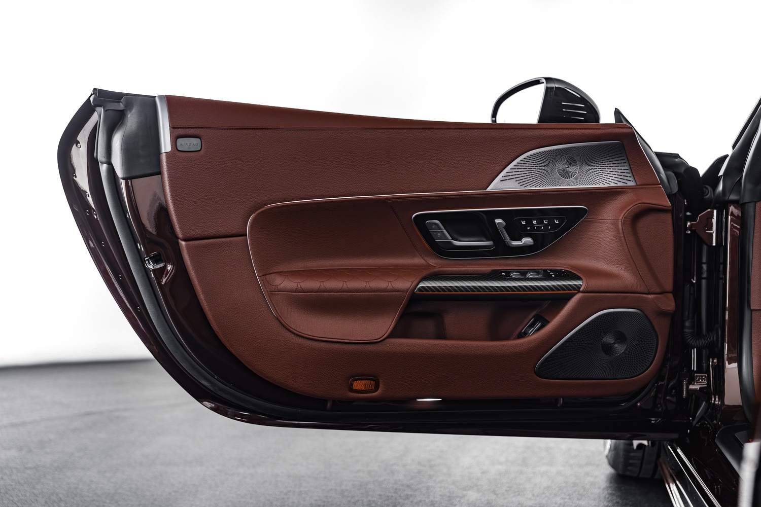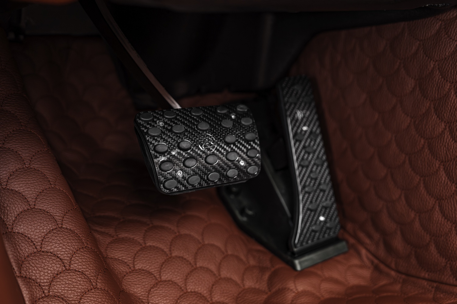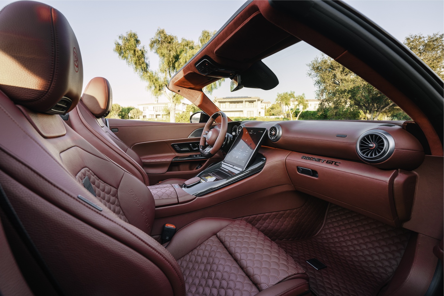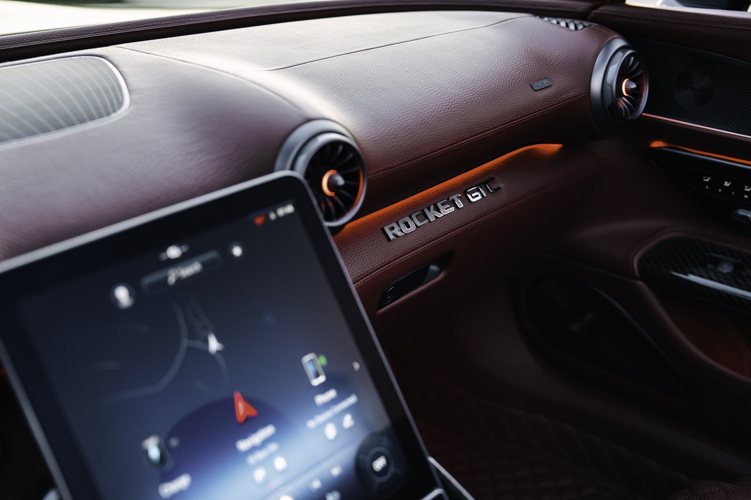 - Interiorul Masterpiece, realizat manual în atelierul propriu BRABUS, este tapițat în piele roșie, coordonată cu caroseria, cu matlasare „Scoică” pe scaune, panouri și covorașe, plus embleme „Double-B” embosate. Elementele din carbon Signature, pedalele, volanul și plăcile de praguri cu logo BRABUS iluminat contrastează sportiv cu finisajele mate „Shadow Gray” ale bordului, ventilației și difuzoarelor audio. Logourile ROCKET GTC pe bord și centurile scaunelor adaugă accente distinctive.
