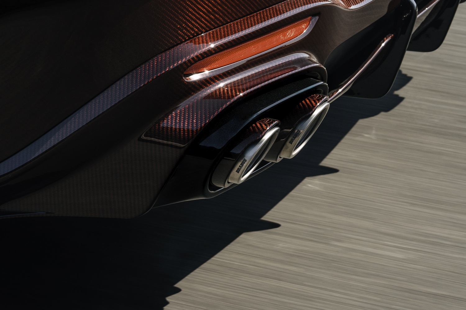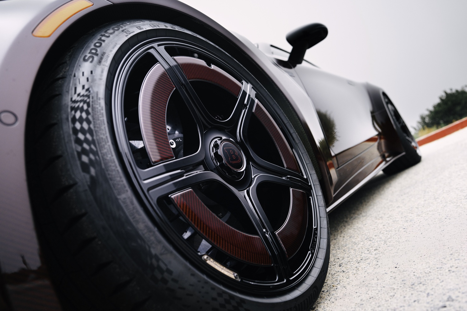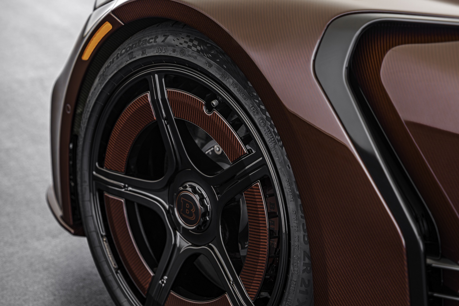- Lățimea impunătoare a supercarului (198.5 cm) este accentuată de jantele forjate BRABUS Monoblock P „PLATINUM EDITION”, cu design center-lock, care combină greutatea redusă cu o rezistență excepțională. Acestea măsoară 21/22 inchi, având integrate și niște lame aerodinamice din carbon roșu. Anvelopele sunt Conti SportContact 7 în mărimi de 275/35 ZR 21 (față) și 335/25 ZR 22 (spate).