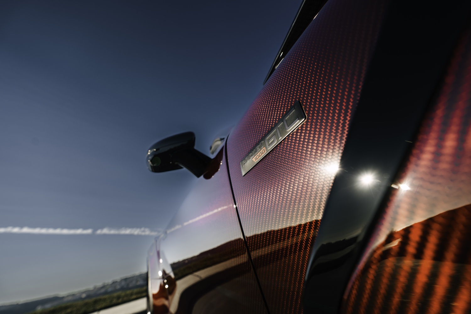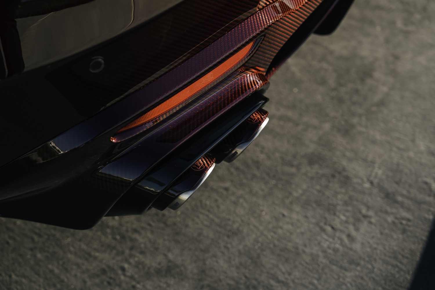 - Aerodinamica sofisticată include un splitter frontal cu spoiler integrat, prize de aer late și panouri laterale care canalizează fluxurile de aer spre un difuzor posterior cu patru țevi de eșapament din titan iluminate roșu. Spoilerul posterior tip „ducktail” și difuzorul, optimizate în tunelul aerodinamic, asigură stabilitate la viteze ridicate. Eșapamentul din oțel inoxidabil are supape active.