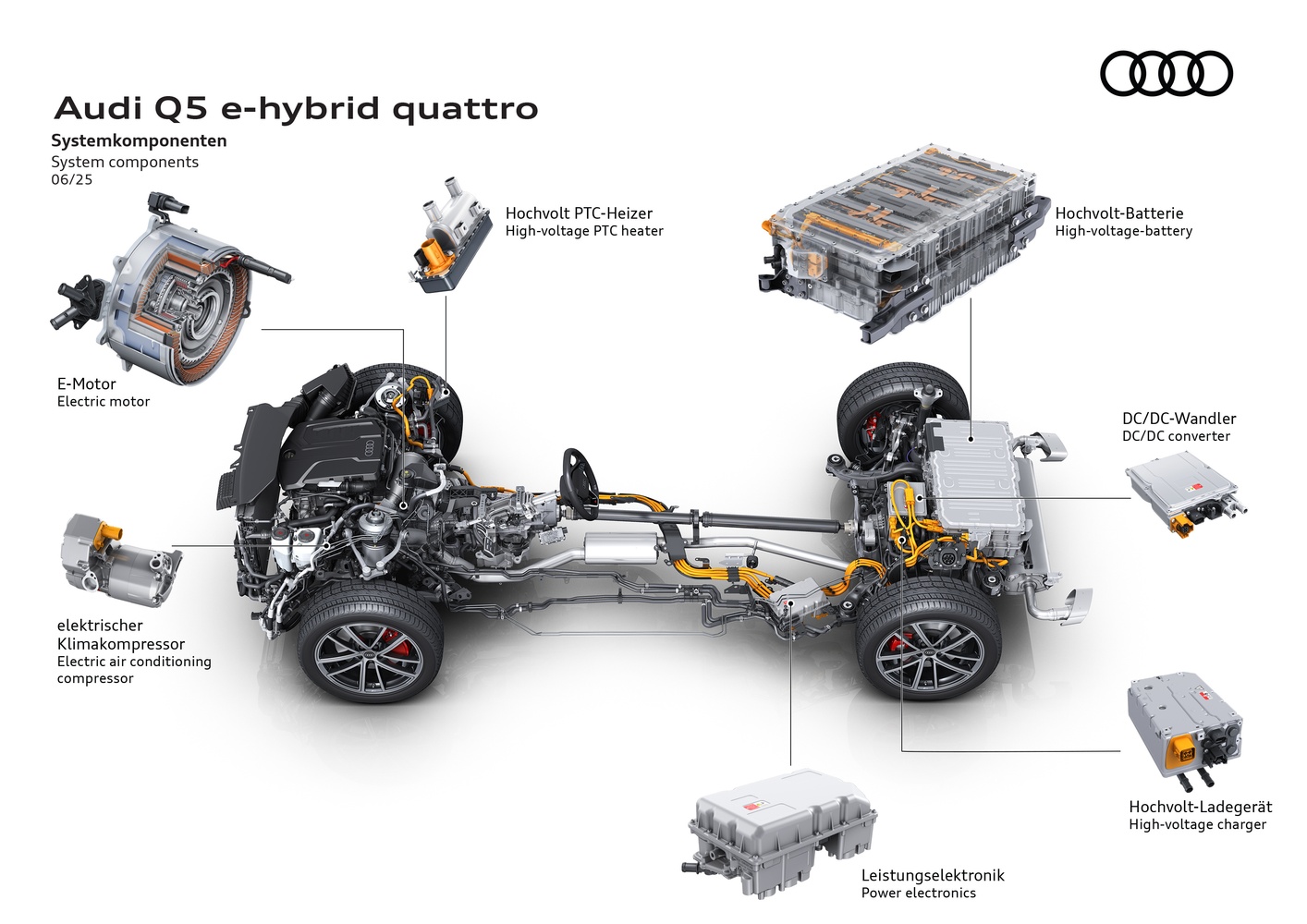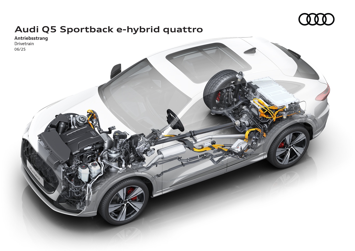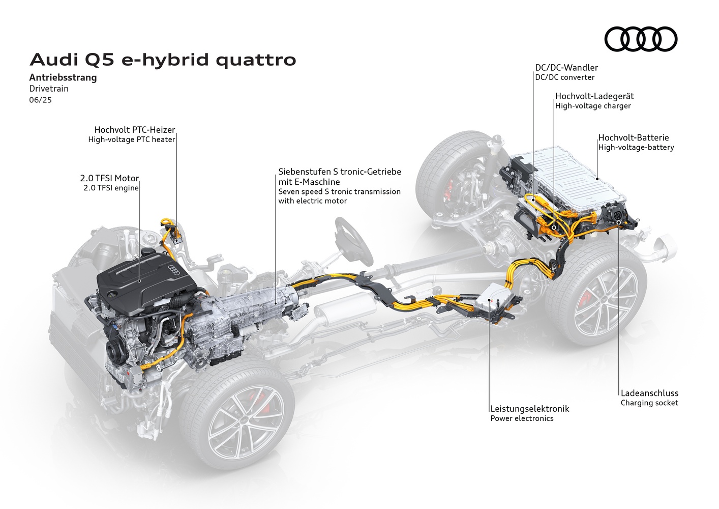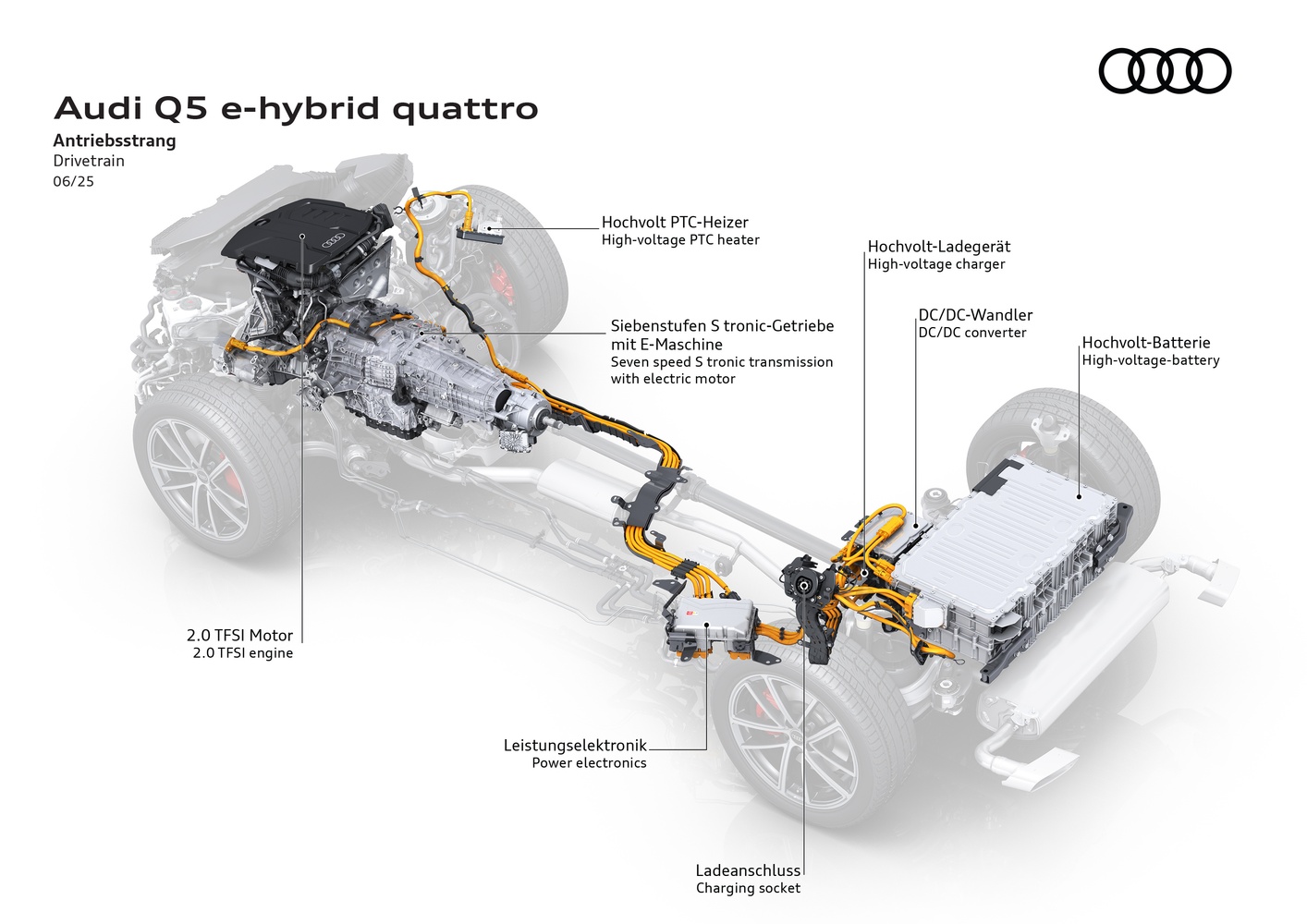 - Baterie de înaltă tensiune cu o capacitate brută de 25.9 kWh (netă 20.7 kWh), cu 45% mai mare decât pe fostul Q5 PHEV.
