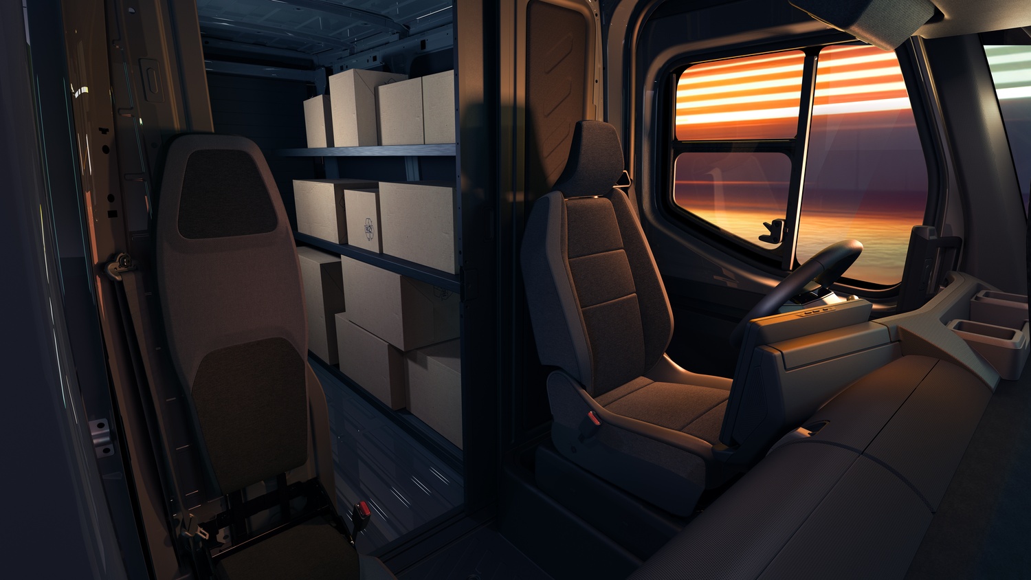 - Scaun șofer instalat pe un podium pentru vizibilitate panoramică, acces facil la zona de marfă.