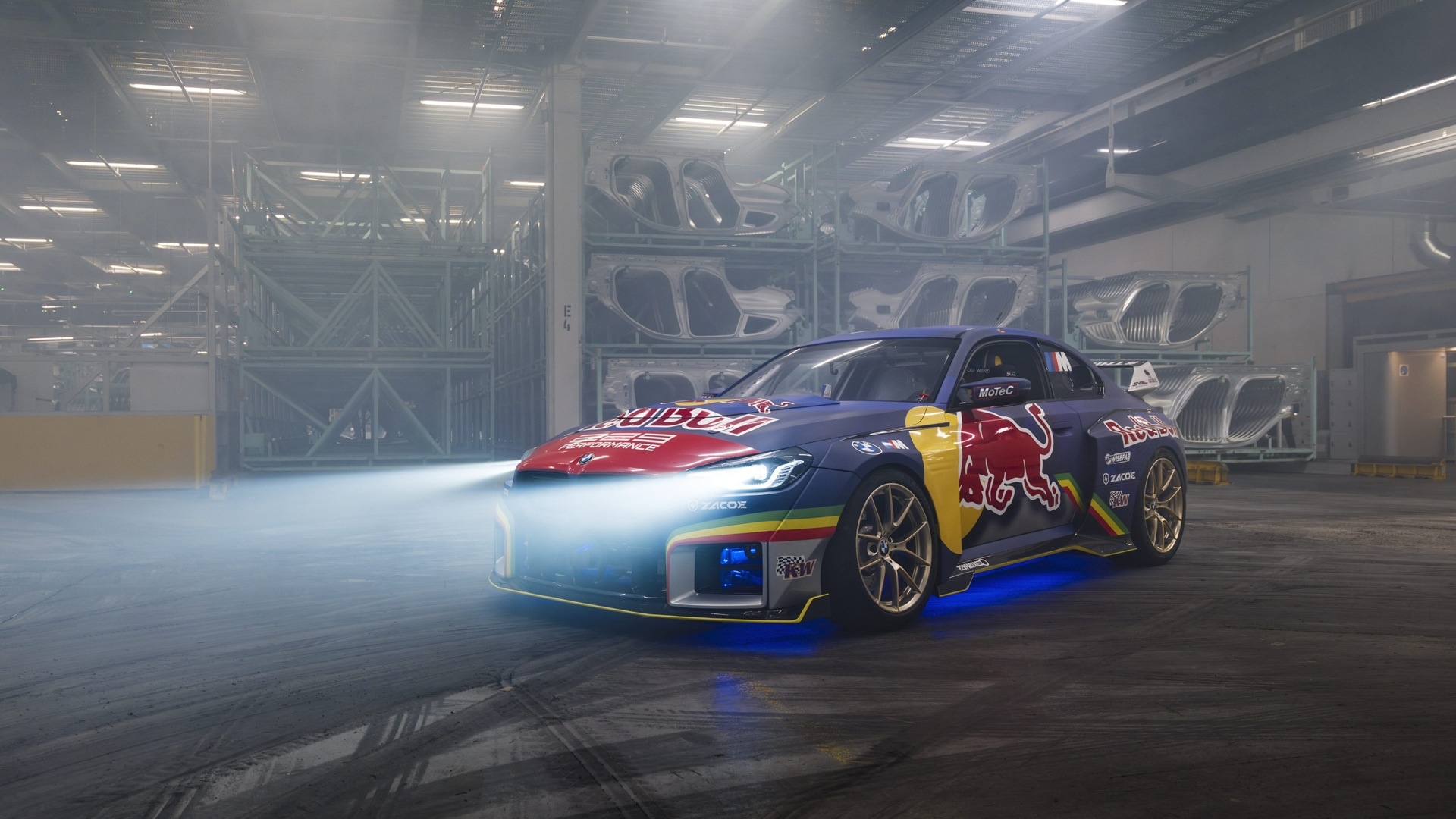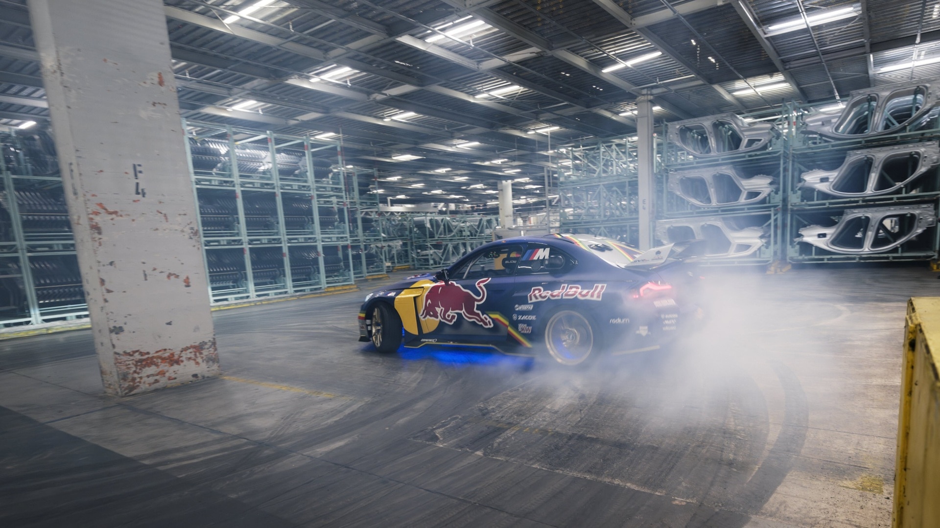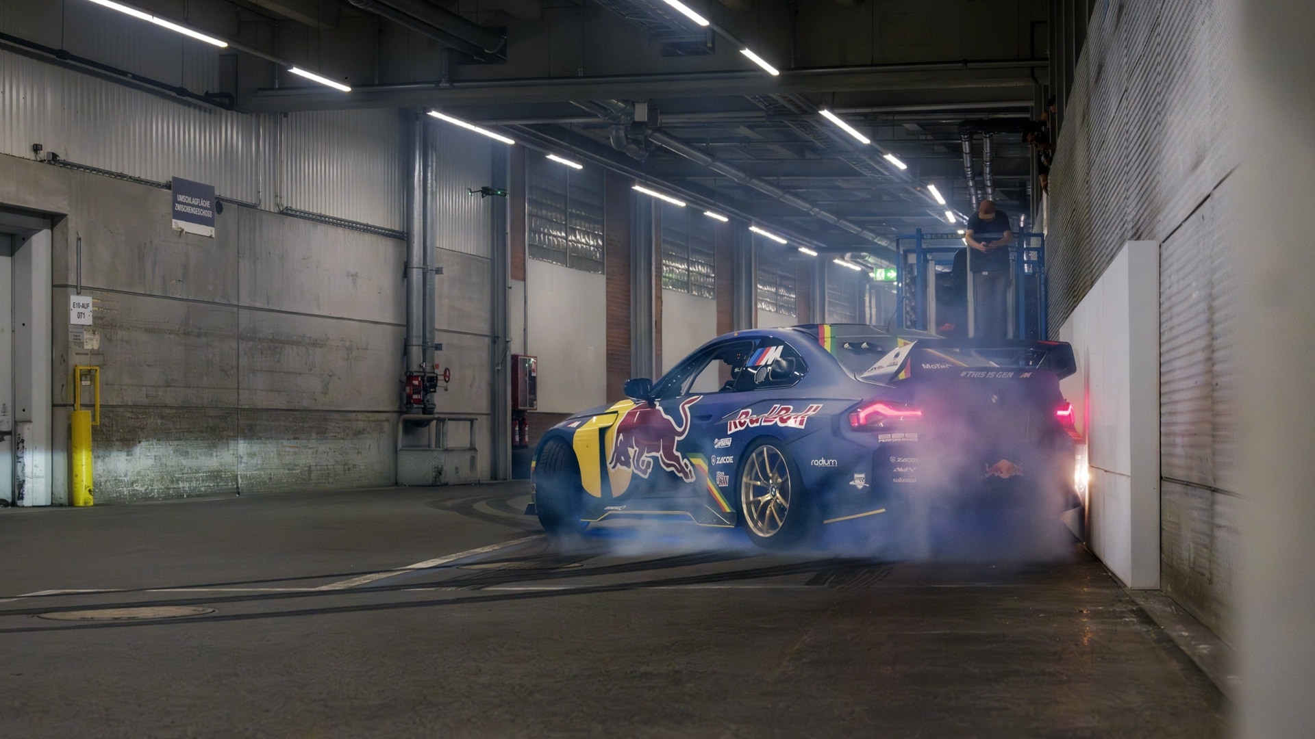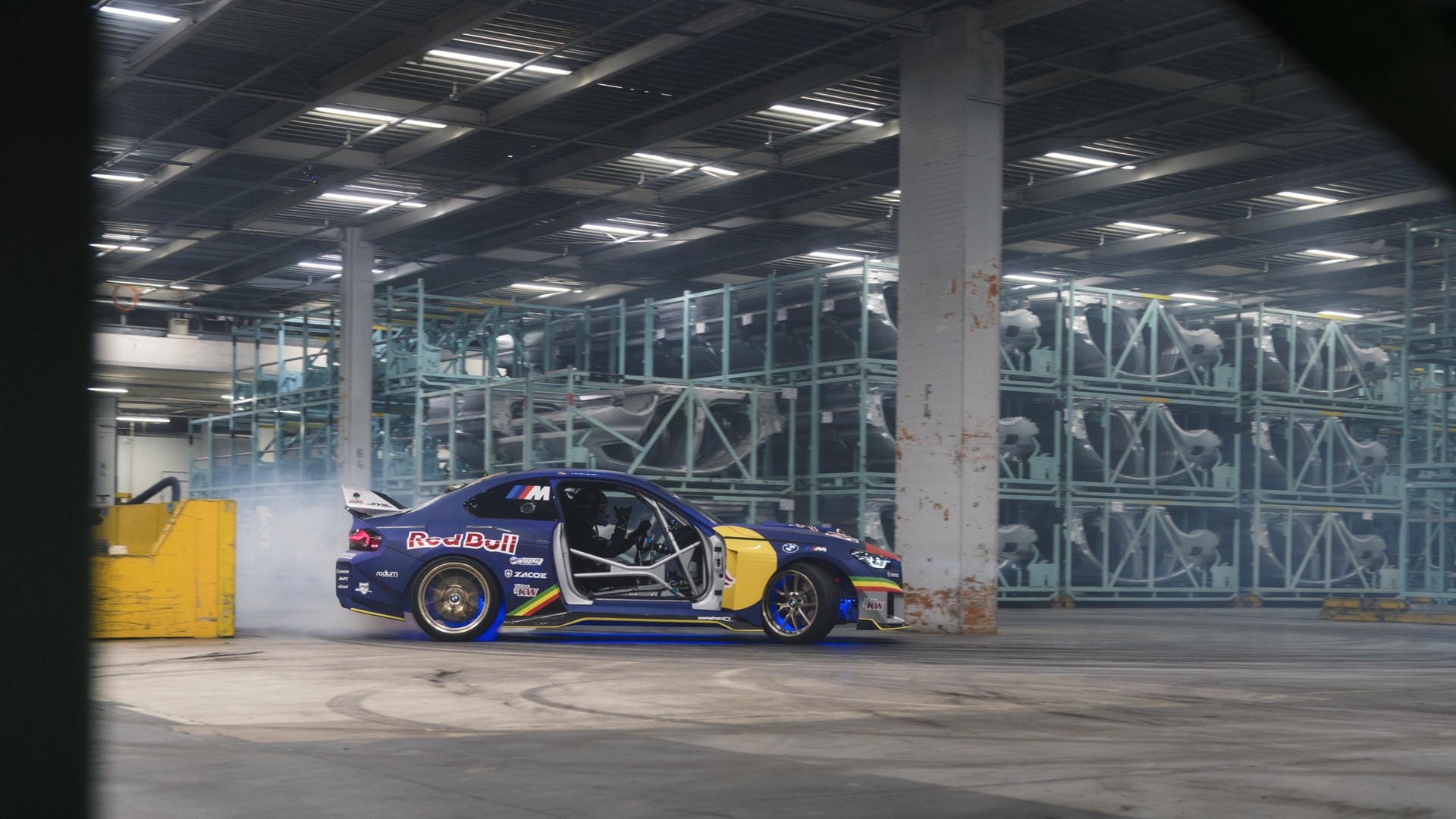 BMW M2, Drift Competition, Red Bull Driftbrothers, Elias Hountondji, fabrica BMW, 1100 CP, drifting, BMW Welt, Drift Masters, test mașină prin fabrică, derapaje prin fabrică auto,
