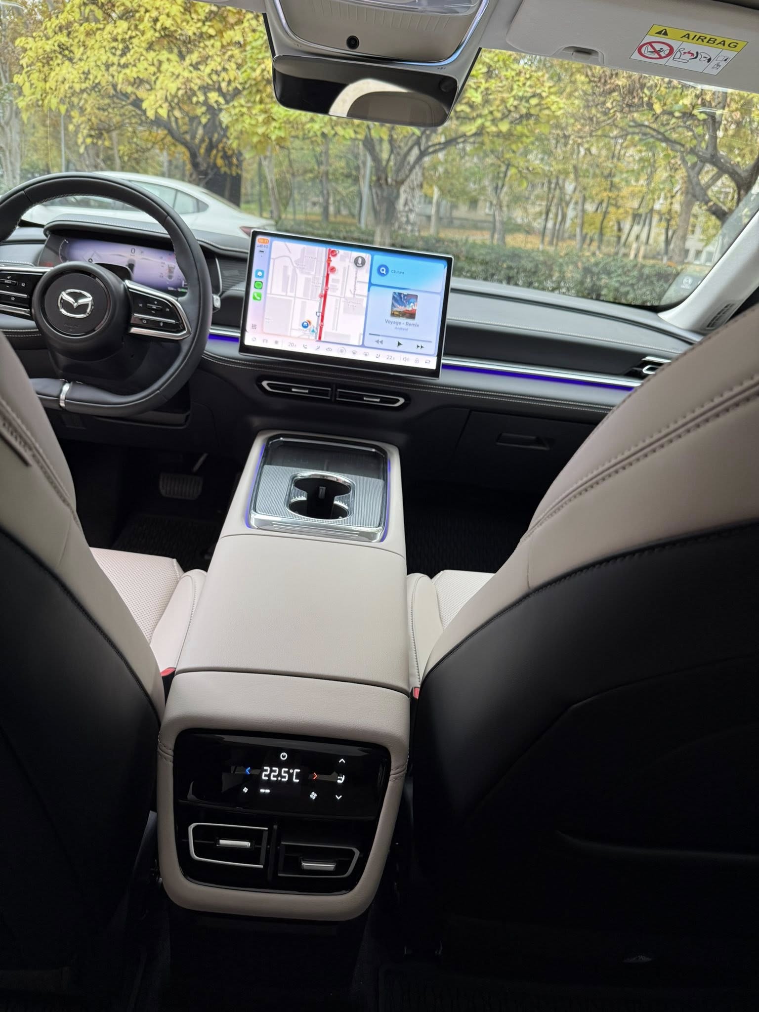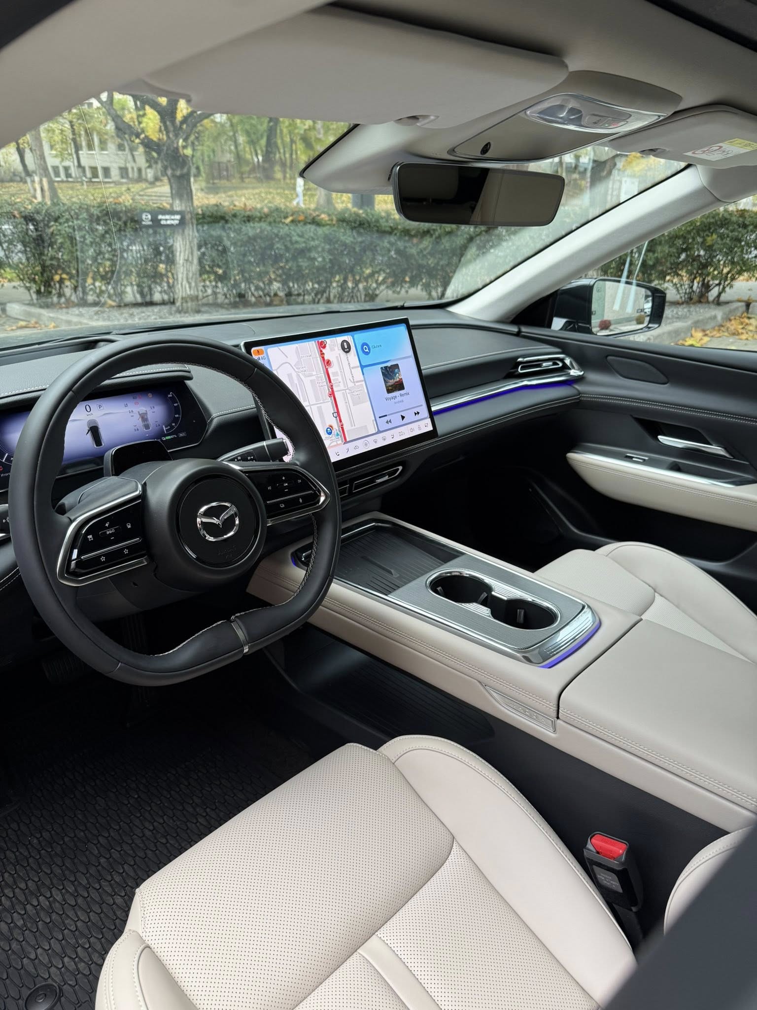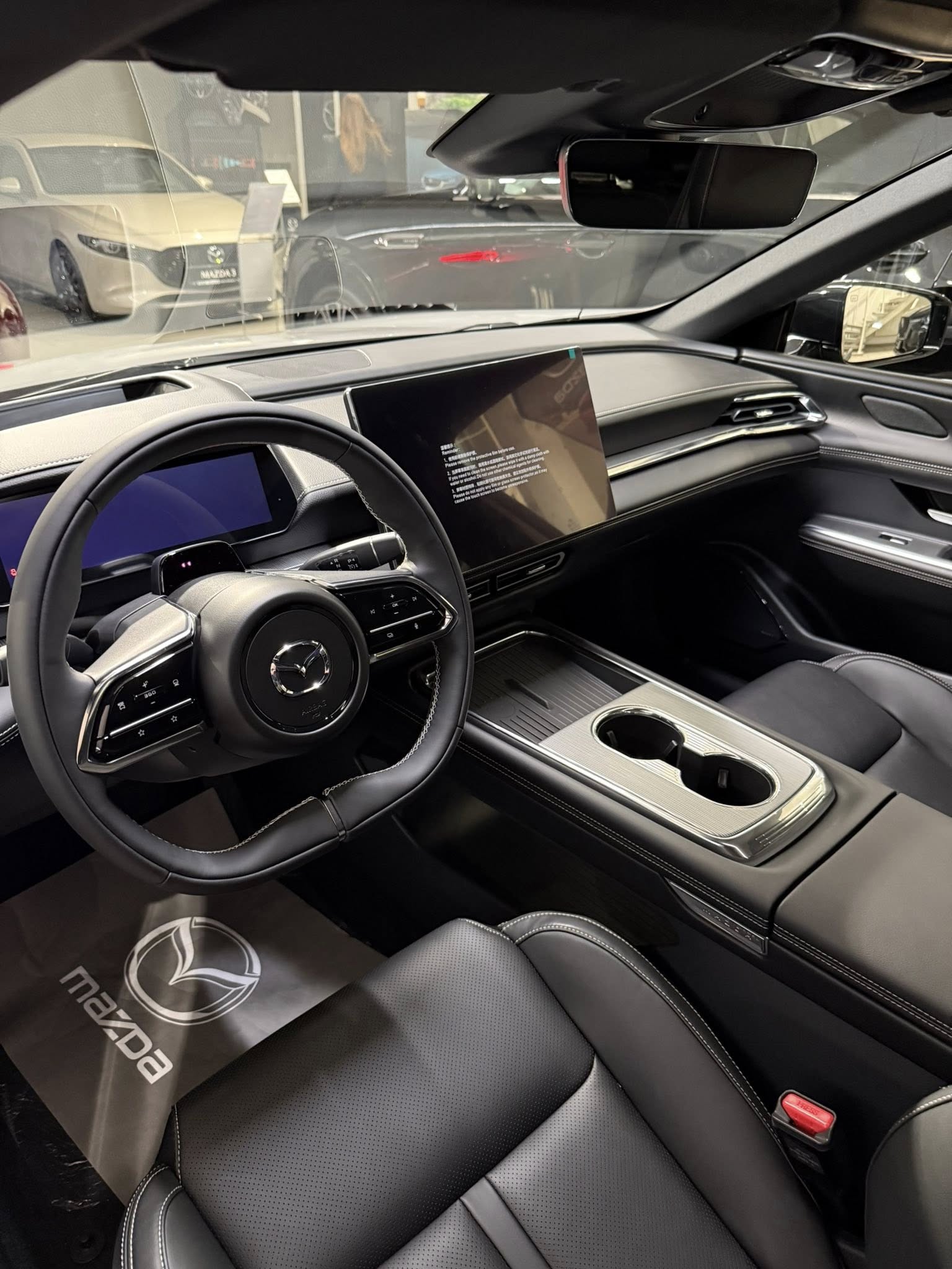 Interiorul noii Mazda6e impresionează cu un volan aplatizat, panou de bord de 10.2 inchi și un monitor central de 14.6 inchi cu comenzi vocale, Apple CarPlay/Android Auto wireless și gesturi. Head-up display-ul cu realitate augmentată proiectează informații pe 50 inchi la cam 7.5 metri distanță vizuală de mașină.