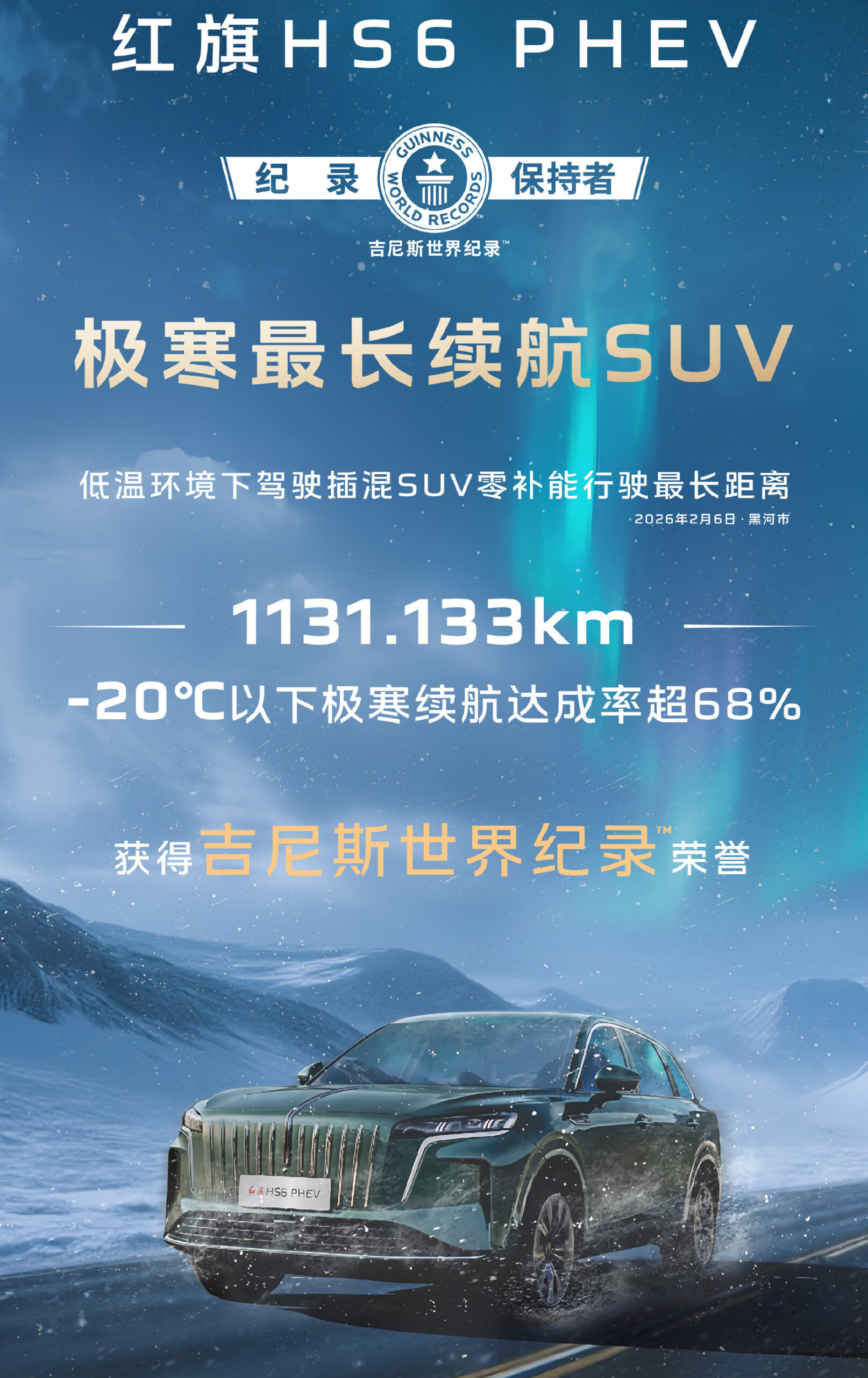 Hongqi HS6, modelul plug-in hybrid chinezesc lansat în septembrie 2025, a intrat din nou în Cartea Recordurilor Guinness. După ce în noiembrie 2025 a parcurs peste 2300 de km fără nicio alimentare sau încărcare, acum a reușit o performanță impresionantă și în condiții extreme de iarnă.