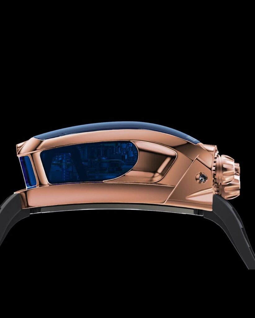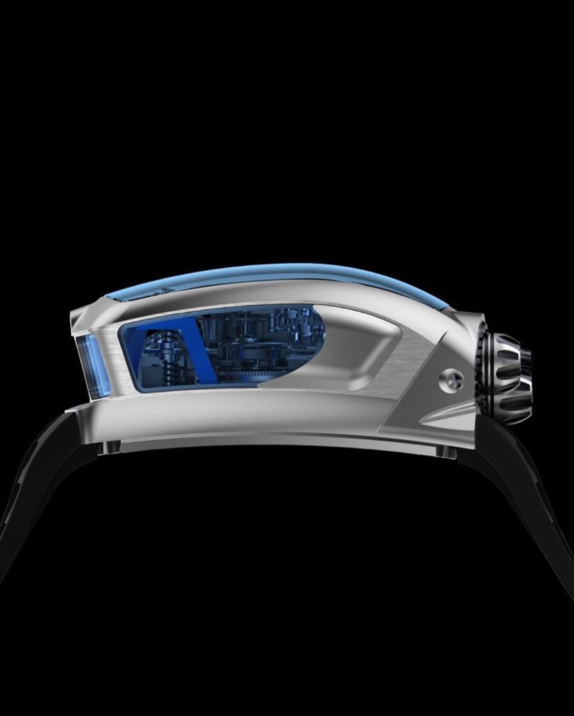 Carcasa ceasului este făcută din titan, iar catarama curelei de cauciuc este confecționată din același metal, ceea ce înseamnă că nu se va descheia nici măcar la viteze de peste 400 km/h 🙂
