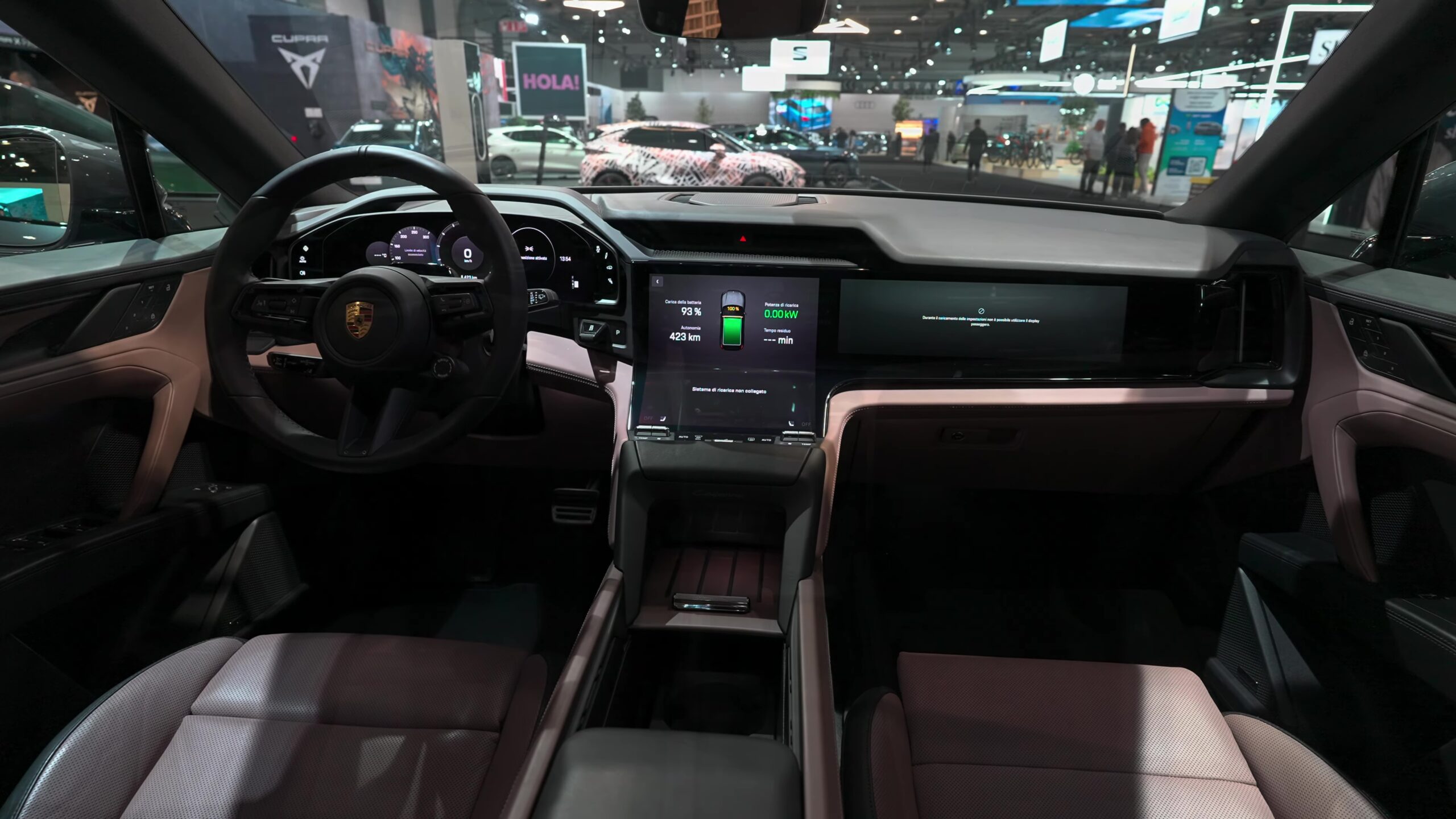 Interiorul este tipic Porsche – volan sportiv plăcut, bord curbat cu trei ecrane (inclusiv un monitor dedicat pasagerului dreapta care poate afișa viteza și navigația), head-up display cu realitate augmentată și tunel central tapițat cu piele. Spațiile de depozitare sunt generoase, iar materialele sunt impecabile.