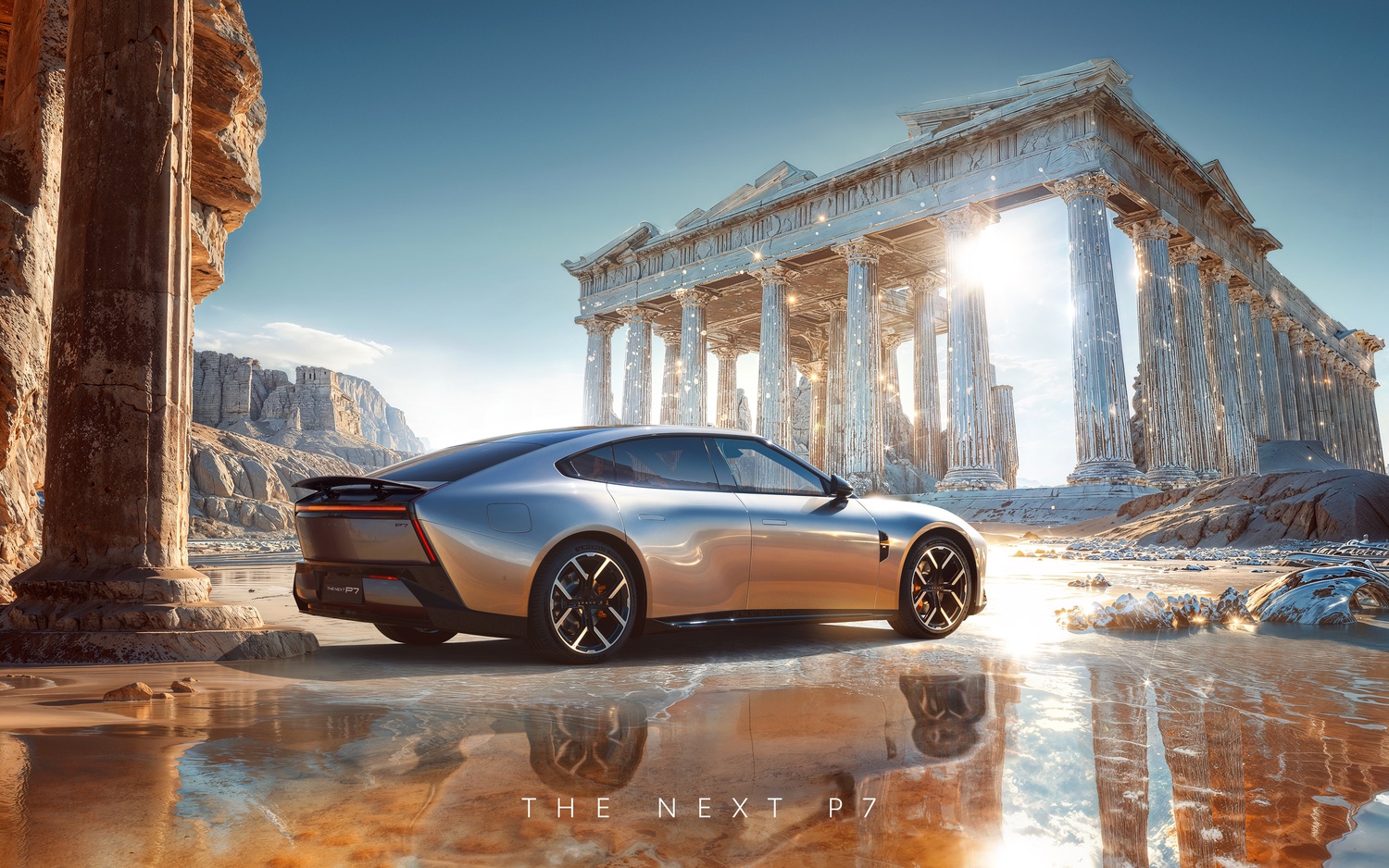 Teaserul și imaginile oficiale dezvăluie faruri integrate într-o bandă subțire și un mono-stop cu o semnătură luminoasă revizuită, completate de secțiuni LED suplimentare. Noul P7 împarte elemente de stil cu P7+, lansat în 2024, dar adaugă detalii aerodinamice, precum un acoperiș de sticlă vizual conectat cu luneta și jante de mari dimensiuni.