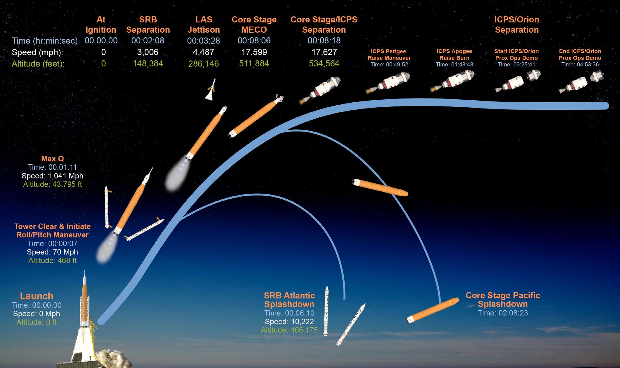 După lansare, racheta SLS (Space Launch System) va plasa nava Orion pe o orbită eliptică în jurul Pământului. Orion și etajul superior ICPS (Interim Cryogenic Propulsion Stage) vor orbita Pământul de două ori pentru a verifica toate sistemele în timp ce sunt încă aproape de casă.