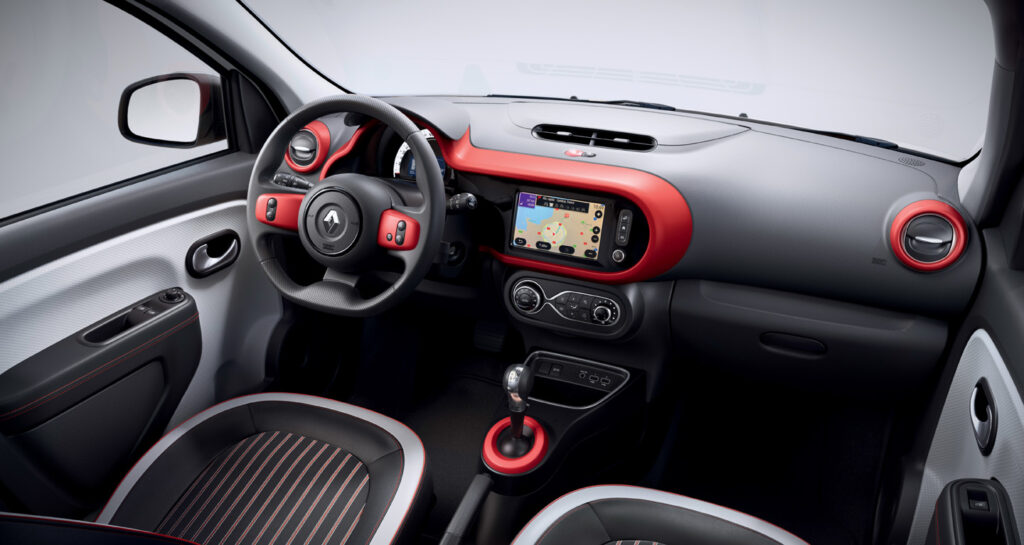 - Panoul de bord pe acest model conţine indicatori specifici mașinilor electrice. Din echipare ZEN, în centrul planşei de bord va fi incorporat un ecran HD tactil de 7 inci pe care va putea fi operat sistemul multimedia Renault EASY LINK cu toate serviciile sale conectate Renault EASY CONNECT (inclusiv suport navigaţie, Apple CarPlay, Android Auto, căutare pe Google, etc). Toate aceste servicii pot fi accesate şi prin intermediul unei aplicaţii mobile – MY Renault – completată acum cu mai multe caracteristici specifice pentru Twingo Z.E.