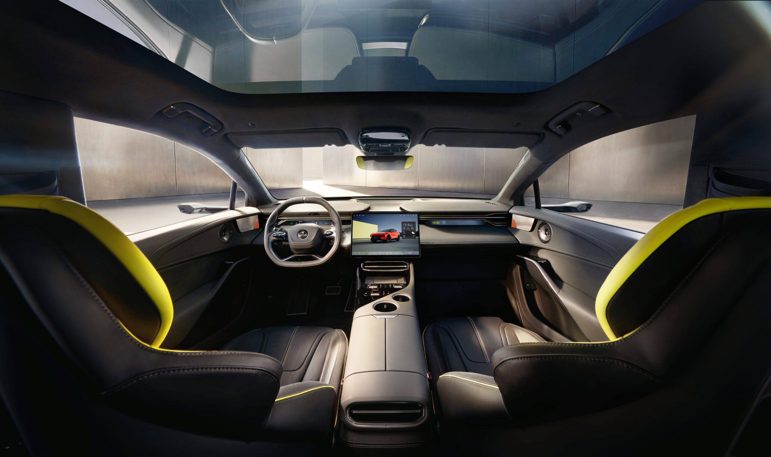 Tabloul de bord este dominat de un instrumentar digital subțire, completat de un head-up display generos. Volanul cu patru spițe și formă non-circulară include un marcaj central superior pentru poziționare, iar consola centrală etajată integrează un ecran tactil flotant și o iluminare ambientală multicoloră.
